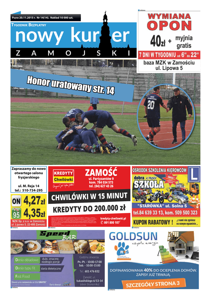 reklama Piątek 20.11.2015 r. Nr 14(14). Nakład 10 000 szt. Tygodnik Bezpłatny Honor ura towany st r. 14 Zapraszamy do nowo otwartego salonu fryzjerskiego ul. M. Reja 14 tel.: 510-734-295 reklama reklama reklama reklama reklama 2 www.kurierzamojski.pl DLACZEGO POWINNIŚMY GOTOWAĆ… ŚWIADOMIE SPOSOBY NA POPRAWĘ NASTROJU Sposoby na poprawę nastroju 1. Światło. Wyjdź na spacer, najlepiej rano, gdy jeszcze masz szansę złapać promienie słoneczne. Jeżeli nie masz takiej możliwości albo chęci – super. Masz doskonałą wymówkę, by pójść do solarium. Wieczorami zapal nastrojowe świece, rozpal w kominku. 2. Jedz więcej produktów bogatych w magnez: ciemne kakao i czekolada, pestki dyni, słonecznik, sezam, migdały i orzechy, warzywa strączkowe, żółty ser. Jednym słowem wcinanie czekolady z orzechami to łakomstwo usprawiedliwione. 3. Bądź jak dziecko. Rób to, co uwielbiasz i czerp z tego radość. Gotowanie, śpiewanie, robienie głupich min, kreatywne spędzanie wolnego czasu. 4. Zabawy, które pamiętasz z dzieciństwa. Graj w karty, grę planszową, bierki, narysuj abstrakcyjny obrazek. Wszystko to skutecznie poprawia humor. 5. Popraw sobie nastrój przyjemnym zapachem. W sklepach poczujesz zapach świeżo pieczonego pieczywa, w galeriach handlowych zapachy kojarzące się ze świętami Bożego Narodzenia. Wszystko po to, by wprawić cię w dobry humor i skłonić do wydawania pieniędzy. Wykorzystaj to wprowadzając się w lepszy nastrój w domowym zaciszu. Zapach pomarańczy, lawendy, pieczonego ciasta, przypraw korzennych. Zdecyduj, co lubisz i roztaczaj w mieszkaniu „zapachowe poprawiacze humoru”. 6. Rozmowa z przyjacielem. Jednym słowem świetna wymówka dla kobiet, by gadać godzinami przez telefon, a dla panów, by pójść na piwo i w męskim towarzystwie obejrzeć mecz. 7. Zmęcz się fizycznie tak, jak lubisz. Spacer, taniec, rolki czy bliskość z partnerem. Wybierz, co lubisz i działaj po to, by poczuć się lepiej. 8. Włącz muzykę. Badania wykazały, że słuchanie muzyki poprawia samopoczucie. Możesz połączyć opisane rady. Świece, nastrojowa muzyka i taniec z partnerem sprawią, że poczujecie się jak na pierwszej randce. Endorfiny podskoczą ekspresowo, podobnie jak temperatura w związku. 9. Zanurz się w miłych wspomnieniach. Oglądaj filmy i zdjęcia, które uwieczniają przyjemne chwile. Możesz to zrobić samotnie, ale w grupie znajomych pozytywne emocje będą jeszcze silniejsze. 10. Masz domowe zwierzątko? Świetnie! Głaskanie zwierząt obniża ciśnienie krwi i zmniejsza stres, a co za tym idzie, pozytywnie wpływa na samopoczucie. 11. Masaż sprawia, że ilość endorfin w organizmie wzrasta. Możesz wybrać się do specjalisty. Możesz też poprosić domowników o pomoc. Ty serwujesz pyszny obiad – oni kilka minut masażu. 12. „Śmiech to zdrowie”, wie o tym każdy z nas. Inne powiedzenie to „Lepiej żartować, niż chorować” i coś w tym jest. Czytaj komiksy, obejrzyj komedię, wejdź na YouTube, by oglądać śmieszne filmiki lub kabarety. 13. Wycisz się. Medytacja, modlitwa, 15 minut tylko dla siebie. Wybierz sposób, który zapewni ci uspokojenie gonitwy myśli. Przestaniesz się nakręcać i na to całe zamieszanie w świecie zewnętrznym spojrzysz z dystansem. 14. Dziękuj. Za to że żyjesz, za to że masz siłę wstać z łóżka, za to że masz z kim porozmawiać i tak dalej. Im bardziej skupiasz się na pozytywach w życiu, tym więcej pozytywów dostrzegasz a od tego już krok do lepszego nastroju. 15. Zdrowo się odżywiaj. Niby banał, ale to co jemy wpływa na cały nasz organizm, również na nastrój. Połącz kilka sposobów i wyjdź rano po zakupy - łapanie światła słonecznego, aktywność fizyczną, produkty na zdrowy posiłek. 16. Zrób sobie SPA w domowym zaciszu. Ciepła relaksująca kąpiel z dodatkiem pachnącego płynu do kąpieli albo olejku zapachowego, na podłodze świece, w tle nastrojowa muzyka – i już czujesz się jak bogini. 17. Przytulaj się! Do partnera, do dzieci, psa, kota, pluszaka, a nawet do drzewa. Każdy argument jest dobry w walce o lepsze samopoczucie. 18. Wcinaj produkty, które dają przyjemne poczucie sytości – ziemniaki, dania z makaronu, gęste ciepłe zupy. Na podwieczorek jedz kolorowe i pachnące pomarańcze, mandarynki lub grejpfruty. 19. Ubieraj się kolorowo. Za oknem jest wystarczająco szaro i smutno. Załóż żółty szalik, pomarańczową torebkę, soczyście zielone rękawiczki, śmieszną kolorową czapkę. b. g. Czy zastanawialiście się kiedyś skąd nagle w ostatnich czasach tyle różnych chorób? Skąd ten rak, skąd tyle w nas stresu, który powoduje mnóstwo, jeśli nie większość, schorzeń, otyłość, cukrzycę, choroby serca? Zastanawialiście się??? Ja się niejednokrotnie zastanawiałam. Ostatnio wpadła mi w ręce maleńka książeczka Beaty Pawlikowskiej „Na zdrowie”, która też zainteresowała się tym tematem i to na poważnie (dogłębnie zbadała temat). Okazuje się, że najwięcej zła czyni współczesna żywność. I to nie tylko dla ciała, ale także umysłu!!! ZAJRZYJCIE NA ETYKIETY I SPRAWDŹCIE, CO JECIE. Ja od niedawna sprawdzam i coraz bardziej jestem w szoku! Wiecie, że w większości produktów zamkniętych w słoikach, puszkach, tubkach, w jogurtach (najbardziej w tych dietetycznych), w słodyczach (zwłaszcza tych fit), w sokach, w chlebie, praktycznie we wszystkim jest chemia! Pawlikowska mówi, że NAJBARDZIEJ NIEBEZPIECZNE DLA ZDROWIA są takie dodatki, jak: - ASPARTAM, -MALTODEKSTRYNA, -SYROP GLUKOZOWO-FRUKTOZOWY, -GLUTAMINIAN SODU, - KWAS CYTRYNOWY. To tylko kilka, z tych które dodają producenci do żywności i których należy unikać, jak ognia jeśli oczywiście chcesz zdrowo odżywiać siebie i rodzinę. Zawsze lubiłam gotować, robić sałatki, deserki, ale nigdy nie zwracałam uwagi na skład produktów, które dodaję do tychże potraw. Teraz już wiem, czego unikać, a co da
