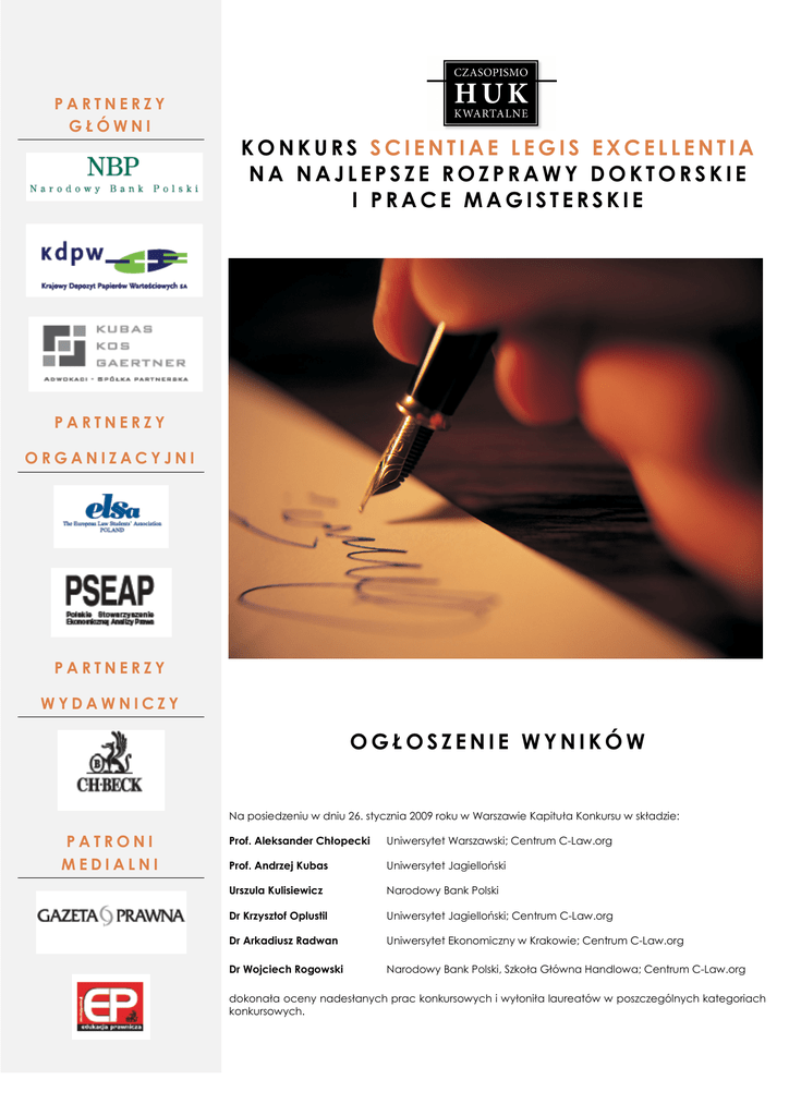 PARTNERZY GŁÓWNI KONKURS SCIENTIAE LEGIS EXCELLENTIA NA NAJLEPSZE ROZPRAWY DOKTORSKIE I PRACE MAGISTERSKIE PARTNERZY ORGANIZACYJNI PARTNERZY WYDAWNICZY OGŁOSZENIE WYNIKÓW Na posiedzeniu w dniu 26. stycznia 2009 roku w Warszawie Kapituła Konkursu w składzie: PATRONI MEDIALNI Prof. Aleksander Chłopecki Uniwersytet Warszawski; Centrum C-Law.org Prof. Andrzej Kubas Uniwersytet Jagielloński Urszula Kulisiewicz Narodowy Bank Polski Dr Krzysztof Oplustil Uniwersytet Jagielloński; Centrum C-Law.org Dr Arkadiusz Radwan Uniwersytet Ekonomiczny w Krakowie; Centrum C-Law.org Dr Wojciech Rogowski Narodowy Bank Polski, Szkoła Główna Handlowa; Centrum C-Law.org dokonała oceny nadesłanych prac konkursowych i wyłoniła laureatów w poszczególnych kategoriach konkursowych. Konkurs Scientiae Legis Excellentia na najlepsze rozprawy doktorskie i prace magisterskie W kategorii o nagrodę Narodowego Banku Polskiego zapadły następujące rozstrzygnięcia: ROZPRAWY DOKTORSKIE Pierwsze miejsce przyznano: dr. Janowi Byrskiemu za pracę zatytułowaną „Tajemnica prawnie chroniona w działalności bankowej”, obronioną na Wydziale Prawa i Administracji Uniwersytetu Jagiellońskiego, napisaną pod kierunkiem prof. dr hab. Wojciecha Pyzioła. Autor zwycięskiej pracy otrzyma nagrodę główną w wysokości 5 tys. złotych ufundowaną przez Narodowy Bank Polski. Drugie miejsce przyznano: KATEGORIA NBP § Prace z prawa gospodarczego (w szczególności prawa spółek, prawa bakowego, prawa upadłościowego i prawa umów gospodarczych) napisane z wykorzystaniem ekonomicznej dr Magdalenie Konopackiej za pracę zatytułowaną „Zasady europejskiego prawa umów”, obronioną na Wydziale Prawa i Administracji Uniwersytetu Gdańskiego, napisaną pod kierunkiem prof. dr. hab. Zdzisława Brodeckiego. analizy prawa empirycznych - i o badan Nagrodę Narodowego Banku Polskiego. Trzecie miejsce przyznano: dr. Michałowi Wyrwińskiemu za pracę zatytułowaną „Ochrona wierzycieli w przypadku podziału spółki handlowej”, obronioną na Wydziale Prawa i Administracji Uniwersytetu Jagiellońskiego, napisaną pod kierunkiem prof. dr. hab. Jerzego Pisulińskiego. Autorom prac sklasyfikowanych na miejscach drugim i trzecim przyznane zostały cenne nagrody rzeczowe ufundowane przez Wydawnictwo C.H. Beck. PRACE MAGISTERSKIE Pierwsze miejsce przyznano ex aequo: mgr. Jakubowi Bonowiczowi za pracę zatytułowaną „Charakterystyka prawa z patentu”, obronioną na Wydziale Prawa i Administracji Uniwersytetu Łódzkiego, napisaną pod kierunkiem dr. Zbigniewa Wasiaka. mgr Magdalenie Szyszce za prace zatytułowaną „Złota akcja w ujęciu prawno-ekonomicznym”, obronioną na Wydziale Zarządzania Uniwersytetu Warszawskiego, napisaną pod kierunkiem prof. dr. hab. Grzegorza Domańskiego. Autorzy zwycięskich prac podzielą między siebie nagrodę główną w wys. 3 tys. złotych ufundowaną przez Narodowy Bank Polski oraz cenne nagrody rzeczowe ufundowane przez Wydawnictwo C.H. Beck. Drugie miejsce nie zostało przyznane. Trzecie miejsce przyznano: mgr. Bartoszowi Groele - za pracę magisterską zatytułowaną „Wpływ zabezpieczeń rzeczowych na oddalenie wniosku o ogłoszenie postępowania upadłościowego albo umorzenie postępowania upadłościowego ze względu na ubóstwo masy”, obronioną na Wydziale Prawa i Administracji Uniwersytetu Jagiellońskiego, napisaną pod kierunkiem dr. Marcina Spyry. Autor pracy sklasyfikowanej na miejscu trzecim, otrzyma cenne nagrody rzeczowe ufundowane przez Wydawnictwo C.H. Beck. Ponadto, w dowód uznania dla wysokiego poziomu nadesłanych prac przyznano następujące wyróżnienia: mgr Elżbiecie Jezienickiej za pracę „Wykorzystanie prawa Erbbaurecht w Niemczech na przykładzie firmy Vivacon AG” obronioną w Szkole Głównej Handlowej, napisaną pod kierunkiem prof. dr. hab. Marka Bryxa. mgr. Kamilowi Lewandowskiemu za pracę „Analiza ekonomiczna regulacji antylichwiarskich w prawie niektórych państw członkowskich UE (Polska, Niemcy, Francja, Irlandia, Wielka Brytania)” obronioną na Wydziale Prawa i Administracji Uniwersytetu Warszawskiego, napisanej pod kierunkiem prof. dr. hab. Jerzego Rajskiego. mgr. Michałowi Kućce za pracę „Umowy deweloperskie - zagadnienia konstrukcyjne” obronioną na Wydziale Prawa i Administracji Uniwersytetu Jagiellońskiego, napisaną pod kierunkiem prof. dr. hab. Edwarda Drozda. Dipl.-Kfm. Gordonowi Neubauerowi za pracę „Die Rolle des ausländischen Kapitals bei der Transformation des Bankensystems in Polen” obronioną na Uniwersytecie Europejskim Viadrina we Frankfurcie nad Odrą, napisaną pod kierunkiem prof. dr. Dietera Schumachera. Strona 1 Konkurs Scientiae Legis Excellentia na najlepsze rozprawy doktorskie i prace magisterskie W kategorii o nagrodę Krajowego Depozytu Papierów Wartościowych zapadły następujące rozstrzygnięcia: KATEGORIA KDPW § Prace z zakresu prawa rynku kapitałowego, wyróżniające się analizę problematyki prawnej oraz rozwoju perspektyw infrastruktury kapitałowego rynku w Polsce i Europie, ze szczególnym uwzględnieniem ROZPRAWY DOKTORSKIE Pierwsze miejsce nie zostało przyznane. Drugie miejsce przyznano: dr Iwonie Knurowskiej za pracę zatytułowaną „Akcje własne spółki akcyjnej”, obronioną na Wydziale Prawa i Administracji Uniwersytetu Jagiellońskiego, napisaną pod kierunkiem prof. dr hab. Andrzeja Szumańskiego. Autorka wyróżnionej pracy otrzyma cenne nagrody rzeczowe ufundowane przez Wydawnictwo C.H. Beck. Trzecie miejsce nie zostało przyznane. Europy Środkowo - Wschodniej - o Nagrodę Krajowego Depozytu Papierów PRACE MAGISTERSKIE Nagrodę specjalną Redaktora Naczelnego Czasopisma Kwartalnego HUK przyznano: Wartościowych. mgr. Andrzejowi Świderskiemu za pracę zatytułowaną „Ryzyka prawne w procesie sekurytyzacji wierzytelności” obronioną na Wydziale Prawa i Administracji Uniwersytetu Jagiellońskiego, napisaną pod kierunkiem dr. Marcina Spyry. Laureat