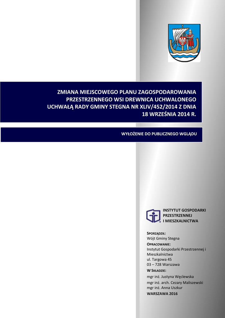 ZMIANA MIEJSCOWEGO PLANU ZAGOSPODAROWANIA PRZESTRZENNEGO WSI DREWNICA UCHWALONEGO UCHWAŁĄ RADY GMINY STEGNA NR XLIV/452/2014 Z DNIA 18 WRZEŚNIA 2014 R. WYŁOŻENIE DO PUBLICZNEGO WGLĄDU INSTYTUT GOSPODARKI PRZESTRZENNEJ I MIESZKALNICTWA SPORZĄDZIŁ: Wójt Gminy Stegna OPRACOWANIE: Instytut Gospodarki Przestrzennej i Mieszkalnictwa ul. Targowa 45 03 – 728 Warszawa W SKŁADZIE: mgr inż. Justyna Węclewska mgr inż. arch. Cezary Maliszewski mgr inż. Anna Uszkur WARSZAWA 2016 PROJEKT UCHWAŁA NR………... RADY GMINY STEGNA z dnia ........................ 2016 r. w sprawie zmiany miejscowego planu zagospodarowania przestrzennego wsi Drewnica uchwalonego uchwałą Rady Gminy Stegna Nr XLIV/452/2014 z dnia 18 września 2014 r. Na podstawie art. 18 ust. 2 pkt 5 ustawy z dnia 8 marca 1990 r. o samorządzie gminnym (Dz. U. z 2016 r., poz. 446) oraz art. 20 ust. 1 ustawy z dnia 27 marca 2003 r. o planowaniu i zagospodarowaniu przestrzennym (Dz. U. z 2016 r., poz. 778, z późn. zm.), w związku z Uchwałą Nr XIV/129/2016 Rady Gminy Stegna z dnia 18 lutego 2016 r. w sprawie przystąpienia do sporządzenia zmiany miejscowego planu zagospodarowania przestrzennego wsi Drewnica uchwalonego uchwałą Rady Gminy Stegna Nr XLIV/452/2014 z dnia 18 września 2014 r., po stwierdzeniu, że przedmiotowy plan nie narusza ustaleń zmiany Studium uwarunkowań i kierunków zagospodarowania przestrzennego gminy Stegna przyjętej uchwałą Rady Gminy Stegna nr XL/397/10 z dnia 20.07.2010 r., Rada Gminy Stegna uchwala co następuje: Rozdział 1 Ustalenia ogólne § 1.1. Uchwala się zmianę miejscowego planu zagospodarowania przestrzennego wsi Drewnica uchwalonego uchwałą Rady Gminy Stegna Nr XLIV/452/2014 z dnia 18 września 2014 r., którego granice określa rysunek planu, stanowiący załącznik nr 1 do niniejszej uchwały. 2. Zmiana miejscowy planu zagospodarowania przestrzennego wsi Drewnica uchwalonego uchwałą Rady Gminy Stegna Nr XLIV/452/2014 z dnia 18 września 2014 r., zwana dalej „planem”, składa się z tekstu planu wraz z uzasadnieniem stanowiącego treść niniejszej uchwały oraz załącznika nr 1 rysunku planu sporządzonego na kopii mapy zasadniczej w skali 1:1000. 3. Załącznikami do niniejszej uchwały są ponadto: 1) rozstrzygnięcie Rady Gminy Stegna o sposobie rozpatrzenia uwag zgłoszonych do projektu planu stanowiące załącznik nr 2; 2) rozstrzygnięcie Rady Gminy Stegna o sposobie realizacji i zasadach finansowania inwestycji z zakresu infrastruktury technicznej, należących do zadań własnych Gminy Stegna stanowiące załącznik nr 3. 1) 2) 3) 4) 5) § 2.1. Obowiązującymi ustaleniami rysunku planu są: granica obszaru objętego planem miejscowym; linie rozgraniczające tereny o różnym przeznaczeniu lub zagospodarowania; przeznaczenia terenów oznaczone literowymi symbolami terenów; nieprzekraczalne linie zabudowy; wymiary w metrach. różnych zasadach 2. Pozostałe oznaczenia graficzne na rysunku planu mają charakter informacyjny. § 3.1. Ilekroć w niniejszej uchwale jest mowa o: 1) modernizacji – należy przez to rozumieć wykonywanie robót budowlanych w istniejącym obiekcie budowlanym polegających na ulepszeniu jego właściwości użytkowych poprzez przebudowę, rozbudowę, nadbudowę lub remont, wiążący się z zastosowaniem materiałów lub rozwiązań technicznych nowszych technologicznie niż użytych w stanie pierwotnym; 2) minimalnej szerokości frontu działki – należy przez to rozumieć najmniejszy dopuszczony ustaleniami planu wymiar działki od strony drogi publicznej, drogi wewnętrznej lub ciągu pieszo-jezdnego, z którego następuje główny wjazd na działkę liczony po najkrótszej linii łączącej punkty przecięcia bocznych granic działki z linią rozgraniczającą ulicy lub wymiar działki na odcinku bezpośrednio graniczącym z drogą, z której następuje główny wjazd; 3) nieprzekraczalnej linii zabudowy należy przez to rozumieć linię wyznaczoną na rysunku planu, poza którą nie mogą być wysunięte elewacje budynków, przy czym dopuszcza się przekroczenie tej linii przez takie elementy budynku jak: schody zewnętrzne, gzymsy, balkony, tarasy, ganki, zadaszenia, jednak nie więcej niż o 1,5 m; 4) nośniku informacyjnym należy przez to rozumieć wszelkie urządzenia niosące treści związane z usługami publicznymi, systemem informacji miejskiej, orientacji turystycznej informacją społeczno-kulturalną oraz oznaczenia i znaki informujące o obiektach użyteczności publicznej, terenach i obiektach chronionych lub strefach ochronnych, w rozumieniu przepisów odrębnych; 5) przepisach odrębnych należy przez to rozumieć ustawy wraz z aktami wykonawczymi oraz pozostałymi przepisami; 6) przeznaczeniu podstawowym należy przez to rozumieć główny planowany rodzaj przeznaczenia terenu, który obejmuje co najmniej 60% dopuszczonej powierzchni zabudowy na działce, lub w przypadku sytuowania budynku o funkcji mieszanej przeznaczenie musi obejmować co najmniej 60% powierzchni użytkowej wszystkich budynków na działce budowlanej; 7) przeznaczeniu uzupełniającym – należy przez to rozumieć planowany dodatkowy rodzaj przeznaczenia terenu, inny niż przeznaczenie podstawowe, który je uzupełnia i nie przekracza 10% powierzchni użytkowej wszystkich budynku; 8) terenie należy przez to rozumieć fragment obszaru planu, wydzielony na rysunku planu liniami rozgraniczającymi i oznaczony literowym symbolem przypisanym do tego terenu; 9) usługach należy przez to rozumieć wszelkie obiekty budowlane lub zagospodarowanie terenu w całości lub części służące działalności, której celem jest zaspokajanie potrzeb ludności, a nie produkcja dóbr materialnych; 10) usługach nieuciążliwych należy przez to rozumieć przedsięwzięcia, które nie powodują ponadnormatywnego oddziaływania emisji substancji i energii oraz nie będące przedsięwzięciami mogącymi zawsze znacząco oddziaływać na środowisko lub 