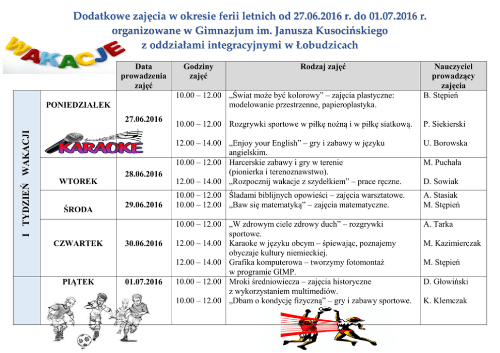 Dodatkowe zajęcia w okresie ferii letnich od 27.06.2016 r. do 01.07.2016 r. organizowane w Gimnazjum im. Janusza Kusocińskiego z oddziałami integracyjnymi w Łobudzicach Data prowadzenia zajęć I TYDZIEŃ WAKACJI 27.06.2016 28.06.2016 WTOREK CZWARTEK PIĄTEK Rodzaj zajęć 10.00 – 12.00 „Świat może być kolorowy” – zajęcia plastyczne: modelowanie przestrzenne, papieroplastyka. PONIEDZIAŁEK ŚRODA Godziny zajęć 29.06.2016 30.06.2016 01.07.2016 Nauczyciel prowadzący zajęcia B. Stępień 10.00 – 12.00 Rozgrywki sportowe w piłkę nożną i w piłkę siatkową. P. Siekierski 12.00 – 14.00 „Enjoy your English” – gry i zabawy w języku angielskim. 10.00 – 12.00 Harcerskie zabawy i gry w terenie (pionierka i terenoznawstwo). 12.00 – 14.00 „Rozpocznij wakacje z szydełkiem” – prace ręczne. U. Borowska 10.00 – 12.00 Śladami biblijnych opowieści – zajęcia warsztatowe. 10.00 – 12.00 „Baw się matematyką” – zajęcia matematyczne. A. Stasiak M. Stępień 10.00 – 12.00 „W zdrowym ciele zdrowy duch” – rozgrywki sportowe. 12.00 – 14.00 Karaoke w języku obcym – śpiewając, poznajemy obyczaje kultury niemieckiej. 12.00 – 14.00 Grafika komputerowa – tworzymy fotomontaż w programie GIMP. 10.00 – 12.00 Mroki średniowiecza – zajęcia historyczne z wykorzystaniem multimediów. 10.00 – 12.00 „Dbam o kondycję fizyczną” – gry i zabawy sportowe. A. Tarka M. Puchała D. Sowiak M. Kazimierczak M. Stępień D. Głowiński K. Klemczak