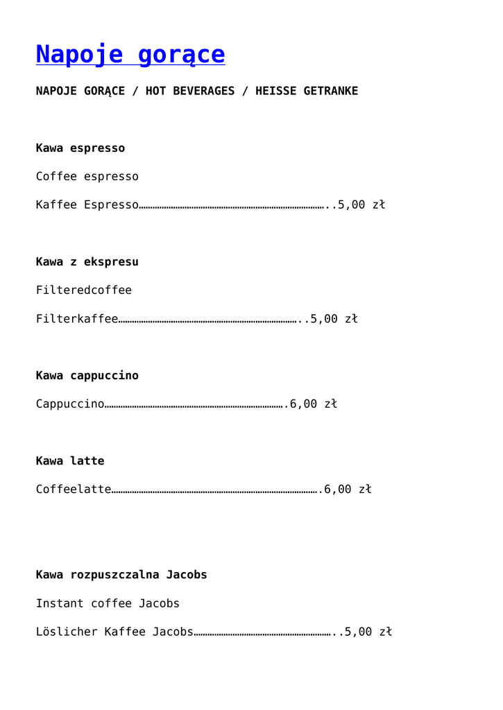 Napoje gorące NAPOJE GORĄCE / HOT BEVERAGES / HEISSE GETRANKE Kawa espresso Coffee espresso Kaffee Espresso………………………………………………………………………..5,00 zł Kawa z ekspresu Filteredcoffee Filterkaffee……………………………………………………………………..5,00 zł Kawa cappuccino Cappuccino…………………………………………………………………….6,00 zł Kawa latte Coffeelatte……………………………………………………………………………….6,00 zł Kawa rozpuszczalna Jacobs Instant coffee Jacobs Löslicher Kaffee Jacobs……………………………………………………..5,00 zł Kawa Jacobs Kaffee Jacobs…………………………………………………………………………..5,00 zł Herbaty Lipton Lipton Tea czarna black zielona green owocowa fruit…………………………………………………………………………4,00 zł