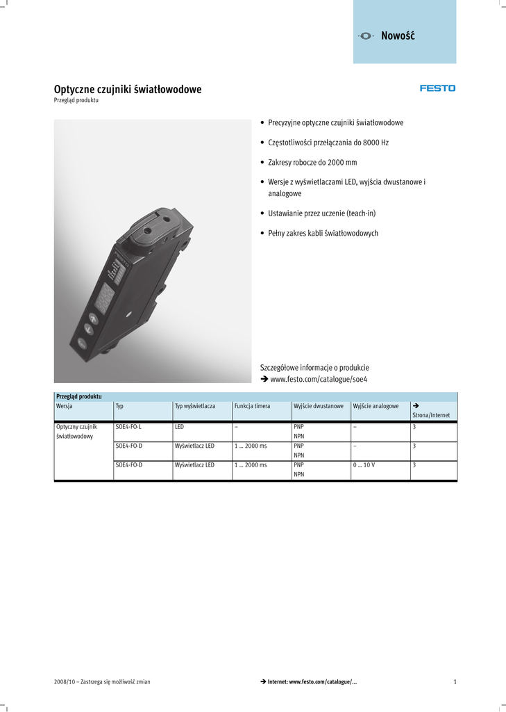 -V- Nowość Optyczne czujniki światłowodowe Przegląd produktu • Precyzyjne optyczne czujniki światłowodowe • Częstotliwości przełączania do 8000 Hz • Zakresy robocze do 2000 mm • Wersje z wyświetlaczami LED, wyjścia dwustanowe i analogowe • Ustawianie przez uczenie (teach-in) • Pełny zakres kabli światłowodowych Szczegółowe informacje o produkcie www.festo.com/catalogue/soe4 Przegląd produktu Wersja Optyczny czujnik światłowodowyy Typ Typ wyświetlacza Funkcja timera Wyjście dwustanowe Wyjście analogowe Strona/Internet SOE4-FO-L LED – – 3 SOE4-FO-D Wyświetlacz LED 1 … 2000 ms – 3 SOE4-FO-D Wyświetlacz LED 1 … 2000 ms PNP NPN PNP NPN PNP NPN 0 … 10 V 3 2008/10 – Zastrzega się możliwość zmian Internet: www.festo.com/catalogue/... 1 -V- Nowość Optyczne czujniki światłowodowe SOE4 Kody typów SOE4 – FO – D – H F2 – 1PU – K Typ SOE4 Optyczny czujnik światłowodowy Wejście FO Kabel światłowodowy Typ wyświetlacza L D LED Wyświetlacz LED Rodzaj mocowania H Montaż na szynie H lub przez otwory przelotowe Przyłącze kabla światłowodowego F2 Kabel światłowodowy ∅ 2 mm Wyjście elektryczne 1P 1N 1PU 1NU 1 wyjście przełączające PNP 1 wyjście przełączające NPN 1 wyjście przełączające PNP i 0 … 10 V analogowe 1 wyjście przełączające NPN i 0 … 10 V analogowe Przyłącze elektryczne K M8 2 Kabel, 2 m długości Wtyczka M8x1 Internet: www.festo.com/catalogue/... Zastrzega się możliwość zmian – 2008/10 -V- Nowość Optyczne czujniki światłowodowe SOE4 Dane techniczne Ogólne dane techniczne Typ wyświetlacza LED Wyświetlacz LED Zakres roboczy Zależy od trybu pomiaru i kabli światłowodowych tabele wartości 5,, 6 Zabezpieczenie przed odbieraniem sygnałów z innego czujnika Rodzaj światła Opcje ustawiania – Zależy od trybu pomiaru i kabli światłowodowych tabele wartości dla trybu standardowego 5, 6 Tryb standardowy: 100% Tryb dokładny: w przybliż. 40% Tryb szybki: w przybliż. 40% Tryb długodystansowy: w przybliż. 190% Zabezpieczenie przez zastosowanie do czterech urządzeń montowanych bezpośrednio obok siebie Czerwone Teach-in (Uczenie) Teach-in (uczenie) przez przyłącze elektryczne Dane elektryczne Typ wyświetlacza LED Wyświetlacz LED Maks. częstotliwość ę przełączania p ą [[Hz]] 1500 5 Funkcja timera Zakres napięcia roboczego Maks. prąd wyjściowy Ochrona przed zwarciem Ochrona przed zamianą polaryzacji Stopień ochrony [ms] [V DC] [mA] – 10 … 30 100 Pulsacyjne Dla napięcia roboczego IP64 Tryb standardowy: 1000 Tryb dokładny: 125 Tryb szybki: 8000 Tryb długodystansowy: 125 1 … 2,000 Warunki pracy i otoczenia Temperatura otoczenia Temperatura otoczenia przy instalacji z elastycznym kablem Znak CE (patrz: deklaracja zgodności) Zatwierdzenie [°C] [°C] –20 … +60 –5 … +60 Zgodnie z dyrektywą EU EMC C-UL-US listed (OL) C tick Materiały Korpus Osłona kabla Dane zamówieniowe Wersja Akrylo-butadieno-styren Poliuretan Typ wyświetlacza Wyjście przełączające, funkcja przełączania Wyjście analogowe Przyłącze elektryczne Nr części. Typ LED PNP,, pprzełączalne ą – NPN,, przełączalne p ą – PNP, przełączalne NPN, przełączalne PNP, przełączalne NPN, przełączalne – – 0 … 10 V 0 … 10 V Kabel, 4-żyłowy Wtyczka M8x1, 4-piny Kabel, 4-żyłowy Wtyczka M8x1, 4-piny Wtyczka M8x1, 4-piny Wtyczka M8x1, 4-piny Kabel, 5-żyłowy Kabel, 5-żyłowy 552 795 552 796 552 797 552 798 552 799 552 800 552 801 552 802 Wyświetlacz y LED 2008/10 – Zastrzega się możliwość zmian Internet: www.festo.com/catalogue/... SOE4-FO-L-HF2-1P-K SOE4-FO-L-HF2-1P-M8 SOE4-FO-L-HF2-1N-K SOE4-FO-L-HF2-1N-M8 SOE4-FO-D-HF2-1P-M8 SOE4-FO-D-HF2-1N-M8 SOE4-FO-D-HF2-1PU-K SOE4-FO-D-HF2-1NU-K 3 -V- Nowość Optyczne czujniki światłowodowe SOE4 Przegląd osprzętu 6 7 8 6 5 4 1 2 3 Akcesoria Krótki opis Strona/Internet 1 Z kablem 3 Z wtyczką M8x1, 4-piny 3 Z gniazdem M8x1, 4-piny Do mocowania na ścianie więcej niż 2 czujników Do mocowania na ścianie maks. 2 czujników Do czujnika odbiciowego, czujnika typu bariera, ze stałą ogniskową lub konstrukcji seryjnych Do dostosowania charakterystyk optycznych kabli światłowodowych Do kabli światłowodowych z O.D. 1.0 i 1.25 … 1.3 mm Do kabli światłowodowych z tworzywa z O.D. 1.0 i 1.25 … 1.3 a także 2.2 mm 8 – 8 5 7 7 7 2 3 4 5 6 7 8 – 4 Optyczny czujnik światłodowy SOE4-…-K Optyczny czujnik światłodowy SOE4-…-M8 Kabel przyłączeniowy Szyna montażowa wg DIN EN 60715 Płyta adaptera SXE3-W Kabel światłowodowy Adapter soczewki Adapter Przyrząd do cięcia światłowodu Internet: www.festo.com/catalogue/... Zastrzega się możliwość zmian – 2008/10 -V- Nowość Optyczne czujniki światłowodowe SOE4 Akcesoria Dane techniczne – Kabel światłowodowy (czujnik odbiciowy) Cecha specjalna kabla światłowodowego Standard Zakres roboczy1) Min. średnica obiektu2) Min. promień gięcia Śred. zewnętrzna ∅ Wielkość wtyku Stopień ochrony Temperatura otoczenia Materiał [mm] [mm] [mm] [mm] [°C] Korpus Kabel światłowodowy 1) 2) 140 0.1 25 2.2 M6 IP66 –55 … +70 Wysokostopowa stal nierdzewna Polietylen Zakres roboczy1) Min. średnica obiektu2) Min. promień gięcia Śred. zewnętrzna ∅ Wielkość wtyku Stopień ochrony Temperatura otoczenia Materiał [mm] [mm] [mm] [mm] Elastyczny 200 0.1 40 2.2 M6 130 0.1 2 1.3 M4 Mosiądz niklowany Mosiądz niklowany –40 … +70 Wysokostopowa stal nierdzewna [°C] Korpus Kabel światłowo. Precyzja 150 12 0.1 0.05 25 10 2.2 1.0 M6 M3 IP66 –55 … +115 –55 … +70 Wysokostopowa stal nierdzewna Polietylen 65 0.1 15 1.25 M4 Szeregowy Stała ogniskowa 130 0.15 25 2.2 19x25x6 mm 2 … 10 0.1 25 2.2 13x19.6x5 mm Mosiądz niklowany Akrylo-butadieno-styren Z SOE4-FO-L i SOE4-FO-D w trybie standardowym Próba robiona w celu uzyskania sygnału przy 10% zakresu przy użyciu kabla miedzianego. Najmniejsza średnica kabla, która była nadal wykrywa