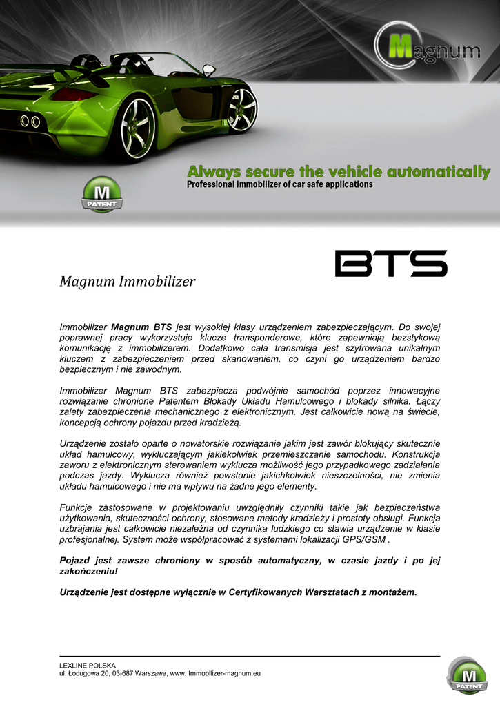 Magnum Immobilizer Immobilizer Magnum BTS jest wysokiej klasy urządzeniem zabezpieczającym. Do swojej poprawnej pracy wykorzystuje klucze transponderowe, które zapewniają bezstykową komunikację z immobilizerem. Dodatkowo cała transmisja jest szyfrowana unikalnym kluczem z zabezpieczeniem przed skanowaniem, co czyni go urządzeniem bardzo bezpiecznym i nie zawodnym. Immobilizer Magnum BTS zabezpiecza podwójnie samochód poprzez innowacyjne rozwiązanie chronione Patentem Blokady Układu Hamulcowego i blokady silnika. Łączy zalety zabezpieczenia mechanicznego z elektronicznym. Jest całkowicie nową na świecie, koncepcją ochrony pojazdu przed kradzieżą. Urządzenie zostało oparte o nowatorskie rozwiązanie jakim jest zawór blokujący skutecznie układ hamulcowy, wykluczającym jakiekolwiek przemieszczanie samochodu. Konstrukcja zaworu z elektronicznym sterowaniem wyklucza możliwość jego przypadkowego zadziałania podczas jazdy. Wyklucza również powstanie jakichkolwiek nieszczelności, nie zmienia układu hamulcowego i nie ma wpływu na żadne jego elementy. Funkcje zastosowane w projektowaniu uwzględniły czynniki takie jak bezpieczeństwa użytkowania, skuteczności ochrony, stosowane metody kradzieży i prostoty obsługi. Funkcja uzbrajania jest całkowicie niezależna od czynnika ludzkiego co stawia urządzenie w klasie profesjonalnej. System może współpracować z systemami lokalizacji GPS/GSM . Pojazd jest zawsze chroniony w sposób automatyczny, w czasie jazdy i po jej zakończeniu! Urządzenie jest dostępne wyłącznie w Certyfikowanych Warsztatach z montażem. LEXLINE POLSKA ul. Łodugowa 20, 03-687 Warszawa, www. Immobilizer-magnum.eu OPIS URZĄDZENIA Magnum BTS jest immobilizerem transponderowym (bezstykowym) pracującym na częstotliwości 125kHz zapewniającym najlepsze funkcje z zakresu zabezpieczenia przed kradzieżą. Immobilizer BTS pomimo prostej konstrukcji posiada wszystkie logiczne funkcje obsługi i autodiagnozy. Magnum BTS posiada o Patentowany Zawór Blokujący Hamulce i blokadę wewnętrzną przekaźnik blokady elektrycznej pracujących na stykach normalnie zwartych (NC). Do obsługi immobilizera służą klucze transpondery w kształcie breloczka (2 sztuki w komplecie). FUNKCJE IMMOBILIZERA możliwość wkodowania 4 kluczy transponderów 1obwód blokady hydraulicznej hamulca 1 obwód blokady elektrycznej w konfiguracji NC 10A 1 linia wejścia włączników masowych (wyprowadzenie immobilizera z trybu uśpienia) 1 linia wejścia załączenia zapłonu (wyprowadzenie immobilizera z trybu uśpienia) Auto uzbrojenie Tryb “serwis” 3 funkcje programowalne KOMPLETACJA URZĄDZENIA: Zdjęcie wszystkich elementów systemu. Centralka immobilizera - 1 sztuka. Zawór hydrauliczny - 1 sztuka. Wiązka główna W14 - 1 sztuka. Wiązki blokady zapłonu - 1 sztuka. Transpondery - w skład urządzenia wchodzą 2 sztuki LEXLINE POLSKA ul. Łodugowa 20, 03-687 Warszawa, www. Immobilizer-magnum.eu FUNKCJE LOGICZNE ROZBROJENIE IMMOBILIZERA – w tym stanie dioda nie miga Następuje poprzez zbliżenie klucza transpondera do anteny odbiorczej w czasie 30 sek. od otwarcia drzwi lub po przekręceniu stacyjki .Po tym czasie system przechodzi w stan uśpienia i oczekuje do ponownego otwarcia drzwi lub przekręcenie stacyjki. Sygnalizacja stanu rozbrojenia: Buzer - 3 krótkie sygnały Dioda przestaje migać (każde zbliżenie klucza transpondera do anteny sygnalizowane jest w stanie rozbrojenia immobilizera dwoma sygnałami buzera). UWAGA: Chwilowe załączenie i wyłączenie zapłonu lub otwarcie drzwi powoduje wyprowadzenie immobilizera z trybu uśpienia na zaprogramowany czas automatyczny, w którym możemy rozbroić immobilizer. Jeżeli w tym czasie nie zbliżymy klucza transpondera do anteny to immobilizer automatycznie przejdzie w tryb “uśpienia” (wyłączenia układu zasilania anteny).Załączenie zapłonu w stanie uzbrojenia powoduje rozłączenie obwodów blokady elektrycznej (zadziałanie przekaźnika). AUTOMATYCZNE UZBROJENIE IMMOBILIZERA – w tym stanie dioda miga szybko Wyłączenie zapłonu i upływie 5 min. powoduje automatyczne uzbrojenie. Otwarcie drzwi skraca czas do 30sek. jeśli zapłon został wcześniej wyłączony lub opcja SZYBKO ustawiona przez instalatora skraca czas do 5 sek. UZBROJENIE IMMOBILIZERA – w tym stanie dioda miga wolno Sygnalizacja przejścia do stanu uzbrojenia : Buzer - 1 długi (3 sek) sygnał. Dioda zaczyna migać wolno w tempie 1Hz Pierwsza zostaje uaktywniona Blokada Elektryczna W drugiej kolejności zostaje zamknięty zawór układu hamulca Blokada Hamulca Użycie hamulca powoduje zablokowanie kół Przykład: Po wyłączeniu silnika samochodu i otwarciu drzwi po 30 sek. system uzbroi się automatycznie. Ponowne uruchomienie silnika wymaga zbliżenia klucza transpondera do anteny. Przypomni nam o tym 1 sygnał akustyczny po przekręceniu kluczyka w pozycję zapłon bez uprzedniego zbliżenia klucza transpondera. Pierwsze użycie hamulca bez rozbrojenia spowoduje zablokowanie systemu hamulcowego. *Dla pełnej ochrony samochodu należy po wyłączeniu silnika przy otwartych drzwiach (ustawiona opcja Szybko) samochodu wcisnąć mocno pedał hamulca. Samochód ma wówczas zablokowany silnik i koła samochodu. Ochronę samochodu zapewnia również pozostawienie samochodu bez wciskania hamulca(nie zabezpiecza przed holowaniem).Jednakże przy ewentualnej próbie ominięcia układu unieruchamiającego silnik lub holowaniu, blokada układu zadziała przy pierwszym hamowaniu, skutecznie unieruchamiając pojazd. Pamiętaj ! W celu odblokowania układu hamulcowego należy w pierwszej kolejności odblokować kluczem tranpondera układ elektroniczny , po sygnale akustycznym uruchomić silnik i nacisnąć pedał hamulca. Hamulec zostanie odblokowany, pedał hamulca stanie się LEXLINE POLSKA ul. Łodugowa 20, 03-687 Warszawa, www. Immobilizer-magnum.eu wyczuwalnie miękki. W przypadku trudności z odblokowaniem należy ponownie 