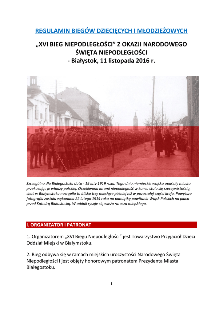 REGULAMIN BIEGÓW DZIECIĘCYCH I MŁODZIEŻOWYCH „XVI BIEG NIEPODLEGŁOŚCI” Z OKAZJI NARODOWEGO ŚWIĘTA NIEPODLEGŁOŚCI - Białystok, 11 listopada 2016 r. Szczególna dla Białegostoku data - 19 luty 1919 roku. Tego dnia niemieckie wojska opuściły miasto przekazując je władzy polskiej. Oczekiwana latami niepodległośd w koocu stała się rzeczywistością, chod w Białymstoku nastąpiło to blisko trzy miesiące później niż w pozostałej części kraju. Powyższa fotografia została wykonana 22 lutego 1919 roku na pamiątkę powitania Wojsk Polskich na placu przed Katedrą Białostocką. W oddali rysuje się wieża ratusza miejskiego. I. ORGANIZATOR I PATRONAT 1. Organizatorem „XVI Biegu Niepodległości” jest Towarzystwo Przyjaciół Dzieci Oddział Miejski w Białymstoku. 2. Bieg odbywa się w ramach miejskich uroczystości Narodowego Święta Niepodległości i jest objęty honorowym patronatem Prezydenta Miasta Białegostoku. 1 II. WSPÓŁORGANIZATORZY 1. Sklep biegowy „Pędziwiatr” 2. Białostocki Ośrodek Sportu i Rekreacji 3. Stadion Miejski w Białymstoku III. CEL Upamiętnienie Rocznicy Odzyskania Niepodległości Polski. Krzewienie wśród dzieci i młodzieży postaw patriotycznych oraz promowanie aktywnego sposobu spędzania wolnego czasu. IV. TERMIN I MIEJSCE BIEGU 1. Biegi odbędą się 11 listopada 2016 r. w Białymstoku. 2. Początek biegów dziecięcych i młodzieżowych rozpocznie się o godzinie 10:40. 3. Start i meta biegów będzie zlokalizowana na płycie boiska Stadionu Miejskiego w Białymstoku. V. UCZESTNICTWO I ZGŁOSZENIA 1. W biegach młodzieżowych prawo startu mają dzieci i młodzież w wieku od 2 do 13 lat, w zawodach adresowanych dla odpowiednio przypisanej grupy wiekowej. 2. Warunkiem uczestnictwa w biegu jest prawidłowe wypełnienie formularza zgłoszeniowego na stronie internetowej Plus Timing. Jest to również jednoznaczne z akceptacją niniejszego regulaminu. 3. Udział w Biegu mogą wziąd tylko te osoby, które dokonają pełnej rejestracji. Zawodnicy, którzy nie dokonają rejestracji, nie zostaną dopuszczeni do startu. 4. Wszyscy uczestnicy biegów młodzieżowych zobowiązani są przedstawid Oświadczenie rodzica lub opiekuna prawnego o zdolności dziecka do udziału w biegu podpisanego przez rodzica lub opiekuna prawnego. 2 5. Zgłoszenia internetowe zostaną zawieszone 9 listopada 2015 r. Po tym terminie zgłoszenia będą możliwe wyłącznie w Biurze Zawodów w dniu 10 listopada 2016 r. pod warunkiem dostępności wolnych miejsc. 6. Dla Biegów Dziecięcych i Młodzieżowych obowiązuje łączny limit 200 nadanych numerów startowych, przy czym o nadaniu numeru startowego decyduje kolejnośd dokonywania opłat startowych. 7. Wszystkie dzieci startujące w biegach muszą zostad zweryfikowane w Biurze Zawodów. Biuro Zawodów będzie dla nich czynne w następujących porach: 10 listopada(czwartek) w godzinach: 17:00 - 21:00 8. Biuro Zawodów będzie zlokalizowane na terenie Stadionu Miejskiego w Białymstoku, mieszczącego się na ul. Słonecznej 1. 9. Podstawą odbioru pakietu startowego jest okazanie przez zawodnika w Biurze Zawodów dokumentu tożsamości ze zdjęciem. VI. OPŁATY 1. Udział we wszystkich biegach dziecięcych młodzieżowych jest całkowicie bezpłatny. VII. KLASYFIKACJE 1. Ze względu na rekreacyjny charakter imprezy, w biegach dziecięcych i młodzieżowych Organizator nie przewiduje pomiaru czasu i opracowywania klasyfikacji koocowych. VIII. NAGRODY 1. Każdy uczestnik biegów młodzieżowych, otrzyma na mecie specjalnie przygotowaną pamiątkę. IX. HARMONOGRAM BIEGÓW godz. 11:00 Uroczyste otwarcie imprezy 3 godz. 11:10 200 m - Bieg Krasnoludków (rocznik 2010 i młodsi) Kategoria: dziewcząt i chłopców godz. 11:20 400 m - Bieg Malucha (roczniki 2009, 2008, 2007) Kategoria: dziewcząt i chłopców. godz. 11:30 400 m - Bieg Starszaka (roczniki 2006, 2005, 2004) Kategoria: dziewcząt i chłopców. Bezpośrednio po biegach, na terenie Stadionu Miejskiego będą prowadzone z myślą o dzieciach i młodzieży liczne gry i konkursy z nagrodami. DANE KONTAKTOWE ORGANIZATORA Organizator, Grzegorz Łukaszewicz - 602 595 326 Dyrektor zawodów, Stanisław Kłosowski - 664 011 793 Dyrektor sportowy biegu, Paweł Kalinowski - 603 054 868 E-mail: [email protected] 4 Towarzystwo Przyjaciół Dzieci Oddział Miejski w Białymstoku ul. Pietkiewicza 1 15-689 Białystok NIP: 5422870447 REGON: 052230410 KRS: 0000196806 5