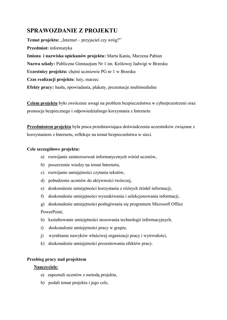 SPRAWOZDANIE Z PROJEKTU Temat projektu: „Internet – przyjaciel czy wróg?” Przedmiot: informatyka Imiona i nazwiska opiekunów projektu: Marta Kania, Marzena Pabian Nazwa szkoły: Publiczne Gimnazjum Nr 1 im. Królowej Jadwigi w Brzesku Uczestnicy projektu: chętni uczniowie PG nr 1 w Brzesku Czas realizacji projektu: luty, marzec Efekty pracy: hasła, opowiadania, plakaty, prezentacje multimedialne Celem projektu było zwrócenie uwagi na problem bezpieczeństwa w cyberprzestrzeni oraz promocja bezpiecznego i odpowiedzialnego korzystania z Internetu Przedmiotem projektu była praca przedstawiająca doświadczenia uczestników związane z korzystaniem z Internetu, refleksje na temat bezpieczeństwa w sieci. Cele szczegółowe projektu: a) rozwijanie zainteresowań informatycznych wśród uczniów, b) poszerzenie wiedzy na temat Internetu, c) rozwijanie umiejętności czytania tekstów, d) pobudzenie uczniów do aktywności twórczej, e) doskonalenie umiejętności korzystania z różnych źródeł informacji, f) doskonalenie umiejętności wyszukiwania i selekcjonowania informacji, g) doskonalenie umiejętności posługiwania się programem Microsoft Office PowerPoint, h) kształtowanie umiejętności stosowania technologii informacyjnych, i) doskonalenie umiejętności pracy w grupie, j) wyrabianie nawyków właściwej organizacji pracy i wytrwałości, k) doskonalenie umiejętności prezentowania efektów pracy. Przebieg pracy nad projektem Nauczyciele: a) zapoznali uczniów z metodą projektu, b) podali temat projektu i jego cele, c) omówili sposób jego realizacji, d) omówili zagadnienia dotyczące obszaru, w którym będzie realizowany projekt, e) przedstawili przykładowe źródła informacji, f) zaakceptowali podział na grupy, g) zapoznali uczniów z instrukcją wykonania projektu. ustalili wstępny harmonogram działań, h) i) zawarli z uczniami kontrakt j) ustalili kryteria oceny i zapoznali z nimi uczniów, k) omówili sposób prezentacji rezultatów pracy, l) spotykali się z uczniami w celu kontroli postępów pracy oraz udzielania pomocy w przypadku pojawienia się trudności, ł) dokonali oceny projektu wg podanych kryteriów. . Uczniowie: a) dokonali podziału na grupy, b) nawiązali dobrą współpracę w grupie, c) zapoznali się z instrukcją wykonania projektu, d) zapoznali się z harmonogramem działań, zakresem pracy i kryteriami oceny, e) konsultowali pojawiające się trudności z nauczycielami, f) terminowo z wyjątkowym zdyscyplinowaniem i odpowiedzialnością realizowali poza zajęciami szkolnymi przydzielone zadania: zebrali potrzebne informacje, wybrali informacje, które stały się przedmiotem opracowania, opracowali zebrane materiały, wykonali ciekawe i oryginalne prezentacje multimedialne, wykonali plakaty, ułożyli hasła związane z tematem projektu, napisali opowiadania na temat „Internet – przyjaciel czy wróg?” zaprezentowali wyniki pracy. g) dokonali samooceny, h) uczestniczyli w ocenianiu innych uczestników projektu. . Sposób i miejsce prezentacji projektu Prezentacja projektu odbyła się w dwóch turach: 5 kwietnia 2013 roku i 10 kwietnia 2013 roku w sali komputerowej. Uczestnicy projektu zapoznali oglądających z celem pracy, etapami jej powstania, omówili wkład poszczególnych uczniów w wykonanie prac. Przedstawiciele poszczególnych grup zaprezentowali efekty wspólnej pracy, korzystając z komputera i projektora multimedialnego w obecności nauczycieli informatyki i uczniów klas szóstych ze Szkoły Podstawowej nr 3 w Brzesku i Szkoły Podstawowej z Mokrzysk. Brzesko, dnia 11 kwietnia 2013 roku opiekunowie projektu Marzena Pabian Marta Kania