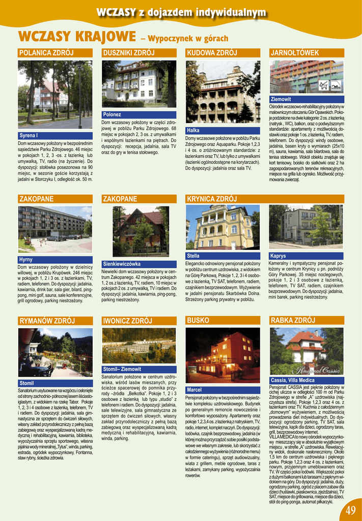 WCZASY z dojazdem indywidualnym WCZASY KRAJOWE – Wypoczynek w górach POLANICA ZDRÓJ DUSZNIKI ZDRÓJ KUDOWA ZDRÓJ JARNOŁTÓWEK Ziemowit Polonez Syrena I Dom wczasowy położony w bezpośrednim sąsiedztwie Parku Zdrojowego. 46 miejsc w pokojach 1, 2, 3 -os. z łazienką lub umywalką, TV, radio (na życzenie). Do dyspozycji: stołówka posezonowa na 90 miejsc, w sezonie goście korzystają z jadalni w Storczyku I, odległość ok. 50 m. ZAKOPANE Hyrny Dom wczasowy położony w dzielnicy willowej, w pobliżu Krupówek. 246 miejsc w pokojach 1, 2 i 3 os. z łazienkami, TV, radiem, telefonem. Do dyspozycji: jadalnia, kawiarnia, drink bar, sala gier, bilard, pingpong, mini golf, sauna, sale konferencyjne, grill ogrodowy, parking niestrzeżony. RYMANÓW ZDRÓJ Dom wczasowy położony w części zdrojowej w pobliżu Parku Zdrojowego. 68 miejsc w pokojach 2, 3 os. z umywalkami i wspólnymi łazienkami na piętrach. Do dyspozycji: recepcja, jadalnia, sala TV oraz do gry w tenisa stołowego. ZAKOPANE Halka Domy wczasowe położone w pobliżu Parku Zdrojowego oraz Aquaparku. Pokoje 1,2,3 i 4 os. o zróżnicowanym standardzie: z łazienkami oraz TV, lub tylko z umywalkami (łazienki ogólnodostępne na korytarzach). Do dyspozycji: jadalnia oraz sala TV. KRYNICA ZDRÓJ Stella Sienkiewiczówka Niewielki dom wczasowy położony w centrum Zakopanego. 42 miejsca w pokojach 1, 2 os.z łazienką, TV, radiem, 10 miejsc w pokojach 2 os. z umywalką, TV i radiem. Do dyspozycji: jadalnia, kawiarnia, ping-pong, parking niestrzeżony. IWONICZ ZDRÓJ Ośrodek wczasowo-rehabilitacyjny położony w malowniczym otoczeniu Gór Opawskich. Pokoje podzielone na dwie kategorie: 2 os. z łazienką (natrysk , WC), balkon, oraz o podwyższonym standardzie: apartamenty z możliwością dostawki oraz pokoje 1 os. z łazienką, TV, radiem, telefonem. Do dyspozycji: windy osobowe, jadalnia, basen kryty o wymiarach (25x10 m), sauna, kawiarnia, sala bilardowa, sala do tenisa stołowego. Wokół obiektu znajduje się kort tenisowy, boisko do siatkówki oraz 2 ha zagospodarowanych terenów rekreacyjnych, miejsce na grilla lub ognisko. Możliwość przyjmowania zwierząt. Elegancko odnowiony pensjonat położony w pobliżu centrum uzdrowiska, z widokiem na Górę Parkową. Pokoje 1, 2, 3 i 4 osobowe z łazienką, TV SAT, telefonem, radiem, czajnikiem bezprzewodowym. Wyżywienie w jadalni pensjonatu Skarbówka Dolna. Strzeżony parking prywatny w pobliżu. BUSKO Kaprys Kameralny i sympatyczny pensjonat położony w centrum Krynicy u pn. podnóży Góry Parkowej. 35 miejsc noclegowych, pokoje 1, 2 i 3 osobowe z łazienką, telefonem, TV SAT, radiem, czajnikiem bezprzewodowym. Do dyspozycji: jadalnia, mini barek, parking niestrzeżony. RABKA ZDRÓJ Stomil– Ziemowit Stomil Sanatorium usytuowane na wzgórzu i osłonięte od strony zachodnio- północnej lasem liściastoiglastym, z widokiem na rzekę Tabor. Pokoje 1, 2, 3 i 4 osobowe z łazienką, telefonem, TV i radiem. Do dyspozycji: jadalnia, sala gimnastyczna ze sprzętem do ćwiczeń siłowych, własny zakład przyrodoleczniczy z pełną bazą zabiegową oraz wyspecjalizowaną kadrą medyczną i rehabilitacyjną, kawiarnia, biblioteka, wypożyczalnia sprzętu sportowego, własna pijalnia wody mineralnej „Tytus”, winda, parking, estrada, ogródek wypoczynkowy, Fontanna, staw rybny, ścieżka zdrowia. Sanatorium położone w centrum uzdrowiska, wśród lasów mieszanych, przy ścieżce spacerowej do pomnika przyrody –źródła „Bełkotka”. Pokoje 1, 2 i 3 osobowe z łazienką lub typu „studio” z telefonem i radiem. Do dyspozycji: jadalnia, sale telewizyjne, sala gimnastyczna ze sprzętem do ćwiczeń siłowych, własny zakład przyrodoleczniczy z pełną bazą zabiegową oraz wyspecjalizowaną kadrą medyczną i rehabilitacyjną, kawiarnia, winda, parking. Cassia, Villa Medica Marcel Pensjonat położony w bezpośrednim sąsiedztwie kompleksu uzdrowiskowego. Budynek po generalnym remoncie nowocześnie i komfortowo wyposażony. Apartamenty oraz pokoje 1,2,3,4 os. z łazienką z natryskiem, TV, radio, internet, komplet naczyń. Do dyspozycji: lodówka, czajnik bezprzewodowy, jadalnia (w której można przyrządzić sobie posiłki podstawowe we własnym zakresie, lub skorzystać z całodziennego wyżywienia (różnorodne menu) w formie cateringu), sprzęt audiowizualny, wiata z grillem, meble ogrodowe, taras z leżakami, zamykany parking, wypożyczalnia rowerów. Pensjonat Cassia jest pięknie położony w cichej uliczce w odległości 100 m od Parku Zdrojowego w strefie „A” uzdrowiska (najczystsza strefa). Pokoje 1,2,3 oraz 4 os. z łazienkami oraz TV. Kuchnia z całodziennym „domowym” wyżywieniem, z możliwością prowadzenia diet indywidualnych. Do dyspozycji: ogrodzony parking, TV SAT, sala telewizyjna, kącik dla dzieci, ogrodzony taras, grill, bezprzewodowy internet. Villa Medica to nowy ośrodek wypoczynkowy mieszczący się w absolutnie wyjątkowym miejscu , w strefie „A” uzdrowiska. Rewelacyjny widok, doskonale nasłoneczniony. Około 1,5 km do centrum uzdrowiska i pięknego parku. Pokoje 1,2,3 oraz 4 os, z łazienkami, nowym, przyjemnym umeblowaniem oraz TV. W części pokoi lodówki. Większość pokoi z dużymi balkonami lub tarasami z pięknym widokiem na góry. Do dyspozycji: jadalnia, duży, ogrodzony parking, ogród z placem zabaw dla dzieci (huśtawki, piaskownica, zjeżdżalnia), TV SAT, miejsce do grillowania, miejsce dla dzieci, stół do ping-ponga, automat piłkarzyki. 49