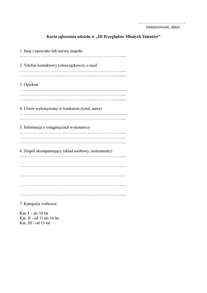 karta zgłoszenia do II Przglądu Młodych Talentów