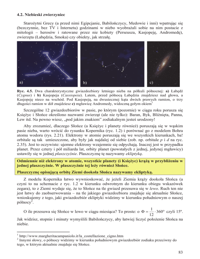 4.2. Niebieski zwierzyniec StaroĪytni Grecy (a przed nimi Egipcjanie, BabiloĔczycy, Medowie i inni) wpatrując siĊ (bezczynnie, bez TV i Internetu) godzinami w niebo wyobraĪali sobie na nim postacie z mitologii – herosów i ratowane przez nie kobiety (Perseusza, KasjopejĊ, AndromedĊ), zwierzĊta (àabĊdzia, Smoka) czy obiekty, jak strzaáĊ. a) b) c) Ryc. 4.5. Dwa charakterystyczne gwiazdozbiory letniego nieba na póákuli póánocnej: a) àabĊdĨ (Cygnus) i b) Kasjopeja (Cassiopeia). Latem, przed póánocą àabĊdzia znajdziesz nad gáowa, a KasjopejĊ nieco na wschód. Pod Kasjopeją, na dwusiecznej kąta dwóch prawych ramion, o trzy dáugoĞci ramion w dóá znajdziesz c) mgáawicĊ Andromedy, widoczną goáym okiem1 Szczególne 12 gwiazdozbiorów w pasie, po którym (pozornie) w ciągu roku porusza siĊ KsiĊĪyc i SáoĔce okreĞlono nazwami zwierząt (ale nie tylko): Baran, Byk, BliĨniĊta, Panna, Lew itd. Na pewno wiesz, „pod jakim znakiem” zodiakalnym jesteĞ urodzony! Aby zrozumieü, dlaczego SáoĔce (a KsiĊĪyc i planety równieĪ) poruszają siĊ w wąskim pasie nieba, warto wróciü do rysunku Kopernika (ryc. 1.2) i porównaü go z modelem Bohra atomu wodoru (rys. 2.21). Elektrony w atomie poruszają siĊ we wszystkich kierunkach, ba! orbitale są tak umieszczone, aby byáy jak najdalej od siebie (zob. np. orbitale p i d na ryc. 2.35). Jest to oczywiste: ujemne elektrony wzajemnie siĊ odpychają. Inaczej jest w przypadku planet. Przez cztery i póá miliarda lat, orbity planet (powstaáych z jednej, jedynej mgáawicy) ustawiáy siĊ w jednej páaszczyĨnie. PáaszczyznĊ tĊ nazywamy ekliptyką. Odmiennie niĪ elektrony w atomie, wszystkie planety (i KsiĊĪyc) krąĪą w przybliĪeniu w jednej páaszczyĨnie. W páaszczyĨnie tej leĪy równieĪ SáoĔce. PáaszczyznĊ opisującą orbitĊ Ziemi dookoáa SáoĔca nazywamy ekliptyką. Z modelu Kopernika áatwo wywnioskowaü, Īe jeĪeli Ziemia krąĪy dookoáa SáoĔca (a czyni to na schemacie z ryc. 1.2 w kierunku odwrotnym do kierunku obiegu wskazówek zegara), to z Ziemi wydaje siĊ, Īe to SáoĔce na tle gwiazd przesuwa siĊ w lewo. Ruch ten nie jest áatwy do zaobserwowania – na tle jakiego gwiazdozbioru znajduje siĊ aktualnie SáoĔce, wnioskujemy z tego, jaki gwiazdozbiór ekliptyki widzimy w kierunku poáudniowym o naszej póánocy2. 1 360q czyli 15º. 12 Jak widzisz, stopnie i minuty wymyĞlili BabiloĔczycy, aby áatwiej liczyü poáoĪenie SáoĔca na niebie. O ile przesuwa siĊ SáoĔce w lewo w ciągu miesiąca? To proste: o ) 1 http://www.margheritacampaniolo.it/la_costellazione_cigno.htm 2 Innymi sáowy, o póánocy widzimy w kierunku poáudniowym gwiazdozbiór zodiaku przeciwny do tego, w którym aktualnie znajduje siĊ SáoĔce. 83 Ryc. 4.6. SáoĔce widziane z Ziemia w ciągu roku przesuwa siĊ w lewo, zataczając peáne 360º na tle gwiazdozbiorów zodiaku. Ruch ten widziany z Ziemi nakáada siĊ na obrót dobowy, wiĊc nie jest tak zauwaĪalny jak (pozorny) ruch dzienny. W pierwszym rozdziale przedstawiliĞmy Ukáad Sáoneczny tak, jak go znaá Mikoáaj Kopernik. W schemacie z rys. 1.2a naleĪaáoby dodaü jedynie kierunek obrotu „sfer” – okazuje siĊ, Īe wszystkie planety widziane z perspektywy rys. 1.2a poruszają siĊ w kierunku odwrotnym do kierunku wskazówek zegara. RównieĪ KsiĊĪyc wokóá Ziemi krąĪy w kierunku odwrotnym do kierunku ruchu wskazówek. Oznacza to, Īe równieĪ KsiĊĪyc obserwowany z 1 Ziemi przesuwa siĊ na nieboskáonie w lewo, mniej wiĊcej o 4 360q co noc. 30 SáoĔce, widziane z Ziemi, przesuwa siĊ na tle zodiaku w lewo, o mniej wiĊcej 15º na miesiąc. KsiĊĪyc, widziany z Ziemi, przesuwa siĊ na tle zodiaku w lewo, mniej wiĊcej o 12º na dobĊ. Ale SáoĔce i KsiĊĪyc to nie jedyne obiekty, które (pozornie) wĊdrują po zodiaku. StaroĪytni (a za nimi Kopernik) znali piĊü takich „báądzących gwiazd”, czyli planet: Merkurego, Wenus, Marsa, Jowisza, Saturna. Pytanie: SprawdĨ, w jakich miesiącach jest widoczny na niebie „Twój” gwiazdozbiór zodiakalny. JeĞli chcesz go zobaczyü, szukaj go w pasie, po którym wĊdruje (pozornie) SáoĔce i KsiĊĪyc. Ekliptyka, czyli tory wszystkich planet i KsiĊĪyca leĪą w pasie zodiakalnym. 4.3. Nierozáączna para: Ziemia - KsiĊĪyc Miesiącem początkowo Sáowianie nazywali naturalnego satelitĊ Ziemi, gdyĪ co okreĞlony czas (okoáo 30 dni) pojawiaá siĊ w peáni widoczny na niebie. Początkową fazĊ (od nowiu do pierwszej kwadry) nazywano wówczas KsiĊĪycem (od sáowa „ksiąĪĊ”), czyli synem Miesiąca3. Jak „wschód” i „zachód” tak KsiĊĪyc ma mnóstwo znaczeĔ, szczególnie dla poetów i zakochanych. Obserwując KsiĊĪyc z Ziemi widzimy, Īe jego rozmiar zmienia siĊ: raz jest wiĊkszy (rozmiar kątowy wynosi 33'), innym razem wydaje siĊ mniejszym obiektem (29'). Rozmiar tarczy KsiĊĪyca to Ğrednio wiĊcej niĪ póá stopnia (mniej wiĊcej gruboĞü kciuka widzianego na wyciągniĊtej rĊce4). Obserwowane rozmiary naszego satelity zaleĪą od miejsca w którym 3 Nazwy niektórych pojĊü związanych z KsiĊĪycem wywodzą siĊ od sáów Selene oraz Luna (odpowiednio greckiej i rzymskiej bogini i uosobienia KsiĊĪyca). Selenographia: sive Lunae descriptio (Selenografia: lub opisanie KsiĊĪyca) to dzieáo napisane w 1647 r. przez naszego rodaka Jana Heweliusza. GdaĔski astronom opisaá w niej obserwacje KsiĊĪyca, jakie wykonaá w zbudowanym przez siebie obserwatorium mieszczącym siĊ na dachach trzech kamienic w centrum miasta. 4 Nie martw siĊ, jeĪeli masz maáy kciuk – przypuszczalnie i ramiĊ masz odpowiednio krótsze! 84