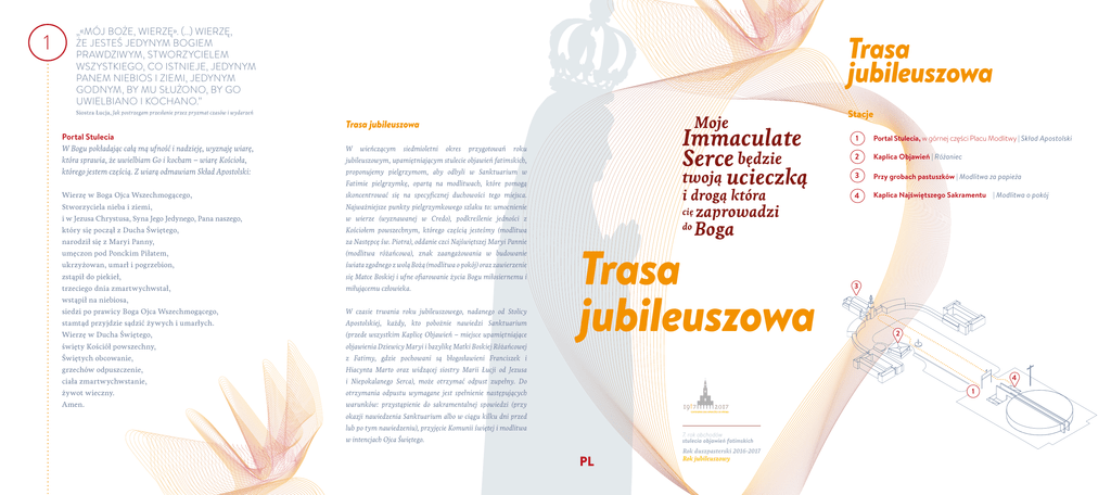 1 „«MÓJ BOŻE, WIERZĘ». (…) WIERZĘ, ŻE JESTEŚ JEDYNYM BOGIEM PRAWDZIWYM, STWORZYCIELEM WSZYSTKIEGO, CO ISTNIEJE, JEDYNYM PANEM NIEBIOS I ZIEMI, JEDYNYM GODNYM, BY MU SŁUŻONO, BY GO UWIELBIANO I KOCHANO.” Trasa jubileuszowa Siostra Łucja, Jak postrzegam przesłanie przez pryzmat czasów i wydarzeń Portal Stulecia W Bogu pokładając całą mą ufność i nadzieję, wyznaję wiarę, która sprawia, że uwielbiam Go i kocham – wiarę Kościoła, którego jestem częścią. Z wiarą odmawiam Skład Apostolski: Moje Trasa jubileuszowa W wieńczącym siedmioletni okres przygotowań Immaculate Serce będzie roku jubileuszowym, upamiętniającym stulecie objawień fatimskich, twoją ucieczką proponujemy pielgrzymom, aby odbyli w Sanktuarium w Fatimie pielgrzymkę, opartą na modlitwach, które pomogą Wierzę w Boga Ojca Wszechmogącego, skoncentrować się na specyficznej duchowości tego miejsca. Stworzyciela nieba i ziemi, Najważniejsze punkty pielgrzymkowego szlaku to: umocnienie i w Jezusa Chrystusa, Syna Jego Jedynego, Pana naszego, w wierze (wyznawanej w Credo), podkreślenie jedności z który się począł z Ducha Świętego, Kościołem powszechnym, którego częścią jesteśmy (modlitwa narodził się z Maryi Panny, za Następcę św. Piotra), oddanie czci Najświętszej Maryi Pannie umęczon pod Ponckim Piłatem, (modlitwa różańcowa), znak zaangażowania w budowanie ukrzyżowan, umarł i pogrzebion, świata zgodnego z wolą Bożą (modlitwa o pokój) oraz zawierzenie zstąpił do piekieł, się Matce Boskiej i ufne ofiarowanie życia Bogu miłosiernemu i trzeciego dnia zmartwychwstał, miłującemu człowieka. wstąpił na niebiosa, siedzi po prawicy Boga Ojca Wszechmogącego, W czasie trwania roku jubileuszowego, nadanego od Stolicy stamtąd przyjdzie sądzić żywych i umarłych. Apostolskiej, każdy, kto pobożnie nawiedzi Sanktuarium Wierzę w Ducha Świętego, (przede wszystkim Kaplicę Objawień – miejsce upamiętniające święty Kościół powszechny, objawienia Dziewicy Maryi i bazylikę Matki Boskiej Różańcowej Świętych obcowanie, z Fatimy, gdzie pochowani są błogosławieni Franciszek i grzechów odpuszczenie, Hiacynta Marto oraz widzącej siostry Marii Łucji od Jezusa ciała zmartwychwstanie, i Niepokalanego Serca), może otrzymać odpust zupełny. Do żywot wieczny. otrzymania odpustu wymagane jest spełnienie następujących Amen. warunków: przystąpienie do sakramentalnej spowiedzi (przy i drogą która cię do Stacje 1 Portal Stulecia, w górnej części Placu Modlitwy | Skład Apostolski 2 Kaplica Objawień | Różaniec 3 Przy grobach pastuszków | Modlitwa za papieża 4 Kaplica Najświętszego Sakramentu | Modlitwa o pokój zaprowadzi Boga Trasa jubileuszowa 3 2 4 1 okazji nawiedzenia Sanktuarium albo w ciągu kilku dni przed lub po tym nawiedzeniu), przyjęcie Komunii świętej i modlitwa 7. rok obchodów stulecia objawień fatimskich w intencjach Ojca Świętego. PL Rok duszpasterski 2016-2017 Rok jubileuszowy 2 „ODMAWIAJCIE CODZIENNIE RÓŻANIEC, ABY UZYSKAĆ POKÓJ DLA ŚWIATA I KONIEC WOJNY!” Wspomnienia s. Łucji z Fatimy Kaplica Objawień W tym wyjątkowym miejscu wspominam słowa Maryi, która prosiła o wybudowanie kaplicy i Jej apel, aby nie obrażać więcej Boga. Pod troskliwym okiem Matki Boskiej Różańcowej, która pokazuje ludziom drogę do Boga, rozważam tajemnice życia Jezusa Chrystusa. Odmawiając różaniec, staram się moje życiem upodobnić do Jego życia. 3 „HIACYNTA POCZUŁA TAKĄ MIŁOŚĆ DO OJCA ŚWIĘTEGO, ŻE ZAWSZE, ILE RAZY PANU JEZUSOWI SWE OFIARY SKŁADAŁA, DODAWAŁA: «I ZA OJCA ŚWIĘTEGO». PO SKOŃCZENIU RÓŻAŃCA ODMAWIAŁA ZAWSZE TRZY ZDROWAŚ MARYJO NA INTENCJĘ OJCA ŚWIĘTEGO.” Wspomnienia s. Łucji z Fatimy Przy grobach pastuszków Przy grobach pastuszków przedstawiam Bogu modlitwę za papieża. Jednocząc się z całym Kościołem, modlę się w intencjach Ojca Świętego: 4 „KAZAŁA MODLIĆ SIĘ O POKÓJ, ŻEBY WOJNA SIĘ SKOŃCZYŁA (…)”. Wspomnienia s. Łucji z Fatimy „MOJE NIEPOKALANE SERCE BĘDZIE TWOJĄ UCIECZKĄ I DROGĄ, KTÓRA CIĘ ZAPROWADZI DO BOGA” Wspomnienia s. Łucji z Fatimy Kaplica Najświętszego Sakramentu Pokój to ważny element orędzia fatimskiego. Matka Boska zapowiada jego nastanie, prosząc jednocześnie o modlitwę w tej intencji. Spełniając prośbę Królowej Pokoju, jednoczę się ze wszystkimi ludźmi, którzy pragną pokoju i budują go. W tej kaplicy, przed Najświętszym Sakramentem, w ciszy wielbię Boga modlitwą: Boże, Ojcze Wszechmogący! Panie Jezu, Ty, w Jezusie, dałeś nam Twój pokój Dobry Pasterzu całej ludzkości! i przez Niego prowadzisz nas do Twego serca. Ty powierzyłeś Piotrowi i jego następcom W miejscu, w którym Dziewica Maryja zaprasza nas misję wzmacniania braci w wierze do modlitwy o pokój na świecie, i oświecania ich blaskiem Słowa Bożego. a Anioł Pokoju wzywa do adoracji Boga Jedynego, W miejscu, w którym pastuszkowie fatimscy prosimy Cię: świadczyli o swym głębokim oddaniu Ojcu Świętemu niech zapanuje zgoda między narodami; i wielkiej miłości do Kościoła, niech rządzący znajdą drogi sprawiedliwego prosimy Cię, aby Twój Duch Mądrości rozwiązywania konfliktów, oświecał papieża [IMIĘ] podczas wypełniania posługi abyśmy wszyscy osiągnęli pokój serca Następcy Piotra. i, za wstawiennictwem Królowej Pokoju, Niech będzie silny w wierze, nieugięty w nadziei i stali się budowniczymi mocnych więzi braterstwa na gorliwy w miłości. świecie. Niech Twoje miłosierdzie chroni go i dodaje mu sił. Przez Chrystusa, Pana Naszego. Niech świadectwo wiernych Kościoła wspiera papieża w Amen. Jubileuszowa modlitwa poświęcenia Do odmawiania w Roku Jubileuszowym Wielbiąc Boga i dzięki Mu składając, oddaję się Najświętszej Dziewicy Maryi, a przez Nią poświęcam się Bogu życia, radości i świętości. Przez ręce Pani Fatimskiej, która jest ucieczką i drogą do