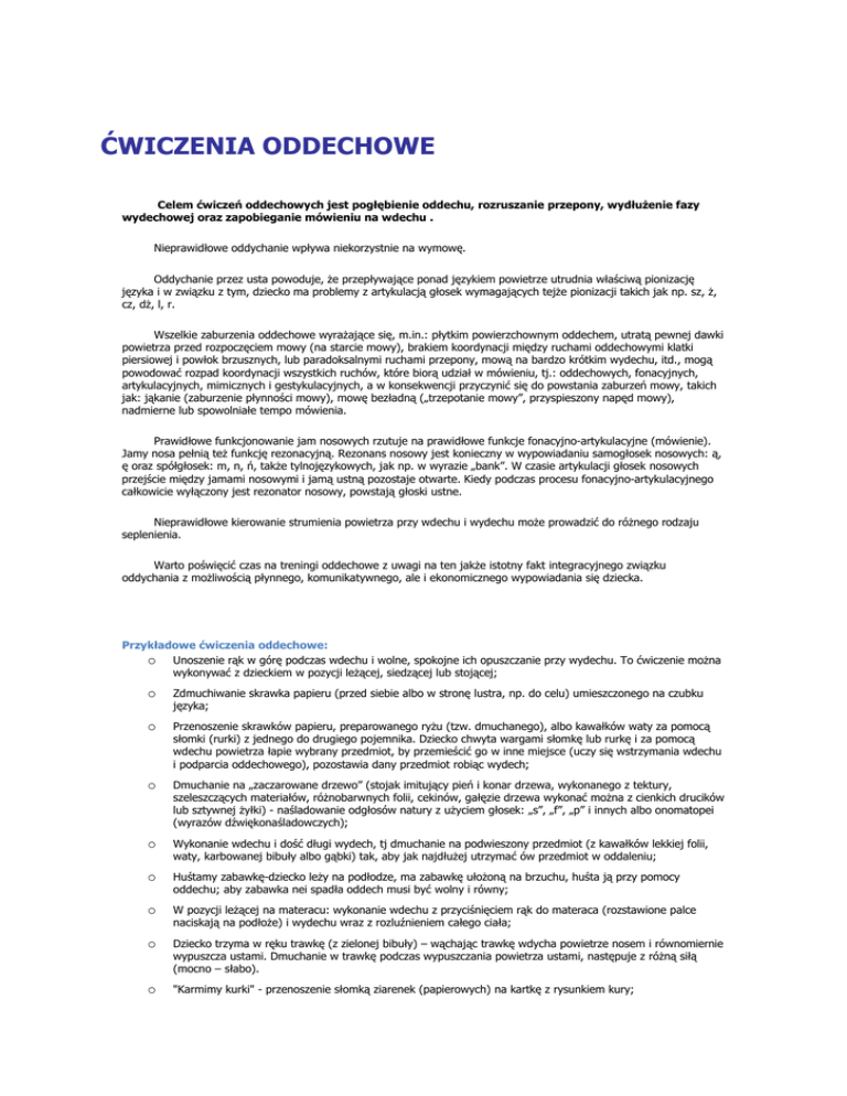 ĆWICZENIA ODDECHOWE Celem ćwiczeń oddechowych jest pogłębienie oddechu, rozruszanie przepony, wydłuŜenie fazy wydechowej oraz zapobieganie mówieniu na wdechu . Nieprawidłowe oddychanie wpływa niekorzystnie na wymowę. Oddychanie przez usta powoduje, Ŝe przepływające ponad językiem powietrze utrudnia właściwą pionizację języka i w związku z tym, dziecko ma problemy z artykulacją głosek wymagających tejŜe pionizacji takich jak np. sz, Ŝ, cz, dŜ, l, r. Wszelkie zaburzenia oddechowe wyraŜające się, m.in.: płytkim powierzchownym oddechem, utratą pewnej dawki powietrza przed rozpoczęciem mowy (na starcie mowy), brakiem koordynacji między ruchami oddechowymi klatki piersiowej i powłok brzusznych, lub paradoksalnymi ruchami przepony, mową na bardzo krótkim wydechu, itd., mogą powodować rozpad koordynacji wszystkich ruchów, które biorą udział w mówieniu, tj.: oddechowych, fonacyjnych, artykulacyjnych, mimicznych i gestykulacyjnych, a w konsekwencji przyczynić się do powstania zaburzeń mowy, takich jak: jąkanie (zaburzenie płynności mowy), mowę bezładną („trzepotanie mowy”, przyspieszony napęd mowy), nadmierne lub spowolniałe tempo mówienia. Prawidłowe funkcjonowanie jam nosowych rzutuje na prawidłowe funkcje fonacyjno-artykulacyjne (mówienie). Jamy nosa pełnią teŜ funkcję rezonacyjną. Rezonans nosowy jest konieczny w wypowiadaniu samogłosek nosowych: ą, ę oraz spółgłosek: m, n, ń, takŜe tylnojęzykowych, jak np. w wyrazie „bank”. W czasie artykulacji głosek nosowych przejście między jamami nosowymi i jamą ustną pozostaje otwarte. Kiedy podczas procesu fonacyjno-artykulacyjnego całkowicie wyłączony jest rezonator nosowy, powstają głoski ustne. Nieprawidłowe kierowanie strumienia powietrza przy wdechu i wydechu moŜe prowadzić do róŜnego rodzaju seplenienia. Warto poświęcić czas na treningi oddechowe z uwagi na ten jakŜe istotny fakt integracyjnego związku oddychania z moŜliwością płynnego, komunikatywnego, ale i ekonomicznego wypowiadania się dziecka. Przykładowe ćwiczenia oddechowe: o Unoszenie rąk w górę podczas wdechu i wolne, spokojne ich opuszczanie przy wydechu. To ćwiczenie moŜna wykonywać z dzieckiem w pozycji leŜącej, siedzącej lub stojącej; o Zdmuchiwanie skrawka papieru (przed siebie albo w stronę lustra, np. do celu) umieszczonego na czubku języka; o Przenoszenie skrawków papieru, preparowanego ryŜu (tzw. dmuchanego), albo kawałków waty za pomocą słomki (rurki) z jednego do drugiego pojemnika. Dziecko chwyta wargami słomkę lub rurkę i za pomocą wdechu powietrza łapie wybrany przedmiot, by przemieścić go w inne miejsce (uczy się wstrzymania wdechu i podparcia oddechowego), pozostawia dany przedmiot robiąc wydech; o Dmuchanie na „zaczarowane drzewo” (stojak imitujący pień i konar drzewa, wykonanego z tektury, szeleszczących materiałów, róŜnobarwnych folii, cekinów, gałęzie drzewa wykonać moŜna z cienkich drucików lub sztywnej Ŝyłki) - naśladowanie odgłosów natury z uŜyciem głosek: „s”, „f”, „p” i innych albo onomatopei (wyrazów dźwiękonaśladowczych); o Wykonanie wdechu i dość długi wydech, tj dmuchanie na podwieszony przedmiot (z kawałków lekkiej folii, waty, karbowanej bibuły albo gąbki) tak, aby jak najdłuŜej utrzymać ów przedmiot w oddaleniu; o Huśtamy zabawkę-dziecko leŜy na podłodze, ma zabawkę ułoŜoną na brzuchu, huśta ją przy pomocy oddechu; aby zabawka nei spadła oddech musi być wolny i równy; o W pozycji leŜącej na materacu: wykonanie wdechu z przyciśnięciem rąk do materaca (rozstawione palce naciskają na podłoŜe) i wydechu wraz z rozluźnieniem całego ciała; o Dziecko trzyma w ręku trawkę (z zielonej bibuły) – wąchając trawkę wdycha powietrze nosem i równomiernie wypuszcza ustami. Dmuchanie w trawkę podczas wypuszczania powietrza ustami, następuje z róŜną siłą (mocno – słabo). o "Karmimy kurki" - przenoszenie słomką ziarenek (papierowych) na kartkę z rysunkiem kury; o Moja lalka śpi, uciszmy otoczenie: ciiiiii.... o Chuchamy na zmarznięte ręce: chuuuuu, chuuuuu.... o Z balonika ucieka powietrze: ssssssssssss... o Szumi wiatr: szszszsz...-raz ciszej, raz głośniej o Kosimy trawę: wdech i ......ciach!, wdech i ......ciach! o Rąbiemy drewno: wdech i .....trrrach!, wdech i...trrrach! o Lokomotywa: wypuszcza parę: pssss, szszszsz,ffff; jedzie: czczczc, szszszs; pędzi: tuf, tuf, tuf, to-tak, to-totak; hamuje: psssss; o Zabawy ze słomką i woda w szklance: słomkę wkładamy do szklanki z woda lub sokiem i nie dotykając powierzchni płynu wydmuchujemy w wodzie dołek; zanurzamy słomkę w wodzie i dmuchamy, wywołując bąbelki-tak aby woda „zagotowała się”, o Dmuchamy na wiatraczki; o Bawimy się płomieniem świecy: dmuchamy delikatnie i długo, tak aby płomień „zatańczył”; staramy się zdmuchnąć płomień z duŜej odległości; zdmuchujemy kilka świeczek jednocześnie; o Dmuchamy na piórko – czyje piórko poleci wyŜej; o Puszczamy bańki mydlane; o Nadmuchujemy baloniki; o Gramy na róŜnych instrumentach takich jak flet, harmonijka, trąbka itp; o Śpiewamy piosenki, recytujemy.