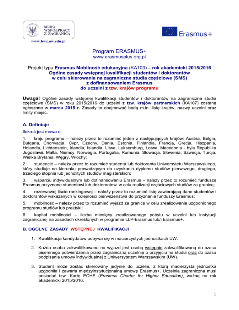 www.bwz.uw.edu.pl Program ERASMUS+ www.erasmusplus.org.pl Projekt typu Erasmus Mobilność edukacyjna (KA103) – rok akademicki 2015/2016 Ogólne zasady wstępnej kwalifikacji studentów i doktorantów w celu skierowania na zagraniczne studia częściowe (SMS) z dofinansowaniem Erasmus do uczelni z tzw. krajów programu Uwaga! Ogólne zasady wstępnej kwalifikacji studentów i doktorantów na zagraniczne studia częściowe (SMS) w roku 2015/2016 do uczelni z tzw. krajów partnerskich (KA107) zostaną ogłoszone w marcu 2015 r. Zasady te obejmować będą m.in. listę krajów, nazwy uczelni oraz limity miejsc. A. Definicje Ilekroć jest mowa o: 1. kraju programu – należy przez to rozumieć jeden z następujących krajów: Austria, Belgia, Bułgaria, Chorwacja, Cypr, Czechy, Dania, Estonia, Finlandia, Francja, Grecja, Hiszpania, Holandia, Lichtenstein, Irlandia, Islandia, Litwa, Luksemburg, Łotwa, Macedonia - była Republika Jugosławii, Malta, Niemcy, Norwegia, Portugalia, Rumunia, Słowacja, Słowenia, Szwecja, Turcja, Wielka Brytania, Węgry, Włochy; 2. studencie – należy przez to rozumieć studenta lub doktoranta Uniwersytetu Warszawskiego, który studiuje na kierunku prowadzącym do uzyskania dyplomu studiów pierwszego, drugiego, trzeciego stopnia lub jednolitych studiów magisterskich; 3. wsparciu indywidualnym lub dofinansowaniu Erasmus – należy przez to rozumieć fundusze Erasmus przyznane studentowi lub doktorantowi w celu realizacji częściowych studiów za granicą; 4. rezerwowej liście rankingowej – należy przez to rozumieć listę zawierającą dane studentów i doktorantów wskazanych w kolejności pierwszeństwa do przyznania funduszy Erasmus; 5. mobilność – należy przez to rozumieć wyjazd za granicę w celu zrealizowania uzgodnionego programu studiów lub praktyki; 6. kapitał mobilności – liczba miesięcy zrealizowanego pobytu w uczelni lub instytucji zagranicznej na zasadach określonych w programie LLP-Erasmus lub/i Erasmus+. B. OGÓLNE ZASADY WSTĘPNEJ KWALIFIKACJI 1. Kwalifikacja kandydatów odbywa się w macierzystych jednostkach UW. 2. Każda osoba zakwalifikowana na wyjazd jest osobą wstępnie zakwalifikowaną do czasu pisemnego potwierdzenia przez zagraniczną uczelnię o przyjęciu na studia oraz do czasu podpisania umowy indywidualnej z Uniwersytetem Warszawskim (UW). 3. Student może zostać skierowany jedynie do uczelni, z którą macierzysta jednostka uzgodniła i zawarła międzyinstytucjonalną umowę Erasmus+. Uczelnia zagraniczna musi posiadać tzw. Kartę ECHE (Erasmus Charter for Higher Education), ważną na rok akademicki 2015/2016. 1 4. Kwalifikacja studentów odbywa się zgodnie z ustaleniami między uczelniami, dotyczącymi w szczególności: liczby studentów podlegających wymianie, długości okresu studiów (np. 1 lub 2 semestry), stopnia studiów (np. pierwszego lub drugiego), poziomu znajomości uzgodnionego języka wykładowego. 5. W celu przeprowadzenia kwalifikacji dziekan/kierownik jednostki powołuje w formie pisemnej komisję kwalifikacyjną, zwaną dalej Komisją. W podstawowy skład Komisji wchodzą: koordynator ds. mobilności, pracownik danej jednostki UW, przedstawiciel Samorządu Studentów. 6. Szczegółowe zasady kwalifikacji studentów w poszczególnych jednostkach UW określa Komisja. Informacje o zasadach i kryteriach ubiegania się o fundusze Erasmus, uczelniach partnerskich, liczbie miejsc, okresie trwania studiów, poziomie studiów, języku wykładowym, wymaganych od kandydatów dokumentach, terminie i miejscu składania dokumentów, zasadach zwolnienia z opłat za studia na czas skierowania na zagraniczne studia częściowe, składzie komisji, trybie i terminie odwołań, będą podane w sposób przejrzysty do publicznej wiadomości na stronie internetowej ze wskazaniem daty zamieszczenia na stronie. 7. Podstawowymi kryteriami kwalifikacji studentów są: średnia ocen i znajomość właściwego języka obcego oraz poziom jego znajomości (zgodnie z umową międzyinstytucjonalną Erasmus+). Komisja ma prawo do zastosowania dodatkowych kryteriów pod warunkiem ich powszechnego ogłoszenia przed rozpoczęciem procesu kwalifikacji. Zaleca się, aby pierwszeństwo w przyznaniu funduszy Erasmus mieli kandydaci ubiegający się o nie po raz pierwszy. 8. Komisja decyduje, w jaki sposób i na podstawie jakich dokumentów oceniane są kompetencje językowe kandydatów. Podejmując decyzję, Komisja kieruje się także wskazaniami zagranicznej uczelni partnerskiej co do wymaganego przez nią dokumentu potwierdzającego właściwy poziom znajomości właściwego języka. 9. O fundusze Erasmus mogą ubiegać się wszyscy studenci (niezależnie od obywatelstwa, z zastrzeżeniem pkt.11), którzy są studentami UW przyjętymi na studia prowadzące do uzyskania dyplomu studiów pierwszego, drugiego, trzeciego stopnia lub jednolitych studiów magisterskich. Student posiadający obywatelstwo inne niż państwa członkowskiego Unii Europejskiej lub Europejskiego Obszaru Gospodarczego powinien sprawdzić zasady odnoszące się do wjazdu na terytorium kraju przyjmującego w związku z planowanym tam pobytem jako uczestnik programu Erasmus. 10. O fundusze Erasmus mogą ubiegać się studenci studiów zarówno stacjonarnych, jak i niestacjonarnych. 11. W kwalifikacji mogą uczestniczyć studenci przynajmniej drugiego roku studiów I stopnia, przynajmniej drugiego roku jednolitych studiów magisterskich, pierwszego roku studiów II stopnia oraz uczestnicy studiów doktoranckich UW. W wyjątkowych i uzasadnionych przypadkach (np. w ramach wspólnie prowadzonych studiów z uczelnią zagraniczną na podstawie zawartego odrębnego porozumienia) do kwalifikacji mogą przystąpić studenci pierwszego roku każdego stopnia studiów. 12. W kwalifikacji mogą uczestniczyć studenci trzeciego roku studiów I stopnia, pod warunkiem udokumentowania przed wyjazdem, że zostali przyjęci przez Uniwersytet Warszawski na studia drugi