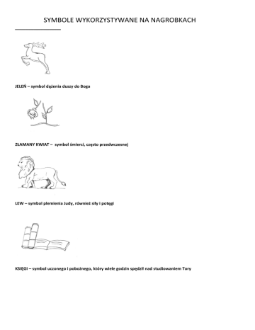 SYMBOLE WYKORZYSTYWANE NA NAGROBKACH JELEO – symbol dążenia duszy do Boga ZŁAMANY KWIAT – symbol śmierci, często przedwczesnej LEW – symbol plemienia Judy, również siły i potęgi KSIĘGI – symbol uczonego i pobożnego, który wiele godzin spędził nad studiowaniem Tory KORONA – reprezentuje różne aspekty Tory jako boskiego Prawa i Nauki a także pozytywne cechy człowieka (zwłaszcza pobożnośd, uczonośd, dobrod) i nagrodę za pobożne życie ŚWIATŁO, SŁOOCE – symbolizuje m.in. moc Boga jako Stwórcy, nadejścia Mesjasza; zachodzące słooce to koniec życia MISA I DZBAN – znak nagrobny oznaczający lewitów (hebr. lewim), pomocników kapłanów, potomków rodu Lewiego ZWOJE TORY – symbol uczonego znającego Torę i pobożności WĄŻ – posiada bardzo różną tematykę: owinięty wokół słupa (Eskulap) oznacza lekarze, pochwycony np. przez orła symbolizuje pokonane zło, zjadający własny ogon – utożsamia nieśmiertelnośd ZŁAMANE DRZEWO – symbol śmierci, kooca życia DĄB PŁACZU – symbol m.in. przemijalności życia MOTYL – symbol wędrującej duszy GWIAZDA DAWIDA – (hebr. Magen Dawid - Tarcza Dawida) – symbol judaizmu GOŁĄB – symbol pokoju, często na pomnikach oznacza zgodę i miłośd małżeoską KLEPSYDRA ZE SKRZYDŁAMI – symbol przemijania czasu