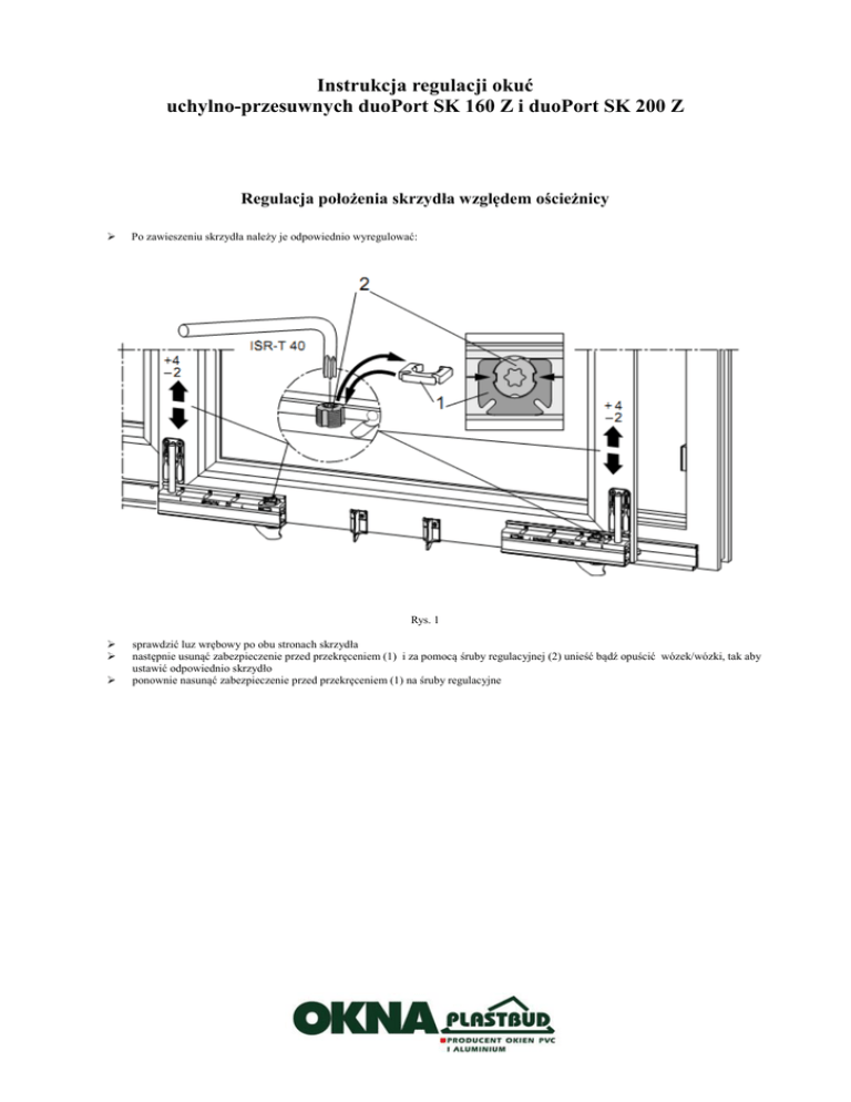 Instrukcja regulacji okuć uchylno-przesuwnych duoPort SK 160 Z i duoPort SK 200 Z Regulacja położenia skrzydła względem ościeżnicy Po zawieszeniu skrzydła należy je odpowiednio wyregulować: Rys. 1 sprawdzić luz wrębowy po obu stronach skrzydła następnie usunąć zabezpieczenie przed przekręceniem (1) i za pomocą śruby regulacyjnej (2) unieść bądź opuścić wózek/wózki, tak aby ustawić odpowiednio skrzydło ponownie nasunąć zabezpieczenie przed przekręceniem (1) na śruby regulacyjne Instrukcja regulacji okuć uchylno-przesuwnych duoPort SK 160 Z i duoPort SK 200 Z Regulacja równoległości wózków Zamknąć skrzydło poprzez obrót klamki. Śrubę zaciskową na pręcie łączącym (1) jeszcze raz poluzować a następnie ponownie dokręcić. Moment dociągający: 7 Nm Rys 2 Wskazówka: Poluzowanie śruby zaciskowej zapobiega ewentualnym naprężeniom pręta łączącego. Sprawdzić, czy pręt łączący znajduje się w takiej samej odległości od ramy na całej swojej długości. Zapewni to prawidłowe funkcjonowanie skrzydła. Instrukcja regulacji okuć uchylno-przesuwnych duoPort SK 160 Z i duoPort SK 200 Z Montaż/Regulacja elementów sterujących Element sterujący (1) po stronie klamki wypozycjonować ok. 78 mm od końca prowadnicy dolnej (2). Śrubę regulacyjną (2) lekko dokręcić. (ISR-T 25, maks. 1 Nm). Skrzydło ustawić w pozycji uchylnej i sprawdzić luz wrębowy po obu stronach (12 mm). W razie konieczności ponownie ustalić położenie elementu sterującego. Maksymalnie dokręcić obie śruby regulacyjne elementu sterującego (ISR-T 25, maks. 4 Nm). Rys. 3. Instrukcja regulacji okuć uchylno-przesuwnych duoPort SK 160 Z i duoPort SK 200 Z Montaż/Regulacja Zderzaków (patrz Rys. 4) Zderzak dolny (5) umieścić w prowadnicy ramowej (4) i przykręcić w zależności od wymaganej szerokości otwarcia skrzydła. Moment dociągający: 3 Nm Otworzyć skrzydło i maksymalnie przesunąć w kierunku zderzaka (5). Zderzak górny (1) umieścić w prowadnicy ramowej górnej i dosunąć do ślizgacza (2). Przykręcić zderzak (1). Moment dociągający: 4 Nm Rys. 4 Rys. 5 Montaż zabezpieczeń wózków (patrz Rys. 5) Zabezpieczenia wózków należy zamontować przed pierwszym uruchomieniem skrzydła. Zabezpieczenie wózka (1) należy wsunąć do pozycji końcowej (2), w której następuje odpowiednie zaciśnięcie się elementu. Uwaga!: Jeśli zabezpieczenie wózka nie zostanie zamontowane lub zostanie zamontowane niezgodnie z przedstawionym obok rysunkiem, skrzydło okienne nie będzie odpowiednio zabezpieczone. Instrukcja regulacji okuć uchylno-przesuwnych duoPort SK 160 Z i duoPort SK 200 Z Montaż osłon dolnych Zaślepki (1) nałożyć po obu stronach prowadnicy ramowej górnej (2). 2. Odpowiednią długość profilu maskującego (6) zaznaczyć na podstawie nacięć na wózkach (4). (- 0 mm / + 2 mm) Przyciąć i zamocować (poprzez wciśnięcie) profil maskujący (6). Założyć osłony dolne (5) na elementy wzmacniające (3) po obu stronach. Rys. 6 Pozycja klamki duoPort SK 160 Z i duoPort SK 200 Z – ze sterowaniem w klamce a) b) c) d) zaryglowane uchylone przesuwanie bez ryglowania przesuwanie z ryglowaniem Wskazówka!: Ustawienie klamki wewnętrznej w pozycji c „przesuwanie bez ryglowania” umożliwia domknięcie skrzydła uchylnoprzesuwnego od zewnątrz, jeśli nie została zamontowana klamka zewnętrzna. Takie ustawienie klamki zapobiega niekontrolowanemu ustawieniu się skrzydła w pozycji uchyłu. Źródłem informacji są katalogi ze strony WINKHAUS: www.winkhaus.com.pl/Okienna/Katalogi/default.asp
