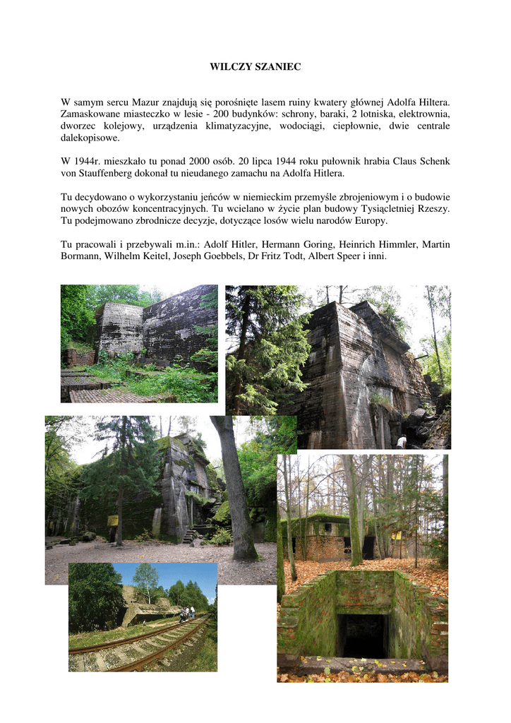 WILCZY SZANIEC W samym sercu Mazur znajdują się porośnięte lasem ruiny kwatery głównej Adolfa Hiltera. Zamaskowane miasteczko w lesie - 200 budynków: schrony, baraki, 2 lotniska, elektrownia, dworzec kolejowy, urządzenia klimatyzacyjne, wodociągi, ciepłownie, dwie centrale dalekopisowe. W 1944r. mieszkało tu ponad 2000 osób. 20 lipca 1944 roku pułownik hrabia Claus Schenk von Stauffenberg dokonał tu nieudanego zamachu na Adolfa Hitlera. Tu decydowano o wykorzystaniu jeńców w niemieckim przemyśle zbrojeniowym i o budowie nowych obozów koncentracyjnych. Tu wcielano w życie plan budowy Tysiącletniej Rzeszy. Tu podejmowano zbrodnicze decyzje, dotyczące losów wielu narodów Europy. Tu pracowali i przebywali m.in.: Adolf Hitler, Hermann Goring, Heinrich Himmler, Martin Bormann, Wilhelm Keitel, Joseph Goebbels, Dr Fritz Todt, Albert Speer i inni.