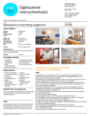 Ogłoszenie nieruchomości HC24 Nuremberg Adam-Klein-Straße 32 90429 Nürnberg Poniedziałek – Piątek: 8.00 – 17.00 Telefon: +49 (0)911-288308 Faks: +49 (0)911-288302 [email protected] www.hc24.de www.hc24.de/pl/object_nu-29186.htm Obiekt Numer obiektu Mieszkanie w Nürnberg-Galgenhof 29186 Dane obiektu Rodzaj Pokój Powierzchnia Floor Mieszkania 2 Pokój 58 m² 0 Wolne od Wolne do Co najmniej Max. persons pets 19.10.2016 bezterminowo 3 Months 2 pets are not allowed Czynsz 895,- €/miesięcznie Additional cost plus electricity, gas, Internet 30,-€, GEZ fees and 150,-€ final cleaning fee. Kaucja 2 500,- € Szczegóły obiektu mieszkanie 2-pokojowe umeblowany nowo wyremontowane komórka piwniczna centralnie po?o?one Sprawdzone przez HC stara zabudowa dom wielorodzinny The property is rented since 19.10.2016. Contact: Tel. +49 911 2883 08 Wyposażenie bielizna po?cielowa kuchnia zabudowana naczynia osobny WC ??cze telefoniczne pralka ekskluzywne wyposa?enie ogrzewanie gazowe eta?owe prysznic ?ó?ko francuskie r?czniki osobna kuchnia telewizor internet pod?oga z p?ytek ceramicznych gara? Świadectwo energetyczne Informacje dotyczące świadectwa energetycznego nie są potrzebne - budynek znajduje się pod ochroną zabytków. Fees Our brokerage service for this property is free of commission according to § 2 par. 1a of the Law for brokerage of apartments. There are also no other fees (eg for a visit, the lease contract, etc.). Exposição imprimida aos 02.03.2017 Powered by TCPDF (www.tcpdf.org) Opis Erstbezug einer im September 2016 neu renovierten, hochwertig möblierten 2-Zimmer-Wohnung mit Internet und optionalem Tiefgaragenstellplatz, nur 2 Gehminuten vom Hauptbahnhof entfernt. Die Möblierung des großzügig gestalteten, hellen Wohnzimmers besteht aus einer dunklen Eckledercouch, FLAT TV, runden Esstisch und 3 Stühlen. Das mit Vollholzmöbeln eingerichtete, zum Innenhof gelegene Schlafzimmer mit einem 1,60 m breiten, französischen Bett und einem Kleiderschrank eignet sich auch hervorragend für Allergiker. Die moderne Einbauküche in rot ist mit allen Utensilien des täglichen Bedarfs ausgestattet wie Backofen, Cerankochfeld, Kühl-Gefrier-Kombi, Kaffeemaschine, Dunstabzug, Wasserkocher, Backofen etc. Das helle Tageslichtbad verfügt über eine ebenerdige Glasdusche, Waschbecken, WC und Waschmaschine. Die Wohnung ist komplett gefliest. Nur wenige Gehminuten zur U-Bahn und zur Straßenbahn Linie 5. Ein Fahrradkeller und ein eigenes Kellerabteill gehören ebenfalls zur Wohnung. Im Flur befindet sich eine Garderobe und eine Spiegel. Zuzüglich 30,00 € für Internet und Flatrate ins deutsche Festnetz. Ein optionaler Duplex-Garagenplatz lediglich 3 Gehminuten entfernt kann für 40,00 € pro Monat angemietet werden. Die einmalige Endreinigungsgebühr beträgt bei Auszug 150,00 €. Zu der angegebenen Miete kommen nur noch Strom und Gas nach Verbrauch hinzu. GEZ ist Mietersache. Hinweis: Rauchen ist im Wohnraum nicht erlaubt.
