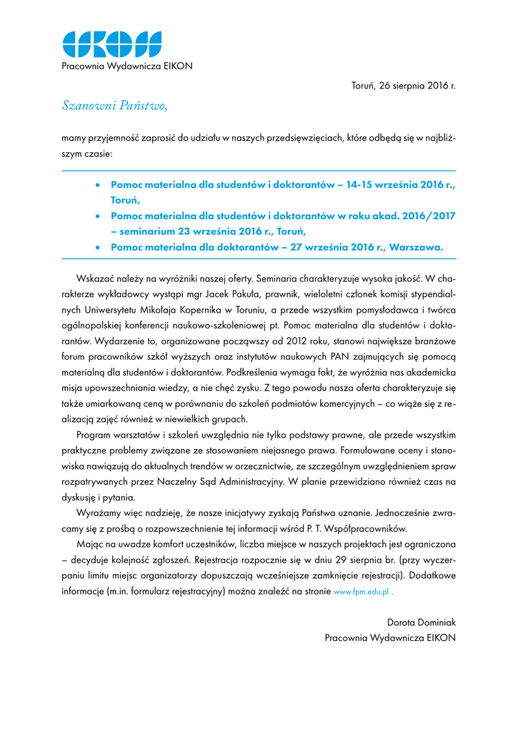 Pracownia Wydawnicza EIKON Toruń, 26 sierpnia 2016 r. Szanowni Państwo, mamy przyjemność zaprosić do udziału w naszych przedsięwzięciach, które odbędą się w najbliższym czasie: • Pomoc materialna dla studentów i doktorantów – 14-15 września 2016 r., Toruń, • Pomoc materialna dla studentów i doktorantów w roku akad. 2016/2017 – seminarium 23 września 2016 r., Toruń, • Pomoc materialna dla doktorantów – 27 września 2016 r., Warszawa. Wskazać należy na wyróżniki naszej oferty. Seminaria charakteryzuje wysoka jakość. W charakterze wykładowcy wystąpi mgr Jacek Pakuła, prawnik, wieloletni członek komisji stypendialnych Uniwersytetu Mikołaja Kopernika w Toruniu, a przede wszystkim pomysłodawca i twórca ogólnopolskiej konferencji naukowo-szkoleniowej pt. Pomoc materialna dla studentów i doktorantów. Wydarzenie to, organizowane począwszy od 2012 roku, stanowi największe branżowe forum pracowników szkół wyższych oraz instytutów naukowych PAN zajmujących się pomocą materialną dla studentów i doktorantów. Podkreślenia wymaga fakt, że wyróżnia nas akademicka misja upowszechniania wiedzy, a nie chęć zysku. Z tego powodu nasza oferta charakteryzuje się także umiarkowaną ceną w porównaniu do szkoleń podmiotów komercyjnych – co wiąże się z realizacją zajęć również w niewielkich grupach. Program warsztatów i szkoleń uwzględnia nie tylko podstawy prawne, ale przede wszystkim praktyczne problemy związane ze stosowaniem niejasnego prawa. Formułowane oceny i stanowiska nawiązują do aktualnych trendów w orzecznictwie, ze szczególnym uwzględnieniem spraw rozpatrywanych przez Naczelny Sąd Administracyjny. W planie przewidziano również czas na dyskusję i pytania. Wyrażamy więc nadzieję, że nasze inicjatywy zyskają Państwa uznanie. Jednocześnie zwracamy się z prośbą o rozpowszechnienie tej informacji wśród P. T. Współpracowników. Mając na uwadze komfort uczestników, liczba miejsce w naszych projektach jest ograniczona – decyduje kolejność zgłoszeń. Rejestracja rozpocznie się w dniu 29 sierpnia br. (przy wyczerpaniu limitu miejsc organizatorzy dopuszczają wcześniejsze zamknięcie rejestracji). Dodatkowe informacje (m.in. formularz rejestracyjny) można znaleźć na stronie www.fpm.edu.pl . Dorota Dominiak Pracownia Wydawnicza EIKON Warsztaty Pomoc materialna dla studentów i doktorantów Data: 14-15 września 2016 r. (I dzień: 10.00-16.00; II dzień: 9.00-15.00) Miejsce: Hotel Toruń Mercure Centrum, ul. Kraszewskiego 1/3, 87-100 Toruń Warsztaty adresowane są do osób, które rozpoczynają pracę w zakresie przyznawania stypendiów i zapomóg, jak również powracają do niej po dłuższej przerwie. Zakłada się udział 12 osób w ramach grupy. Wyróżnikiem jest tu udostepnienie uczestnikom wniosków wraz z dokumentacją, na podstawie których będą prezentowane i omawiane mechanizmy przyznawania pomocy materialnej. Obok treści podstawowych zaprezentowane zostaną również zagadnienia problematyczne wraz z propozycjami rozwiązań, w oparciu o aktualny stan prawny i orzecznictwo. Program uwzględnia m.in. takie zagadnienia jak: »» budowa i struktura funduszu pomocy materialnej, »» system organów przyznających stypendia i zapomogi, »» status studenta i doktoranta a prawo do pomocy materialnej, »» stypendium socjalne i tzw. dopłata mieszkaniowa – z uwzględnieniem zasad obliczania dochodu w rodzinie, »» stypendium rektora dla najlepszych studentów i stypendium dla najlepszych doktorantów, »» stypendium specjalne dla osób niepełnosprawnych, »» zapomogi. Wykładowca JACEK PAKUŁA – prawnik, absolwent Wydziału Prawa i Administracji UMK w Toruniu, pomysłodawca toruńskiej konferencji szkoleniowej pt. Pomoc materialna dla studentów i doktorantów. Autor opinii prawnych, artykułów prasowych (Dziennik Gazeta Prawna, Rzeczpospolita) i publikacji naukowo-szkoleniowych z zakresu pomocy materialnej, m.in. Pomoc materialna dla studentów. Podręczny komentarz. Przegląd orzecznictwa. Wzory pism (Toruń 2014). Udział w seminarium obejmuje dwa warianty. Pierwszy z nich – 800 zł. (VAT zw.) – zawiera: »» udział w warsztatach; »» certyfikat i materiały szkoleniowe; »» wyżywienie (całodzienny serwis kawowy i dwa obiady) »» zwiedzanie toruńskiej starówki pod opieką przewodnika w dniu 14 września br. Wariant drugi – 950 zł. (VAT zw.) – obejmuje wariant pierwszy oraz nocleg (z 14 na 15 września br.) w pok. 1 os. ze śniadaniem w hotelu Mercure Toruń Centrum. Opłata za uczestnictwo w warsztatach powinna być uiszczona do dnia 9 września 2016 r. na konto: Pracownia Wydawnicza EIKON Dorota Dominiak 07 1140 2004 0000 3102 7572 9963 z dopiskiem: Warsztaty FPM + imię i nazwisko + jednostka (np. Warsztaty FPM Jacek Pakuła, UMK w Toruniu). Kontakt: trener mgr Jacek Pakuła, tel. 604 64 35 54, e-mail: [email protected], www.fpm.edu.pl Seminarium Pomoc materialna dla studentów i doktorantów w roku akad. 2016/2017 Data: 23 września 2016 r. (godz. 10.00-16.00) Miejsce: Hotel Toruń Mercure Centrum, ul. Kraszewskiego 1/3, 87-100 Toruń Seminarium adresowane jest do osób, które zajmują się przyznawaniem pomocy materialnej dla studentów i doktorantów. Program uwzględnia najnowsze zmiany w prawie, jak również aktualny przegląd orzecznictwa sądów administracyjnych. Jednodniowa formuła pozwala w sposób dogodny zaprezentować kwestie ważne przy procesie przyznawania pomocy materialnej, bez potrzeby generowania dłuższej nieobecności w pracy. Termin seminarium został zaś tak zakreślony, ażeby możliwe było rozwianie wątpliwości i uporządkowanie wiedzy jeszcze przed rozpoczęciem nowego roku akademickiego. Program uwzględnia m.in. takie zagadnienia jak: »» autonomia szkolnictwa wyższego a orzekanie w sprawach z zakresu pomocy materialnej, »» odpowiednie stosowanie Kodeksu postępowania administracyjnego w sprawach z zakresu pomoc
