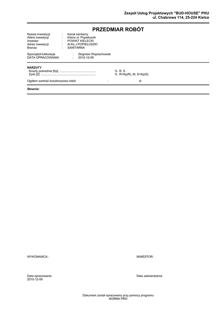 Zespół Usług Projektowych "BUD-HOUSE" PHU ul. Chabrowa 114, 25-224 Kielce PRZEDMIAR ROBÓT Nzawa inwestycji Aders inwestycji Inwestor Adres inwestycji BranŜa Sporządził kalkulacje DATA OPRACOWANIA : : : : : Kanał sanitarny Kielce ul. Popiełuszki POWIAT KIELECKI Al.Ks.J.POPIEŁUSZKI SANITARNA : : Zbigniew Wojciechowski 2010-12-09 NARZUTY Koszty pośrednie [Kp] ............................................ Zysk [Z] .................................................................. Ogółem wartość kosztorysowa robót % R, S % R+Kp(R), M, S+Kp(S) : zł Słownie: WYKONAWCA : INWESTOR : Data opracowania 2010-12-09 Data zatwierdzenia Dokument został opracowany przy pomocy programu NORMA PRO KS PopiełuszkiKSnetto Lp. 1 1.1 1 d.1. 1 KSIĄśKA PRZEDMIARÓW Podst Opis i wyliczenia j.m. KANALIZACJA SANITARNA GRAWITACYJNA Roboty przygotowawcze Roboty pomiarowe przy liniowych robotach ziemnych - trasa kolei w terenie pa- km KNR 2-01 górkowatym lub podgórskim 0119-02 0.814 km 1.2 Roboty ziemne 2 KNR 2-01 Usunięcie warstwy ziemi urodzajnej (humusu) o grubości do 15 cm za pomocą m2 d.1. 0126-01 spycharek 2 1.5*814 m2 3 KNR 2-01 d.1. 0125-03 2 4 KNR 2-01 d.1. 0317-02 2 5 KNR 2-01 d.1. 0202-05 2 1*789 m2 Wykopy liniowe pod fundamenty, rurociągi, kolektory w gruntach suchych kat.III-IV z wydobyciem urobku łopatą lub wyciągiem ręcznym głębokość do 1.5 m - szerokość 0.8-1.5 m 0.5*789*1.2 m3 8 KNR 2-01 d.1. 0320-04 2 9 KNR 2-01 d.1. 0236-02 2 10 KNR 2-01 d.1. 0415-02 2 11 KNR 2-01 d.1. 0510-01 2 0.814 RAZEM 0.814 1221.000 RAZEM 1221.000 789.000 RAZEM 789.000 m3 473.400 RAZEM 473.400 2958.750 RAZEM 2958.750 1578.000 RAZEM 1578.000 240.000 RAZEM 240.000 2320.010 RAZEM 2320.010 2959.000 RAZEM 2959.000 24.000 RAZEM 24.000 1183.500 RAZEM 1183.500 21.000 RAZEM 21.000 520.740 RAZEM 520.740 Roboty ziemne wykon.koparkami przedsiębiernymi o poj.łyŜki 0.60 m3 w m3 gr.kat.III z transp.urobku samochod.samowyładowczymi na odległość do 1 km m3 Pełne umocnienie pionowych ścian wykopów liniowych o głębok.do 3.0 m wy- m2 praskami w grunt.suchych kat.III-IV wraz z rozbiór.(szer.do 1m) m2 789*2 7 KNR 2-01 d.1. 0230-01 2 Razem Ręczne usunięcie warstwy ziemi urodzajnej (humusu) o grubości do 15 cm bez m2 darni z przewozem taczkami 1.5*2.5*789 6 KNR 2-01 d.1. 0322-02 2 Poszcz Zasypywanie wykopów spycharkami z przemieszczeniem gruntu na odl. do 10 m3 m w gruncie kat. I-III 240 m3 Zasypywanie wykopów liniowych o ścianach pionowych głębokości do 3 m kat.gr.I-II - szerokość 0.8-1.5 m m3 2959-(2*3.14*0.125*814) m3 Zagęszczenie nasypów ubijakami mechanicznymi; grunty spoiste kat. III-IV m3 2959 m3 Rozplantowanie ręczne ziemi wydobytej z wykopów - za 1 m3 ziemi wzdłuŜ 1 m krawędzi wykopu - kat.gr.III m3 240*0.1 m3 Humusowanie skarp z obsianiem przy grub.warstwy humusu 5 cm m2 789*1.5 m2 12 KNR-W 4-01 Pomost drewniany nad wykopem wraz z rozbiórką d.1. 0107-08 2 3*3.5*2 1.3 Roboty technologiczne -montaŜowe 13 KNR 2-18 Kanały rurowe - podłoŜa z materiałów sypkich o grub.20 cm (podsypka + obd.1. 0501-03 sypka) 3 789*1.2*0.55 14 KNR-W 2-18 Kanały z rur polietylenowych typu WEHOLITE-SPIRO o śr. nominalnej 280 d.1. 0407-01 mm - wykopy umocnione - rury o dł. 6.0 m 3 z.sz.3.4. 9908 uwaga p.tab. analogia -2- Norma PRO Wersja 4.06 Licencja: 3070 dla F.P.H.U "Eko-Dom" Spółka z.o.o. m2 m2 m2 m2 m KS PopiełuszkiKSnetto Lp. Podst KSIĄśKA PRZEDMIARÓW Opis i wyliczenia 813.5 15 KNR 2-18 d.1. 0613-03 3 16 KNR 2-18 d.1. 0613-04 3 j.m. m Studnie rewizyjne z kręgów betonowych o śr.1200 mm w gotowym wykopie o głębok. 3m stud. 19 stud. Poszcz 813.500 RAZEM 19.000 RAZEM [0.5 m] stud. m3 18 KNR-W 2-18 Powłoka izolacyjna pionowych powierzchni murowanych i betonowych z lepiku m2 d.1. 0613-03 asfaltowego na zimno - pierwsza warstwa 3 3.14*0.95*0.95*19 m2 Dwuwarstwowa powłoka izolacyjna z lepiku asfaltowego na zimno pionowych powierzchni betonowych i murowanych m2 3.14*0.95*0.95*19 m2 2.000 RAZEM 2.000 53.843 RAZEM 53.843 53.843 RAZEM 53.843 2.000 RAZEM 2.000 9.000 RAZEM 9.000 5.000 RAZEM 5.000 10.000 RAZEM 10.000 38.000 RAZEM 38.000 Układanie mieszanki betonowej ręczne w konstrukcjach - ławy fundamentowe, m3 bloki oporowe (obsadzenie włazu) m3 2 21 KNR-W 2-18 MontaŜ konstrukcji podwieszeń kabli energetycznych i telekomunikacyjnych ty- kpl. d.1. 0901-01 pu lekkiego o rozpiętości elementu 4.0 m 3 9 kpl. 22 KNR-W 2-18 MontaŜ konstrukcji podwieszeń kabli energetycznych i telekomunikacyjnych ty- kpl. d.1. 0902-01 pu cięŜkiego o rozpiętości elementu 4.0 m 3 5 kpl. 23 KNR-W 2-18 MontaŜ konstrukcji podwieszeń rurociągów i kanałów o rozpiętości elementu d.1. 0903-01 4.0 m 3 10 kpl. 24 KNR 0-36 Uszczelnienie przejść instalacyjnych d.1. 1115-01 3 kalk. własna-analogia 19*2 kpl. 25 KNR-W 2-18 Próba wodna szczelności kanałów rurowych o śr.nominalnej 250 mm d.1. 0706-03 3 analogia 813.2/200 odc. -1 prób. kpl. kpl. odc. -1 prób. 4.066 RAZEM 26 KNR 2-18 d.1. 0409-04 3 4.066 Przewierty o dług.do 30 m maszyną do wierceń poziomych WP 30/60 rurami o m śr.300-600mm w gruntach kat.III-IV (stal. 406/10 mm) 36 27 KNR 2-18 d.1. 0412-01 3 -19.000 Mieszanka betonowa gęstoplastyczna B-15 wytwarzana w betoniarce 500 dm3 m3 2 20 KNR 2-18 d.1. 0609-01 3 analogia 19.000 -19.000 RAZEM 19 KNR 2-18 d.1. 0721-04 3 analogia 813.500 Studnie rewizyjne z kręgów betonowych o śr.1200 mm w gotowym wykopie za [0.5 m] kaŜde 0.5 m róŜnicy głęb. stud. -19 17 KNKRB 6 d.1. 0905-05 3 Razem m 36.000 RAZEM 36.000 36.000 RAZEM 36.000 Przeciaganie rurociągów przewodowych o śr.nominalnej 100-300 mm w rurach m ochronnych 36 m 28 S-219 1400- Rury ochronne (osłonowe) z tworzyw o śr.nom. 75 mm na gazie 25 mm d.1. 03 3 3 -3- Norma PRO Wersja 4.06 Licencja: 3070 dla F.P.H.U "Eko-Dom" Spółka z.o.o. m m 3.000 KS PopiełuszkiKSnetto Lp. Podst KSIĄśKA PRZEDMIARÓW Opis i wyliczenia j.m. 29 S-219 1400- Rury ochronne (osłonowe) z tworzyw o śr.nom. 200 mm na gazie 150 mm d.1. 10 3 3 m 30 S-219 140