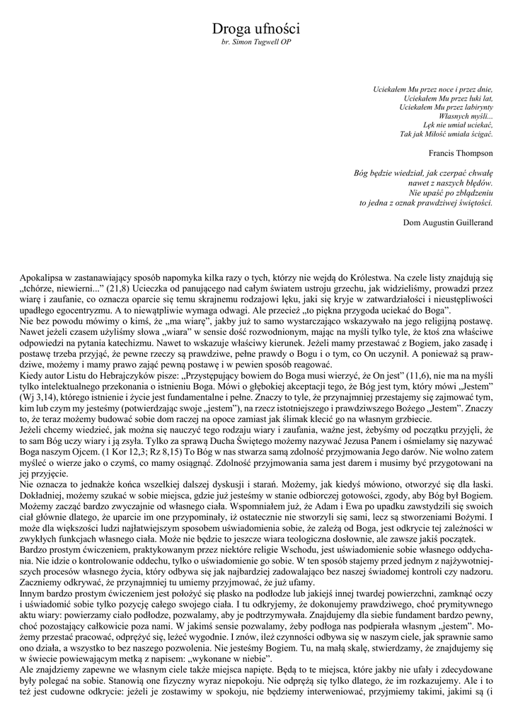 Droga ufności br. Simon Tugwell OP Uciekałem Mu przez noce i przez dnie, Uciekałem Mu przez łuki lat, Uciekałem Mu przez labirynty Własnych myśli... Lęk nie umiał uciekać, Tak jak Miłość umiała ścigać. Francis Thompson Bóg będzie wiedział, jak czerpać chwałę nawet z naszych błędów. Nie upaść po zbłądzeniu to jedna z oznak prawdziwej świętości. Dom Augustin Guillerand Apokalipsa w zastanawiający sposób napomyka kilka razy o tych, którzy nie wejdą do Królestwa. Na czele listy znajdują się „tchórze, niewierni...” (21,8) Ucieczka od panującego nad całym światem ustroju grzechu, jak widzieliśmy, prowadzi przez wiarę i zaufanie, co oznacza oparcie się temu skrajnemu rodzajowi lęku, jaki się kryje w zatwardziałości i nieustępliwości upadłego egocentryzmu. A to niewątpliwie wymaga odwagi. Ale przecież „to piękna przygoda uciekać do Boga”. Nie bez powodu mówimy o kimś, że „ma wiarę”, jakby już to samo wystarczająco wskazywało na jego religijną postawę. Nawet jeżeli czasem użyliśmy słowa „wiara” w sensie dość rozwodnionym, mając na myśli tylko tyle, że ktoś zna właściwe odpowiedzi na pytania katechizmu. Nawet to wskazuje właściwy kierunek. Jeżeli mamy przestawać z Bogiem, jako zasadę i postawę trzeba przyjąć, że pewne rzeczy są prawdziwe, pełne prawdy o Bogu i o tym, co On uczynił. A ponieważ są prawdziwe, możemy i mamy prawo zająć pewną postawę i w pewien sposób reagować. Kiedy autor Listu do Hebrajczyków pisze: „Przystępujący bowiem do Boga musi wierzyć, że On jest” (11,6), nie ma na myśli tylko intelektualnego przekonania o istnieniu Boga. Mówi o głębokiej akceptacji tego, że Bóg jest tym, który mówi „Jestem” (Wj 3,14), którego istnienie i życie jest fundamentalne i pełne. Znaczy to tyle, że przynajmniej przestajemy się zajmować tym, kim lub czym my jesteśmy (potwierdzając swoje „jestem”), na rzecz istotniejszego i prawdziwszego Bożego „Jestem”. Znaczy to, że teraz możemy budować sobie dom raczej na opoce zamiast jak ślimak klecić go na własnym grzbiecie. Jeżeli chcemy wiedzieć, jak można się nauczyć tego rodzaju wiary i zaufania, ważne jest, żebyśmy od początku przyjęli, że to sam Bóg uczy wiary i ją zsyła. Tylko za sprawą Ducha Świętego możemy nazywać Jezusa Panem i ośmielamy się nazywać Boga naszym Ojcem. (1 Kor 12,3; Rz 8,15) To Bóg w nas stwarza samą zdolność przyjmowania Jego darów. Nie wolno zatem myśleć o wierze jako o czymś, co mamy osiągnąć. Zdolność przyjmowania sama jest darem i musimy być przygotowani na jej przyjęcie. Nie oznacza to jednakże końca wszelkiej dalszej dyskusji i starań. Możemy, jak kiedyś mówiono, otworzyć się dla łaski. Dokładniej, możemy szukać w sobie miejsca, gdzie już jesteśmy w stanie odbiorczej gotowości, zgody, aby Bóg był Bogiem. Możemy zacząć bardzo zwyczajnie od własnego ciała. Wspomniałem już, że Adam i Ewa po upadku zawstydzili się swoich ciał głównie dlatego, że uparcie im one przypominały, iż ostatecznie nie stworzyli się sami, lecz są stworzeniami Bożymi. I może dla większości ludzi najłatwiejszym sposobem uświadomienia sobie, że zależą od Boga, jest odkrycie tej zależności w zwykłych funkcjach własnego ciała. Może nie będzie to jeszcze wiara teologiczna dosłownie, ale zawsze jakiś początek. Bardzo prostym ćwiczeniem, praktykowanym przez niektóre religie Wschodu, jest uświadomienie sobie własnego oddychania. Nie idzie o kontrolowanie oddechu, tylko o uświadomienie go sobie. W ten sposób stajemy przed jednym z najżywotniejszych procesów własnego życia, który odbywa się jak najbardziej zadowalająco bez naszej świadomej kontroli czy nadzoru. Zaczniemy odkrywać, że przynajmniej tu umiemy przyjmować, że już ufamy. Innym bardzo prostym ćwiczeniem jest położyć się płasko na podłodze lub jakiejś innej twardej powierzchni, zamknąć oczy i uświadomić sobie tylko pozycję całego swojego ciała. I tu odkryjemy, że dokonujemy prawdziwego, choć prymitywnego aktu wiary: powierzamy ciało podłodze, pozwalamy, aby je podtrzymywała. Znajdujemy dla siebie fundament bardzo pewny, choć pozostający całkowicie poza nami. W jakimś sensie pozwalamy, żeby podłoga nas podpierała własnym „jestem”. Możemy przestać pracować, odprężyć się, leżeć wygodnie. I znów, ileż czynności odbywa się w naszym ciele, jak sprawnie samo ono działa, a wszystko to bez naszego pozwolenia. Nie jesteśmy Bogiem. Tu, na małą skalę, stwierdzamy, że znajdujemy się w świecie powiewającym metką z napisem: „wykonane w niebie”. Ale znajdziemy zapewne we własnym ciele także miejsca napięte. Będą to te miejsca, które jakby nie ufały i zdecydowane były polegać na sobie. Stanowią one fizyczny wyraz niepokoju. Nie odprężą się tylko dlatego, że im rozkazujemy. Ale i to też jest cudowne odkrycie: jeżeli je zostawimy w spokoju, nie będziemy interweniować, przyjmiemy takimi, jakimi są (i ważne jest, żebyśmy nie mylili przyjęcia z aprobatą), możemy się przekonać, że stopniowo będą się rozluźniały. Ten moment też możemy w sobie uchwycić, odkryć w sobie mechanizm ufności. A kiedy już odkryliśmy bodaj najsłabsze jego działanie, stopniowo zaczniemy je dostrzegać i gdzie indziej. Ale takie ćwiczenie nie jest modlitwą i nie wolno się w nim dopatrywać nawet pozorów ćwiczenia pobożnego. To tylko bardzo skromne przygotowania. Jakże jednak często się zdarza utknąć w miejscu właśnie dlatego, że lekceważymy skromne przygotowania. Trudno o coś bardziej mylącego niż interpretacja Listu do Rzymian (8,5) w Biblii Jerozolimskiej: „Ci, którzy żyją według ducha, (dążą) zajmują się sprawami duchowymi.” Św. Paweł nie był teozofem! To nie „zajmowanie się sprawami duchowymi” cechuje człowieka duchowego, ale cały jego stosunek do życia. Bar