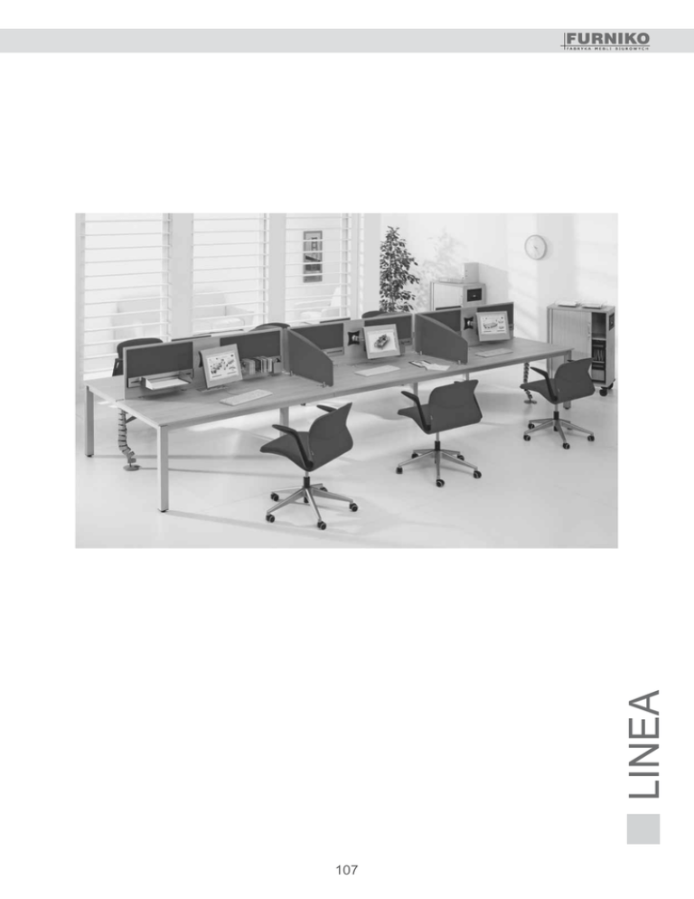 107 LINEA LINEA Meble LINEA dostępne są już w gotowych zestawach po 2, 4 i 6 stanowisk pracy. Dodatkowym elementem jest dostawka boczna, pasująca do każdego z zestawów jako dodatkowe stanowisko pracy. Zestawy LINEA są już wyposażone w ścianki oddzielające stanowiska pracy oraz poziomy system rozprowadzenia okablowania składający się z poziomych kanałów kablowych przystosowanych do montażu gniazd i specjalnych prostokątnych przepustów montowanych w blatach. Panele ścianek są wyposażone w tapicerowane nakładki po obydwu stronach oraz listwy na organizery mocowane w dolnej części ścianki. Dodatkowe uzupełniające elementy systemu zamawiane oddzielnie to: - ekran oddzielający sąsiednie stanowiska pracy - uchwyt przegubowy do monitora LCD mocowany do paneli ścianek - lampka z abażurem mocowana do listwy na organizery Na listwie możemy też montować wszystkie organizery skatalogowane w dziale “Elementy uzupełniające”. Wzory tapicerek na elementy tapicerowane paneli ścianek należy dobierać według wzornika tapicerek ONYX z kolekcji firmy PROFI’m. Panele ścianek po zamontowaniu wystają ponad blat na 45 cm. kolorystyka P00 biały premium P01 jasno szary P02 antracyt P03 pastelowy seledyn P04 oliwka P05 lavenda P10 brzoza P19 klon jasny P12 dąb rozbielany P13 buk P14 buk bawaria P16 calvados P17 wiśnia P18 wiśnia victoria P20 wiśnia romana P21 orzech dijon P22 orzech aida O20 multiplex (sklejka) M01 jasno szary RAL 7035 M02 szary RAL 7045 M03 grafitowy RAL 7024 M05 aluminium RAL 9006 M11 metalik grafitowy - standard LINEA - przykładowy zestaw 108 - opcja dostępna za dopłatą Stelaże metalowe Linea to nowy system mebli biurowych w ofercie FURNIKO. Elementy systemu umożliwiają zabudowę stanowisk pracy w układach typu “ławka”. Blaty robocze wykonane z płyt grubości 25 mm mocowane są do metalowych stelaży o specjalnej konstrukcji. Stelaże są tak zaprojektowane, aby pomiędzy sąsiednimi stanowiskami pracy nie występowały dodatkowe kolumny stelaża. Blaty, el. płytowe KOLORYSTYKA Obrzeża płyt ABS OPIS SYSTEMU LINEA ELEMENT WYMIARY SYMBOL NAZWA I OPIS Szerokość cm 160 Głębokość cm 160 160 160 Wysokość cm LA02 72 Zestaw dwa stanowiska Zestaw składa się ze stelaża na dwa stanowiska, blatów roboczych szerokości 160 cm, jednej ścianki oddzielającej stanowiska z zamontowanymi listwami na organizery oraz poziomych kanałów kablowych Objętość m 3 Szerokość cm 320 Głębokość cm Zestaw cztery stanowiska 160 320 Wysokość cm LA04 72 160 Zestaw składa się ze stelaża na cztery stanowiska, blatów roboczych szerokości 160 cm, dwóch ścianek oddzielających stanowiska z zamontowanymi listwami na organizery oraz poziomych kanałów kablowych (uchwyty na monitor i ekrany oddzielające sąsiednie stanowiska należy zamawiać oddzielnie) Objętość m 3 Szerokość cm 480 Głębokość cm 160 480 Wysokość cm Zestaw sześć stanowisk LA06 72 160 Zestaw składa się ze stelaża na sześć stanowisk, blatów roboczych szerokości 160 cm, trzech ścianek oddzielających stanowiska z zamontowanymi listwami na organizery oraz poziomych kanałów kablowych (uchwyty na monitor i ekrany oddzielające sąsiednie stanowiska należy zamawiać oddzielnie) Objętość m 3 Szerokość cm 160 Głębokość cm 80 Wysokość cm 160 80 LA11 Dostawka boczna Dodatkowe stanowisko montowane z boku zestawów. Element składa się z blatu i stelaża na dwóch nogach z elementami łączącymi 72 Objętość m 3 Szerokość cm 78 Głębokość cm 10 Wysokość cm LA21 Ekran oddzielający sąsiednie stanowiska Wykonany z półprzeźroczystego matowego tworzywa, mocowany na stopkach, dostępny w kolorach: czerwony, zielony, biały mleczny 45 Objętość m 3 109 LINEA ELEMENT WYMIARY SYMBOL NAZWA I OPIS Szerokość cm 33 Głębokość cm 15 Wysokość cm LA31 Uchwyt na monitor LCD Montowany do ścianki, przegubowa konstrukcja umożliwiająca precyzyjne ustawienie monitora. 15 Objętość m 3 Szerokość cm 34 Głębokość cm 25 Wysokość cm LA41 Lampa COSY Lampa stanowiskowa z abażurem montowana na listwie na organizery 45 Objętość m 3 110