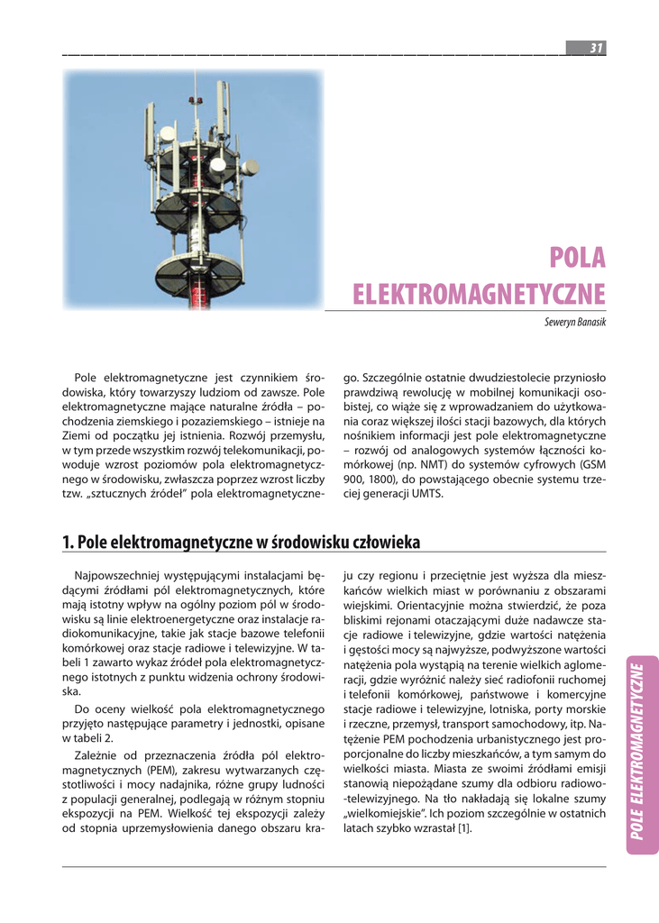 31 POLA ELEKTROMAGNETYCZNE Seweryn Banasik Pole elektromagnetyczne jest czynnikiem środowiska, który towarzyszy ludziom od zawsze. Pole elektromagnetyczne mające naturalne źródła – pochodzenia ziemskiego i pozaziemskiego – istnieje na Ziemi od początku jej istnienia. Rozwój przemysłu, w tym przede wszystkim rozwój telekomunikacji, powoduje wzrost poziomów pola elektromagnetycznego w środowisku, zwłaszcza poprzez wzrost liczby tzw. „sztucznych źródeł” pola elektromagnetyczne- go. Szczególnie ostatnie dwudziestolecie przyniosło prawdziwą rewolucję w mobilnej komunikacji osobistej, co wiąże się z wprowadzaniem do użytkowania coraz większej ilości stacji bazowych, dla których nośnikiem informacji jest pole elektromagnetyczne – rozwój od analogowych systemów łączności komórkowej (np. NMT) do systemów cyfrowych (GSM 900, 1800), do powstającego obecnie systemu trzeciej generacji UMTS. Najpowszechniej występującymi instalacjami będącymi źródłami pól elektromagnetycznych, które mają istotny wpływ na ogólny poziom pól w środowisku są linie elektroenergetyczne oraz instalacje radiokomunikacyjne, takie jak stacje bazowe telefonii komórkowej oraz stacje radiowe i telewizyjne. W tabeli 1 zawarto wykaz źródeł pola elektromagnetycznego istotnych z punktu widzenia ochrony środowiska. Do oceny wielkość pola elektromagnetycznego przyjęto następujące parametry i jednostki, opisane w tabeli 2. Zależnie od przeznaczenia źródła pól elektromagnetycznych (PEM), zakresu wytwarzanych częstotliwości i mocy nadajnika, różne grupy ludności z populacji generalnej, podlegają w różnym stopniu ekspozycji na PEM. Wielkość tej ekspozycji zależy od stopnia uprzemysłowienia danego obszaru kra- ju czy regionu i przeciętnie jest wyższa dla mieszkańców wielkich miast w porównaniu z obszarami wiejskimi. Orientacyjnie można stwierdzić, że poza bliskimi rejonami otaczającymi duże nadawcze stacje radiowe i telewizyjne, gdzie wartości natężenia i gęstości mocy są najwyższe, podwyższone wartości natężenia pola wystąpią na terenie wielkich aglomeracji, gdzie wyróżnić należy sieć radiofonii ruchomej i telefonii komórkowej, państwowe i komercyjne stacje radiowe i telewizyjne, lotniska, porty morskie i rzeczne, przemysł, transport samochodowy, itp. Natężenie PEM pochodzenia urbanistycznego jest proporcjonalne do liczby mieszkańców, a tym samym do wielkości miasta. Miasta ze swoimi źródłami emisji stanowią niepożądane szumy dla odbioru radiowo ‑telewizyjnego. Na tło nakładają się lokalne szumy „wielkomiejskie”. Ich poziom szczególnie w ostatnich latach szybko wzrastał [1]. POLE ELEKTROMAGNETYCZNE 1. Pole elektromagnetyczne w środowisku człowieka 32 Tabela 1. Wykaz źródeł pola elektromagnetycznego istotnych z punktu widzenia ochrony środowiska [2] Grupa urządzeń Zastosowanie Częstotliwość pracy Stosowane moce Ochrona fizyczna obiektów, lokalizacja pojazdów Setki MHz do kilkunastu GHz Pojedyncze mW do kilkudziesięciu W Łączność indywidualna typu stacja bazowa – użytkownicy; przekaz głosu i danych Kilkadziesiąt do kilkuset MHz Od kilkudziesięciu mW (radiotelefony) do kilku W (stacje bazowe) Sieci telefonii komórkowej (GSM, UMTS) Łączność abonencka Pasma 900, 1800, 2100 MHz Od 2 W (telefony) do kilkuset W (stacje bazowe) Dla abonenckich, stałych sieci telefonicznych Łączność abonencka – przekaz głosu 2÷3 GHz Od kilku mW (stacje końcowe) do kilkudziesięciu W (stacje bazowe) Dla przekazu danych Łączność abonencka – przekaz danych 20÷30 GHz Od kilku mW Przekaz sygnałów i danych 2÷38 GHz Od kilku mW do kilku W Stacje radiowe długofalowe (w Polsce są dwie stacje – Solec Kujawski i Raszyn) Przekaz sygnałów i programów radiowych 100÷400 kHz Od kilku do tysiąca kW Stacje radiowe średniofalowe (obecnie w Polsce nie ma stale działających stacji średniofalowych) Przekaz sygnałów i programów radiowych 500÷1600 kHz Od kilku do tysiąca kW Stacje radiowe krótkofalowe Przekaz sygnałów i programów radiowych 1600 kHz ÷30 MHz Od kilku do kilkuset kW Stacje radiowe ultrakrótkofalowe Przekaz sygnałów i programów radiowych 87÷107 MHz Od kilku do tysiąca kW Stacje telewizyjne Przekaz sygnałów i programów telewizyjnych Kilkadziesiąt MHz do osiemset kilkadziesiąt MHz Od kilku do tysiąca kW Kontrola położenia statków powietrznych oraz morskich Kilkaset MHz do kilkudziesięciu GHz Od kilkudziesięciu kW do kilku MW w impulsie Przesył i rozdział energii elektrycznej 50 Hz (poza jedyną stałoprądową instalacją Polska-Szwecja) Stosowane napięcia 110 kV, 220 kV, 400 kV Urządzenia bezpieczeństwa Stacje radiotelefoniczne Urządzenia łączności osobistej Urządzenia radiodostępowe Urządzenia systemów transmisji sygnałów i danych (sieci radiolinii) Urządzenia radiokomunikacyjne Urządzenia radiolokacyjne Linie i stacje elektroenergetyczne wysokiego napięcia Tabela 2. Wielkości charakteryzujące pole elektromagnetyczne [3] Częstotliwość 0 Hz – 100 kHz (ELF – częstotliwości bardzo niskie) 100 kHz – 300 MHz (RF – częstotliwości radiowe) 300 kHz – 300 GHz (MF – mikrofale) Wielkość fizyczna Jednostka Natężenie pola elektrycznego V/m (wolt na metr) Natężenie pola magnetycznego A/m (amper na metr) Indukcja pola magnetycznego T (tesla) Natężenie pola elektrycznego V/m (wolt na metr) Gęstość mocy W/m2 (wat na metr kwadratowy) Natężenie pola elektrycznego V/m (wolt na metr) 33 2. Dopuszczalne poziomy pól elektromagnetycznych Ustawa z dnia 27 kwietnia 2001 r. Prawo ochrony środowiska zawiera podstawowe regulacje prawne dotyczące ochrony środowiska przed polami elektromagnetycznymi. Zgodnie z art. 121. ustawy Prawo ochrony środowiska, ochrona przed polami elektromagnetycznymi polega na zapewnieniu jak najlepszego stanu środowiska poprzez: 1) utrzymanie poziomów pól elektromagnetycznych poniżej dopuszczal