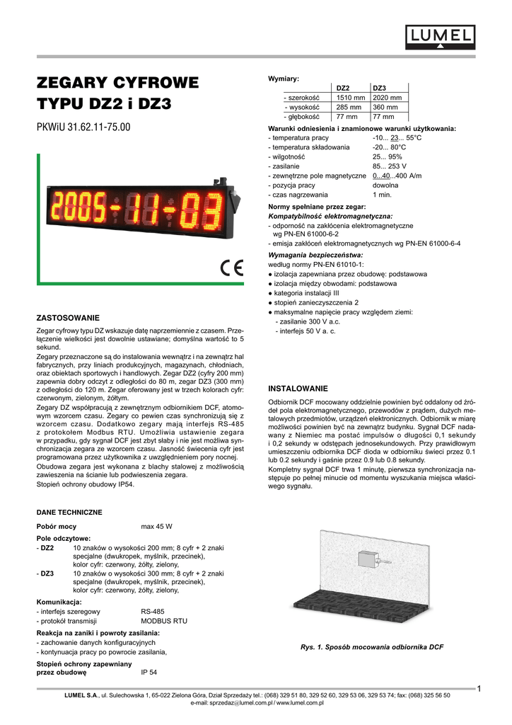 ZEGARY CYFROWE TYPU DZ2 i DZ3 Wymiary: PKWiU 31.62.11-75.00 Warunki odniesienia i znamionowe warunki u¿ytkowania: - temperatura pracy -10... 23... 55°C - temperatura sk³adowania -20... 80°C - wilgotnoæ 25... 95% - zasilanie 85... 253 V - zewnêtrzne pole magnetyczne 0...40...400 A/m - pozycja pracy dowolna - czas nagrzewania 1 min. - szerokoæ - wysokoæ - g³êbokoæ DZ2 1510 mm 285 mm 77 mm DZ3 2020 mm 360 mm 77 mm Normy spe³niane przez zegar: Kompatybilnoæ elektromagnetyczna: - odpornoæ na zak³ócenia elektromagnetyczne wg PN-EN 61000-6-2 - emisja zak³óceñ elektromagnetycznych wg PN-EN 61000-6-4 ZASTOSOWANIE Zegar cyfrowy typu DZ wskazuje datê naprzemiennie z czasem. Prze³¹czenie wielkoci jest dowolnie ustawiane; domylna wartoæ to 5 sekund. Zegary przeznaczone s¹ do instalowania wewn¹trz i na zewn¹trz hal fabrycznych, przy liniach produkcyjnych, magazynach, ch³odniach, oraz obiektach sportowych i handlowych. Zegar DZ2 (cyfry 200 mm) zapewnia dobry odczyt z odleg³oci do 80 m, zegar DZ3 (300 mm) z odleg³oci do 120 m. Zegar oferowany jest w trzech kolorach cyfr: czerwonym, zielonym, ¿ó³tym. Zegary DZ wspó³pracuj¹ z zewnêtrznym odbiornikiem DCF, atomowym wzorcem czasu. Zegary co pewien czas synchronizuj¹ siê z wzorcem czasu. Dodatkowo zegary maj¹ interfejs RS-485 z protoko³em Modbus RTU. Umo¿liwia ustawienie zegara w przypadku, gdy sygna³ DCF jest zbyt s³aby i nie jest mo¿liwa synchronizacja zegara ze wzorcem czasu. Jasnoæ wiecenia cyfr jest programowana przez u¿ytkownika z uwzglêdnieniem pory nocnej. Obudowa zegara jest wykonana z blachy stalowej z mo¿liwoci¹ zawieszenia na cianie lub podwieszenia zegara. Stopieñ ochrony obudowy IP54. Wymagania bezpieczeñstwa: wed³ug normy PN-EN 61010-1: l izolacja zapewniana przez obudowê: podstawowa l izolacja miêdzy obwodami: podstawowa l kategoria instalacji III l stopieñ zanieczyszczenia 2 l maksymalne napiêcie pracy wzglêdem ziemi: - zasilanie 300 V a.c. - interfejs 50 V a. c. INSTALOWANIE Odbiornik DCF mocowany oddzielnie powinien byæ oddalony od róde³ pola elektromagnetycznego, przewodów z pr¹dem, du¿ych metalowych przedmiotów, urz¹dzeñ elektronicznych. Odbiornik w miarê mo¿liwoci powinien byæ na zewn¹trz budynku. Sygna³ DCF nadawany z Niemiec ma postaæ impulsów o d³ugoci 0,1 sekundy i 0,2 sekundy w odstêpach jednosekundowych. Przy prawid³owym umieszczeniu odbiornika DCF dioda w odbiorniku wieci przez 0.1 lub 0.2 sekundy i ganie przez 0.9 lub 0.8 sekundy. Kompletny sygna³ DCF trwa 1 minutê, pierwsza synchronizacja nastêpuje po pe³nej minucie od momentu wyszukania miejsca w³aciwego sygna³u. DANE TECHNICZNE Pobór mocy max 45 W Pole odczytowe: - DZ2 10 znaków o wysokoci 200 mm; 8 cyfr + 2 znaki specjalne (dwukropek, mylnik, przecinek), kolor cyfr: czerwony, ¿ó³ty, zielony, - DZ3 10 znaków o wysokoci 300 mm; 8 cyfr + 2 znaki specjalne (dwukropek, mylnik, przecinek), kolor cyfr: czerwony, ¿ó³ty, zielony, Komunikacja: - interfejs szeregowy - protokó³ transmisji RS-485 MODBUS RTU Reakcja na zaniki i powroty zasilania: - zachowanie danych konfiguracyjnych - kontynuacja pracy po powrocie zasilania, Stopieñ ochrony zapewniany przez obudowê Rys. 1. Sposób mocowania odbiornika DCF IP 54 LUMEL S.A., ul. Sulechowska 1, 65-022 Zielona Góra, Dzia³ Sprzeda¿y tel.: (068) 329 51 80, 329 52 60, 329 53 06, 329 53 74; fax: (068) 325 56 50 e-mail: [email protected] / www.lumel.com.pl 1 h+70 h L 77 60 L - 40 wymiar DZ2 DZ3 L 1510 2020 h 284 360 Rys. 2. Wymiary zegarów DZ2 i DZ3 oraz rozmieszczenie otworów i uchwytów mocuj¹cych PO£¥CZENIA ELEKTRYCZNE W sk³ad zestawu wchodz¹ dwa z³¹cza na kabel ¿eñskie: 3 biegunowe zasilaj¹ce i 4 biegunowe do pod³¹czenia interfejsu. Odbiornik DCF jest dostarczony z wtyczk¹. 230 V a.c. GND SYG A B GND Ekran +5 V DCF RS-485 N L 1 2 3 1 2 3 1 PE 2 Rys. 3 KOD WYKONAÑ Tablica 2 ZEGAR CYFROWY DZ X- X XX Wysokoæ cyfr 200 mm .................................................. 2 300 mm .................................................. 3 Kolor cyfr pola wywietlania czerwony ....................................................... R ¿ó³ty .............................................................. Y zielony ........................................................... G Rodzaj wykonania standardowe ........................................................ 00 specjalne* ............................................................ XX * numeracjê wykonania ustali producent 2 PRZYK£AD ZAMÓWIENIA: kod DZ2 - R 00 - oznacza zegar o wysokoci cyfr 200 mm, kolor pola wywietlania czerwony. Zegar w wykonaniu standardowym. Marzec 2006 LUMEL S.A., ul. Sulechowska 1, 65-022 Zielona Góra, Dzia³ Sprzeda¿y tel.: (068) 329 51 80, 329 52 60, 329 53 06, 329 53 74; fax: (068) 325 56 50 e-mail: [email protected] / www.lumel.com.pl