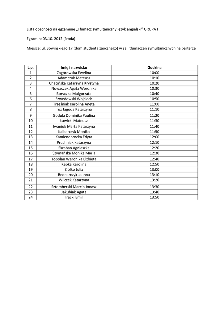 Lista obecności na egzaminie „Tłumacz symultaniczny język angielski” GRUPA I Egzamin: 03.10. 2012 (środa) Miejsce: ul. Sowińskiego 17 (dom studenta zaocznego) w sali tłumaczeń symultanicznych na parterze L.p. 1 2 3 4 5 6 7 8 9 10 11 12 13 14 15 16 17 18 19 20 21 Imię i nazwisko Zagórowska Ewelina Adamczuk Mateusz Chacińska Katarzyna Krystyna Nowaczek Agata Weronika Boryczka Małgorzata Szwedowski Wojciech Trześniak Karolina Aneta Tuz Jagoda Katarzyna Godula Dominika Paulina Ławicki Mateusz Iwaniuk Marta Katarzyna Kalbarczyk Monika Kamienobrocka Edyta Pruchniak Katarzyna Skraban Agnieszka Szymańska Monika Maria Topolan Weronika Elżbieta Kępka Karolina Ziółko Julia Bednarczyk Joanna Wilczek Katarzyna Godzina 10:00 10:10 10:20 10:30 10:40 10:50 11:00 11:10 11:20 11:30 11:40 11:50 12:00 12:10 12:20 12:30 12:40 12:50 13:00 13:10 13:20 22 23 24 Sztomberski Marcin Jonasz Jakubiak Agata Iracki Emil 13:30 13:40 13:50 Lista obecności na egzaminie „Tłumacz symultaniczny język angielski” GRUPA II Egzamin: 03.10. 2012 (środa) Miejsce: ul. Sowińskiego 17 (dom studenta zaocznego) w sali tłumaczeń symultanicznych na parterze L.p. 1 2 3 4 5 6 7 Imię i nazwisko Łopuszyńska Katarzyna Anna Olejniczak Jarosław Krzysztof Kamińska Maja Karolina Kapica Alicja Oberda Edyta Ewa Rodziewicz Michał Marek Czułowski Wieńczysław Godzina 10:00 10:10 10:20 10:30 10:40 10:50 11:00 8 9 10 11 12 13 14 Birycki Jakub Tarasek Paulina Maria Woźniak Edyta Morken Magdalena Agnieszka Pasławska Aleksandra Socha Renata Anna Bielecka Amelia Katarzyna 11:10 11:20 11:30 11:40 11:50 12:00 12:10 15 16 Bielesza Olga Różycka Agata Monika 12:20 12:30 17 Dziarmaga Maksym 12:40 18 19 20 21 22 23 Węglarska Aleksandra Marianna Kuśmierz Anna Natalia Majcher Karolina Joanna Kobyłko Karolina Chojnacka Maria Aleksandra Kozera Dominika 12:50 13:00 13:10 13:20 13:30 13:40