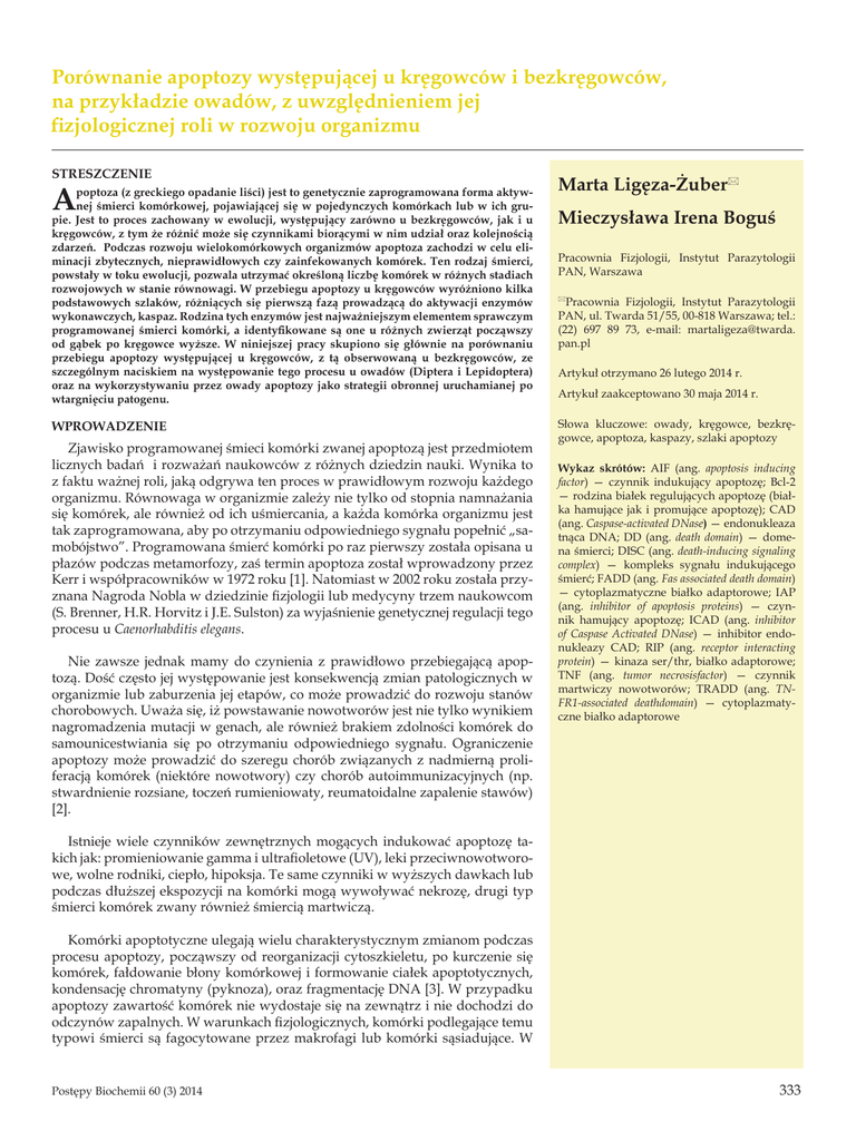 Porównanie apoptozy występującej u kręgowców i bezkręgowców, na przykładzie owadów, z uwzględnieniem jej fizjologicznej roli w rozwoju organizmu STRESZCZENIE A poptoza (z greckiego opadanie liści) jest to genetycznie zaprogramowana forma aktywnej śmierci komórkowej, pojawiającej się w pojedynczych komórkach lub w ich grupie. Jest to proces zachowany w ewolucji, występujący zarówno u bezkręgowców, jak i u kręgowców, z tym że różnić może się czynnikami biorącymi w nim udział oraz kolejnością zdarzeń. Podczas rozwoju wielokomórkowych organizmów apoptoza zachodzi w celu eliminacji zbytecznych, nieprawidłowych czy zainfekowanych komórek. Ten rodzaj śmierci, powstały w toku ewolucji, pozwala utrzymać określoną liczbę komórek w różnych stadiach rozwojowych w stanie równowagi. W przebiegu apoptozy u kręgowców wyróżniono kilka podstawowych szlaków, różniących się pierwszą fazą prowadzącą do aktywacji enzymów wykonawczych, kaspaz. Rodzina tych enzymów jest najważniejszym elementem sprawczym programowanej śmierci komórki, a identyfikowane są one u różnych zwierząt począwszy od gąbek po kręgowce wyższe. W niniejszej pracy skupiono się głównie na porównaniu przebiegu apoptozy występującej u kręgowców, z tą obserwowaną u bezkręgowców, ze szczególnym naciskiem na występowanie tego procesu u owadów (Diptera i Lepidoptera) oraz na wykorzystywaniu przez owady apoptozy jako strategii obronnej uruchamianej po wtargnięciu patogenu. WPROWADZENIE Zjawisko programowanej śmieci komórki zwanej apoptozą jest przedmiotem licznych badań i rozważań naukowców z różnych dziedzin nauki. Wynika to z faktu ważnej roli, jaką odgrywa ten proces w prawidłowym rozwoju każdego organizmu. Równowaga w organizmie zależy nie tylko od stopnia namnażania się komórek, ale również od ich uśmiercania, a każda komórka organizmu jest tak zaprogramowana, aby po otrzymaniu odpowiedniego sygnału popełnić „samobójstwo”. Programowana śmierć komórki po raz pierwszy została opisana u płazów podczas metamorfozy, zaś termin apoptoza został wprowadzony przez Kerr i współpracowników w 1972 roku [1]. Natomiast w 2002 roku została przyznana Nagroda Nobla w dziedzinie fizjologii lub medycyny trzem naukowcom (S. Brenner, H.R. Horvitz i J.E. Sulston) za wyjaśnienie genetycznej regulacji tego procesu u Caenorhabditis elegans. Nie zawsze jednak mamy do czynienia z prawidłowo przebiegającą apoptozą. Dość często jej występowanie jest konsekwencją zmian patologicznych w organizmie lub zaburzenia jej etapów, co może prowadzić do rozwoju stanów chorobowych. Uważa się, iż powstawanie nowotworów jest nie tylko wynikiem nagromadzenia mutacji w genach, ale również brakiem zdolności komórek do samounicestwiania się po otrzymaniu odpowiedniego sygnału. Ograniczenie apoptozy może prowadzić do szeregu chorób związanych z nadmierną proliferacją komórek (niektóre nowotwory) czy chorób autoimmunizacyjnych (np. stwardnienie rozsiane, toczeń rumieniowaty, reumatoidalne zapalenie stawów) [2]. Marta Ligęza-Żuber* Mieczysława Irena Boguś Pracownia Fizjologii, Instytut Parazytologii PAN, Warszawa Pracownia Fizjologii, Instytut Parazytologii PAN, ul. Twarda 51/55, 00-818 Warszawa; tel.: (22) 697 89 73, e-mail: martaligeza@twarda. pan.pl * Artykuł otrzymano 26 lutego 2014 r. Artykuł zaakceptowano 30 maja 2014 r. Słowa kluczowe: owady, kręgowce, bezkręgowce, apoptoza, kaspazy, szlaki apoptozy Wykaz skrótów: AIF (ang. apoptosis inducing factor) — czynnik indukujący apoptozę; Bcl-2 — rodzina białek regulujących apoptozę (białka hamujące jak i promujące apoptozę); CAD (ang. Caspase-activated DNase) — endonukleaza tnąca DNA; DD (ang. death domain) — domena śmierci; DISC (ang. death-inducing signaling complex) — kompleks sygnału indukującego śmierć; FADD (ang. Fas associated death domain) — cytoplazmatyczne białko adaptorowe; IAP (ang. inhibitor of apoptosis proteins) — czynnik hamujący apoptozę; ICAD (ang. inhibitor of Caspase Activated DNase) — inhibitor endonukleazy CAD; RIP (ang. receptor interacting protein) — kinaza ser/thr, białko adaptorowe; TNF (ang. tumor necrosisfactor) — czynnik martwiczy nowotworów; TRADD (ang. TNFR1-associated deathdomain) — cytoplazmatyczne białko adaptorowe Istnieje wiele czynników zewnętrznych mogących indukować apoptozę takich jak: promieniowanie gamma i ultrafioletowe (UV), leki przeciwnowotworowe, wolne rodniki, ciepło, hipoksja. Te same czynniki w wyższych dawkach lub podczas dłuższej ekspozycji na komórki mogą wywoływać nekrozę, drugi typ śmierci komórek zwany również śmiercią martwiczą. Komórki apoptotyczne ulegają wielu charakterystycznym zmianom podczas procesu apoptozy, począwszy od reorganizacji cytoszkieletu, po kurczenie się komórek, fałdowanie błony komórkowej i formowanie ciałek apoptotycznych, kondensację chromatyny (pyknoza), oraz fragmentację DNA [3]. W przypadku apoptozy zawartość komórek nie wydostaje się na zewnątrz i nie dochodzi do odczynów zapalnych. W warunkach fizjologicznych, komórki podlegające temu typowi śmierci są fagocytowane przez makrofagi lub komórki sąsiadujące. W Postępy Biochemii 60 (3) 2014 333 siadają zewnątrzkomórkowe domeny bogate w reszty cysteiny oraz cytoApoptoza Nekroza plazmatyczną domenę, zbudowaną z proces aktywny, zależny od ATP proces pasywny, niezależny od ATP 80 reszt aminokwasowych, zwaną doproces regulowany i enzymatyczny proces nie regulowany meną śmierci (DD, ang. heath domain). pojedyncze komórki lub mała ich grupa często grupy komórek kurczenie się komórek komórki pęcznieją Domena ta odgrywa kluczową rolę w pyknoza, karioreksis karioloza, pyknoza, karioreksis przekazywaniu sygnału unicestwiania błona komórkowa nienaruszona zniszczenie błony komórkowej komórki z jej powierzchni do wnętrza. zatrzymanie cy