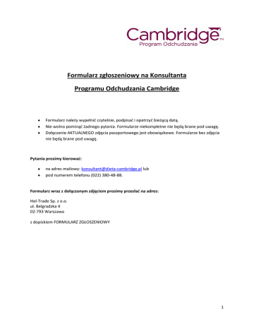 Formularz zgłoszeniowy na Konsultanta Programu Odchudzania Cambridge Formularz należy wypełnid czytelnie, podpisad i opatrzyd bieżącą datą. Nie wolno pominąd żadnego pytania. Formularze niekompletne nie będą brane pod uwagę. Dołączenie AKTUALNEGO zdjęcia paszportowego jest obowiązkowe. Formularze bez zdjęcia nie będą brane pod uwagę. Pytania prosimy kierowad: na adres mailowy: [email protected] lub pod numerem telefonu (022) 380-48-88. Formularz wraz z dołączonym zdjęciem prosimy przesład na adres: Hol-Trade Sp. z o.o. ul. Belgradzka 4 02-793 Warszawa z dopiskiem FORMULARZ ZGŁOSZENIOWY 1 DANE OSOBOWE KANDYDATA Imię: …………………………………………………………………………………………………………………………………………………… Nazwisko: …………………………………………………………………………………………………………………………………………. Data urodzenia: ………………………………………………………………………………………………………………………………….. Nr dowodu osobistego: ……………………………………………………………………………………………………………………. PESEL: ………………………………………………………………………………………………………………………………………………… Adres ul. ………………………………………………………………………………………………………… kod ……………………………………... miasto …………………………………………………..……… województwo …………………………………………………….……… Adres korespondencyjny ul. ………………………………………………………………………………………………………… kod ……………………………………... miasto …………………………………………………..……… województwo ……………………………………………………….…… Adres przechowywania produktów Cambridge ul. ………………………………………………………………………………………………………… kod ……………………………………... miasto …………………………………………………..……… województwo ………………………………………………………….… Telefon stacjonarny: …………………………………………………………………………………………………………………………… Telefon komórkowy: ………………………………………………………………………………………………………………………… Telefon do podawania potencjalnym klientom: ………………………………………………………………………………. Adres e-mail: ……………………………………………………………………………………………………………………………………… Strona www: ……………………………………………………………………………………………………………………………………… Wykształcenie: ……………………………………………………………………………………………………………………………………. Zawód wykonywany*: ……………………………………………………………………………………………………………………… * specjalizacja (dot. lekarzy): …………………………………………………………………………………………………………….. Proszę zaznaczyd, możliwy jest wybór więcej niż jednaj opcji: Konsultacje w domu konsultanta Konsultacje w domu klienta Konsultacje w lokalu usługowym W których dzielnicach miasta będzie Pan/-i konsultowad? ……………………………………………………………….. ……………………………………………………………………………………………………………………………………………………………. 2 1. ZATRUDNIENIE 1.1. Sytuacja zawodowa Na pełnym etacie Na pół etatu Na bezrobociu Działalnośd gospodarcza* Na rencie Na emeryturze * Czy działalnośd gospodarcza jest kontynuowana? W jakiej branży? Czym się Pan/-i dokładnie zajmuje/zajmował/-a? ……………………………………………………………………………………………………………………………………………………… ……………………………………………………………………………………………………………………………………………………… ……………………………………………………………………………………………………………………………………………………… ……………………………………………………………………………………………………………………………………………………… ……………………………………………………………………………………………………………………………………………………… ……………………………………………………………………………………………………………………………………………………… ……………………………………………………………………………………………………………………………………………………… ……………………………………………………………………………………………………………………………………………………… ………………………………………………………