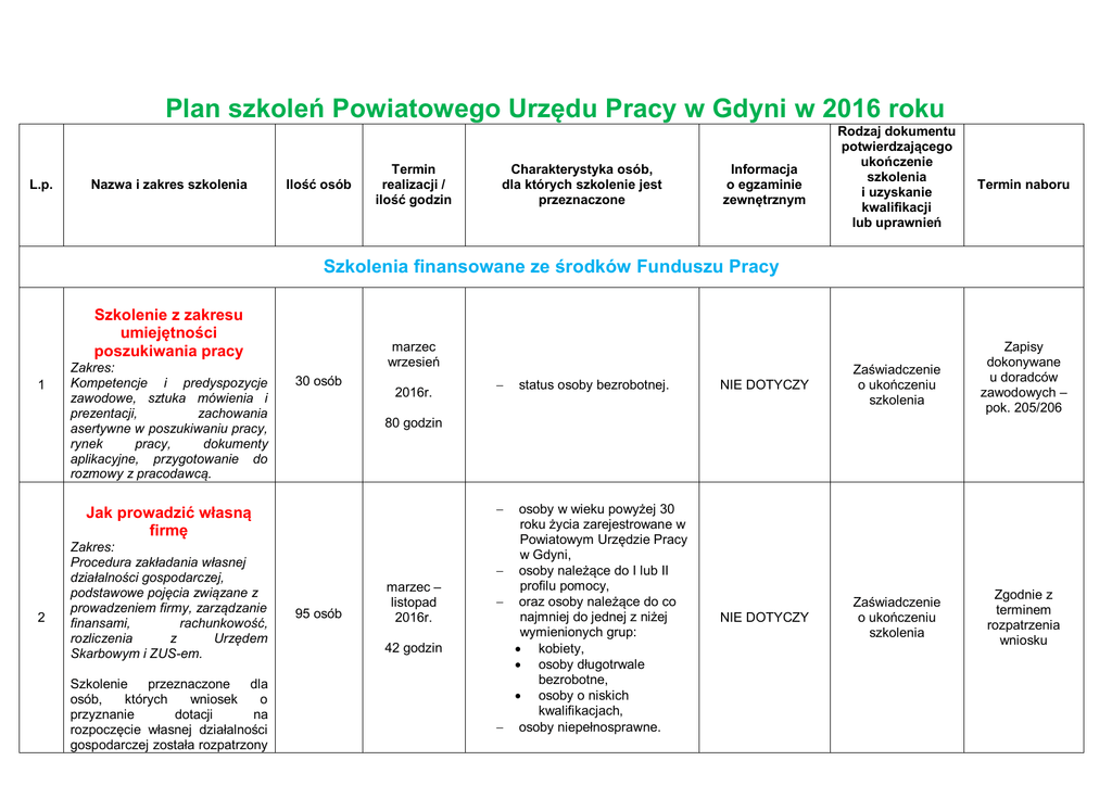 Plan szkoleń Powiatowego Urzędu Pracy w Gdyni w 2016 roku