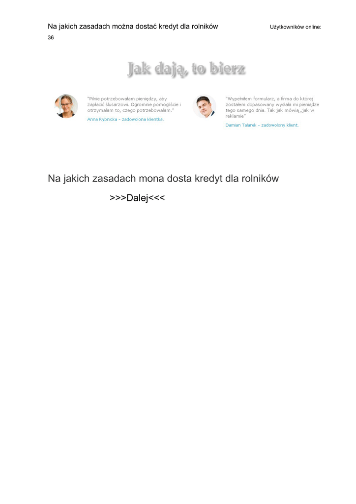 Na jakich zasadach można dostać kredyt dla rolników_____________Użytkowników online: 36 Na jakich zasadach mona dosta kredyt dla rolników _______________>>>Dalej<<< Dodatkowo, przed złożeniem wniosku o przyznanie pomocy, rolnik powinien posiadać plan zalesienia wykonany przez miejscowego nadleśniczego i postępować zgodnie z tym planem. Po drugie, nie otrzymały z ARiMR do 4 września 2014 roku informacji o odmowie przyznania im pomocy finansowej z tego działania. Zazwyczaj jednak powierzenie pracownikowi wykonywania pracy w formie telepracy następuje po wzajemnym porozumieniu pracownika i pracodawcy. BNP Paribas oczekuje od potencjalnego kredytobiorcy prowadzenia działalności rolnej od co najmniej 12 miesięcy, w mBanku natomiast trzeba przedstawić dodatkowo umowy, faktury czy rachunki z tytułu sprzedaży wytworzonych produktów rolnych. Wszystkie dochody są następnie porównywane ze średnimi miesięcznymi wydatkami na utrzymanie gospodarstwa domowego wnioskującego oraz wszelkimi innymi obciążeniami (kredytowymi, finansowymi). Brak zgody na przeprowadzenie kontroli może zostać potraktowany jako niewywiązanie się z obowiązków pracownika, co wiąże się nawet z odmową wypłaty wynagrodzenia. Warunki świadczenia telepracyWarunki świadczenia telepracy może ustalać pracodawca w porozumieniu z zakładową organizacją związkową lub samodzielnie, jeżeli taka organizacja nie działa w jego firmie. Punkty przyznawane będą w zależności od tego, czy realizacja operacji przyczyni się do utrzymania czy też zwiększenia powierzchni trwałych użytków zielonych w gospodarstwie. W przypadku „Zalesianie gruntów innych niż rolne” wysokość wsparcia wynosi od 1700 do 2300 zł. Możesz określić warunki przechowywania lub dostępu do plików cookies w Twojej przeglądarce. Po upłynięciu terminu na dokonanie aktualizacji, Agencja Restrukturyzacji i Modernizacji Rolnictwa poda na stronie internetowej informację o kolejności przysługiwania pomocy w postaci jednej krajowej listy rankingowej. Formularze można pobrać z portalu internetowego ARiMR, a wszystkie informacje można uzyskać w oddziałach regionalnych i w biurach powiatowych. Powierzchnia trwałych użytków zielonych w gospodarstwie określana będzie na podstawie powierzchni trwałych użytków zielonych zadeklarowanej w 2014 r. Dodatkowo większość banków oczekuje także potwierdzenia o niezaleganiu z podatkiem rolnym czy składkami na ubezpieczenie społeczne z KRUS. Po pierwsze ubiegały się o wsparcie na "Modernizację gospodarstw rolnych" w czasie naborów prowadzonych przez ARiMR w 2011, 2012 i 2013 roku i wówczas nie dostały pomocy z powodu braku środków, to znaczy znajdują się na "białej" części ostatnio opublikowanych na stronie Agencji list wojewódzkich określających kolejność przysługiwania dofinansowania w poszczególnych naborach. Można było zarobić wtedy dobre pieniądze, bo jak ja wchodziłem w ten program, to premia zalesieniowa była na 20 lat, teraz jest na 15 lat. Grunty też mocno teraz zdrożały.W dalszym ciągu dopłaty na zalesianie stanowią dobrą rekompensatę za utracone dochody w rolnictwie – uważa Bartosz Sołek. Mając taki dokument w ręce, że ma się stałe źródło dochodu, można było korzystać z kredytów bankowych na kupno kolejnych gruntów. Zazwyczaj, na przykład w PKO BP, MultiBanku czy Credit Agricole, wymagane jest więc zaświadczenie z Urzędu Gminy o dochodach z gospodarstwa rolnego – ilości hektarów przeliczeniowych – dodaje Gabriela Drzymalska. Punkty za kryterium związane ze średnioroczną liczbą sztuk trzody chlewnej przyznawane będą w zależności od wielkości stada obliczonego za okres od dnia 1 stycznia 2013 r. Żadnych aktualizacji wniosków o przyznanie pomocy z tego działania nie muszą dokonywać osoby, które mieszczą się w limitach dostępnych środków, czyli znajdują w "zielonej" części ostatnich list, określających kolejność przyznawania pomocy w wymienionych wyżej naborach. Jest więcej pieniędzy na pomoc rolnikom, którzy ubiegali się o przyznanie wsparcia z działania „Modernizacja gospodarstw rolnych”. Od 5 września do 3 listopada 2014 roku można składać osobiście lub przez upoważnioną osobę w oddziałach regionalnych lub biurach powiatowych Agencji Restrukturyzacji i Modernizacji Rolnictwa wnioski aktualizacyjne o przyznanie pomocy z działania "Modernizacja gospodarstw rolnych", objętego Programem Rozwoju Obszarów Wiejskich na lata 2007 - 2013. To z kolei pozwoliło na dokonanie przez Ministra Rolnictwa i Rozwoju Wsi Marka Sawickiego nowelizacji rozporządzenia w sprawie szczegółowych warunków i trybu przyznawania pomocy z tego działania. ARiMR współpracuje także z Ośrodkami Doradztwa Rolniczego i z Izbą Rolniczą, gdzie specjaliści będą o tym poinformowani. Punkty za kryterium środowiskowe przyznawane będą w zależności od udziału wnioskowanej kwoty pomocy na poprawę ochrony środowiska naturalnego w całości wnioskowanej kwoty pomocy - w przypadku operacji, której realizacja ma na celu poprawę warunków ochrony środowiska naturalnego (do wnioskowanej kwoty pomocy na poprawę ochrony środowiska naturalnego nie wlicza się wnioskowanej kwoty pomocy np. Zdecydowałem się zalesiać, bo wtedy można było policzyć na kartce papieru, że był to dobry interes. Wykaz kosztów kwalifikowalnych mających wpływ na ochronę środowiska określają wytyczne dostępne na stronie internetowej Agencji. Dochodzi do tego albo w wyniku zawarcia umowy o pracę, lub też już podczas zatrudnienia - zarówno z inicjatywy pracownika, jak i pracodawcy. Agencja Restrukturyzacji i Modernizacji Rolnictwa chwali dziesięć lat polskiego członkostwa w Unii Europejskiej i pokazuje pozytywne przykłady zmian w tym obszarze. Również Bank Millenium zastrzega, że rolnicy mogą tam ubiegać się jedynie o kredyty hipoteczne – mówi Gabriela Drzymalska, eksp