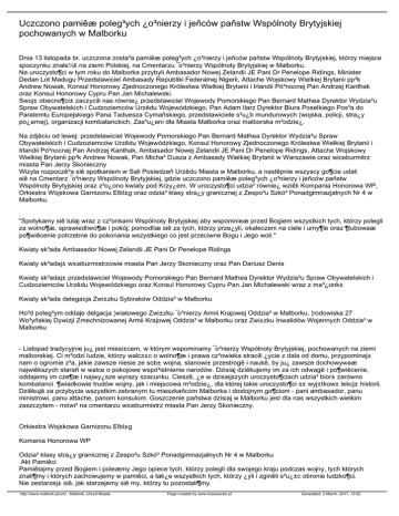 Uczczono pamiêæ poleg³ych ¿o³nierzy i jeñców pañstw Wspólnoty Brytyjskiej pochowanych w Malborku Dnia 13 listopada br. uczczona zosta³a pamiêæ poleg³ych ¿o³nierzy i jeñców pañstw Wspólnoty Brytyjskiej, którzy miejsce spoczynku znale¼li na ziemi Polskiej, na Cmentarzu ¯o³nierzy Wspólnoty Brytyjskiej w Malborku. Na uroczysto¶ci w tym roku do Malborka przybyli Ambasador Nowej Zelandii JE Pani Dr Penelope Ridings, Minister Dedan Lot Madugu Przedstawiciel Ambasady Republiki Federalnej Nigerii, Attache Wojskowy Wielkiej Brytanii pp³k Andrew Nowak, Konsul Honorowy Zjednoczonego Królestwa Wielkiej Brytanii i Irlandii Pó³nocnej Pan Andrzej Kanthak oraz Konsul Honorowy Cypru Pan Jan Michalewski. Swoj± obecno¶ci± zaczycili nas równie¿ przedstawiciel Wojewody Pomorskiego Pan Bernard Mathea Dyrektor Wydzia³u Spraw Obywatelskich i Cudzoziemców Urzêdu Wojewódzkiego, Pan Adam Ilarz Dyrektor Biura Poselkiego Pos³a do Paralemtu Europejskiego Pana Taduesza Cymañskiego, przedstawiciele s³u¿b mundurowych (wojska, policji, stra¿y po¿arnej), organizacji kombatanckich, Zas³u¿eni dla Miasta Malborka oraz malborska m³odzie¿. Na zdjêciu od lewej: przedstawiciel Wojewody Pomorskiego Pan Bernard Mathea Dyrektor Wydzia³u Spraw Obywatelskich i Cudzoziemców Urzêdu Wojewódzkiego, Konsul Honorowy Zjednoczonego Królestwa Wielkiej Brytanii i Irlandii Pó³nocnej Pan Andrzej Kanthak, Ambasador Nowej Zelandii JE Pani Dr Penelope Ridings, Attache Wojskowy Wielkiej Brytanii pp³k Andrew Nowak, Pan Micha³ Dusza z Ambasady Wielkiej Brytanii w Warszawie oraz wiceburmitrz miasta Pan Jerzy Skonieczny Wizyta rozpoczê³a siê spotkaniem w Sali Posiedzeñ Urzêdu Miasta w Malborku, a nastêpnie wszyscy go¶cie udali siê na Cmentarz ¯o³nierzy Wspólnoty Brytyjskiej, gdzie uczczono pamiêæ poleg³ych ¿o³nierzy i jeñców pañstw Wspólnoty Brytyjskiej oraz z³o¿ono kwiaty pod Krzy¿em. W uroczysto¶ci udzia³ równie¿ wziêli Kompania Honorowa WP, Orkiestra Wojskowa Garnizonu Elbl±g oraz odzia³ klasy stra¿y granicznej z Zespo³u Szkó³ Ponadgimnazjalnych Nr 4 w Malborku. "Spotykamy siê tutaj wraz z cz³onkami Wspólnoty Brytyjskiej aby wspomnieæ przed Bogiem wszystkich tych, którzy polegli za wolno¶æ, sprawiedliwo¶æ i pokój; pomodliæ siê za tych, którzy prze¿yli, okaleczeni na ciele i umy¶le oraz ¶lubowaæ po¶wiêcenie potrzebne do pokonania wszystkiego co jest przeciwne Bogu i Jego woli." Kwiaty sk³ada Ambasador Nowej Zelandii JE Pani Dr Penelope Ridings Kwiaty sk³adaj± wiceburmistrzowie miasta Pan Jerzy Skonieczny oraz Pan Dariusz Denis Kwiaty sk³adaj± przedstawiciel Wojewody Pomorskiego Pan Bernard Mathea Dyrektor Wydzia³u Spraw Obywatelskich i Cudzoziemców Urzêdu Wojewódzkiego oraz Konsul Honorowy Cypru Pan Jan Michalewski wraz z ma³¿onk± Kwiaty sk³ada delegacja Zwi±zku Sybiraków Oddzia³ w Malborku Ho³d poleg³ym oddaje delgacja ¦wiatowego Zwi±zku ¯o³nierzy Armii Krajowej Oddzia³ w Malborku, ¦rodowiska 27 Wo³yñskiej Dywizji Zmechnizowanej Armii Krajowej Oddzia³ w Malborku oraz Zwi±zku Inwalidów Wojennych Oddzia³ w Malborku - Listopad tradycyjnie ju¿ jest miesi±cem, w którym wspominamy ¯o³nierzy Wspólnoty Brytyjskiej, pochowanych na ziemi malborskiej. Ci m³odzi ludzie, którzy walcz±c o wolno¶æ i prawa cz³owieka stracili ¿ycie z dala od domu, przypominaj± nam o ogromie z³a, jakie zawsze niesie ze sob± wojna, stanowi± przestrogê i naukê, by ju¿ zawsze dochowywaæ najwiêkszych starañ w walce o pokojowe wspó³istnienie narodów. Dzisiaj dziêkujemy im za ich odwagê i po¶wiêcenie, oddajemy im cze¶æ i najwy¿sze wyrazy szacunku. Cieszê, ¿e w dzisiejszych uroczysto¶ciach udzia³ bior± zarówno kombatanci ¶wiadkowie trudów wojny, jak i miejscowa m³odzie¿, dla której takie uroczysto¶ci s± wyj±tkow± lekcj± historii. Dziêkujê za przybycie wszystkim zebranym tu mieszkañcom Malborka i dostojnym go¶ciom - pani ambasador, panu ministrowi, panu attache, panom konsulom. Goszczenie pañstwa dzisiaj w Malborku jest dla nas wszystkich wielkim zaszczytem - mówi³ na cmentarzu wiceburmistrz miasta Pan Jerzy Skonieczny. Orkiestra Wojskowa Garnizonu Elbl±g Komania Honorowa WP Odzia³ klasy stra¿y granicznej z Zespo³u Szkó³ Ponadgimnazjalnych Nr 4 w Malborku Akt Pamiêci Pamiêtajmy przed Bogiem i poleæmy Jego opiece tych, którzy polegli dla swojego kraju podczas wojny, tych których znali¶my i których zachowujemy w pamiêci, a tak¿e wszystkich tych, którzy ¿yli i zginêli s³u¿±c obronie ludzko¶ci. Nie zestarzej± siê, jak starzejemy siê my, którzy tu pozostali¶my. http://www.malbork.pl/um/ - Malbork, Urz±d Miasta Page created by www.kraszewski.pl Generated: 2 March, 2017, 13:52 Wiek podesz³y ich nie skruszy, ni lata nie z³ami±. O zachodzi s³oñca i o poranku bêdziemy o nich pamiêtaæ. * POZOSTAN¡ W NASZEJ PAMIÊCI * Po zakoñczeniu uroczystosci na Cmentarzu ¯o³nierzy Wspólnoty Brytyjskiej zosta³y równie¿ z³o¿one kwiaty pod Pomnikiem Stalagu XX B na Cmentarzu Komunalnym. Ho³d jeñcom wojennym oddaj± wiceburmistrz miasta Pan Jerzy Skonieczny oraz Przewodniczacy Rady Miasta Malborka Pan Arkadiusz Mroczkowski Kwiaty sk³adaj± Starosta Malborski Pan Miros³aw Czapla oraz Przewodnicz±cy Rady Powiatu Malborskiego Pan Taduesz Kaczorek Kwiaty (od lewej) sk³adaj± pp³k S³awomir B³oñski i mjr Krzysztof Partyka z 22 Bazy Lotniczej w Malborku, p³k pil. Mariusz Biajgo Dowódca 41 Eskadry Lotnictwa Taktycznego w Malborku oraz przedstawiciel Wojskowej Komendy Uzupe³nieñ w Malborku Pan Wac³aw Kowalczyk Attache Wojskowy Wielkiej Brytanii pp³k Andrew Nowak wraz z Pani± Jolant± Biernat mieszkank± Malborka, której ojciec by³ wiêziony przez 4 lata w malborskim stalagu, a w rêku trzyma nie¶miertelniki ojca ***** Dziêkujemy serdecznie wszystkim przyby³ym za uczczenie pamiêci poleg³ych ¿o³nierzy i jeñców pañstw Wspólnoty Brytyjskiej. Pragniemy równie¿ serde