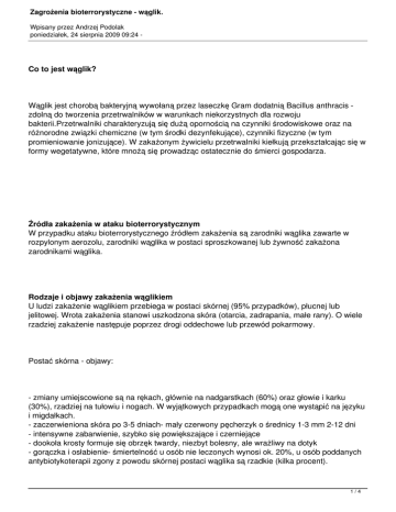 Zagrożenia bioterrorystyczne - wąglik. Wpisany przez Andrzej Podolak poniedziałek, 24 sierpnia 2009 09:24 - Co to jest wąglik? Wąglik jest chorobą bakteryjną wywołaną przez laseczkę Gram dodatnią Bacillus anthracis zdolną do tworzenia przetrwalników w warunkach niekorzystnych dla rozwoju bakterii.Przetrwalniki charakteryzują się dużą opornością na czynniki środowiskowe oraz na różnorodne związki chemiczne (w tym środki dezynfekujące), czynniki fizyczne (w tym promieniowanie jonizujące). W zakażonym żywicielu przetrwalniki kiełkują przekształcając się w formy wegetatywne, które mnożą się prowadząc ostatecznie do śmierci gospodarza. Źródła zakażenia w ataku bioterrorystycznym W przypadku ataku bioterrorystycznego źródłem zakażenia są zarodniki wąglika zawarte w rozpylonym aerozolu, zarodniki wąglika w postaci sproszkowanej lub żywność zakażona zarodnikami wąglika. Rodzaje i objawy zakażenia wąglikiem U ludzi zakażenie wąglikiem przebiega w postaci skórnej (95% przypadków), płucnej lub jelitowej. Wrota zakażenia stanowi uszkodzona skóra (otarcia, zadrapania, małe rany). O wiele rzadziej zakażenie następuje poprzez drogi oddechowe lub przewód pokarmowy. Postać skórna - objawy: - zmiany umiejscowione są na rękach, głównie na nadgarstkach (60%) oraz głowie i karku (30%), rzadziej na tułowiu i nogach. W wyjątkowych przypadkach mogą one wystąpić na języku i migdałkach. - zaczerwieniona skóra po 3-5 dniach- mały czerwony pęcherzyk o średnicy 1-3 mm 2-12 dni - intensywne zabarwienie, szybko się powiększające i czerniejące - dookoła krosty formuje się obrzęk twardy, niezbyt bolesny, ale wrażliwy na dotyk - gorączka i osłabienie- śmiertelność u osób nie leczonych wynosi ok. 20%, u osób poddanych antybiotykoterapii zgony z powodu skórnej postaci wąglika są rzadkie (kilka procent). 1/4 Zagrożenia bioterrorystyczne - wąglik. Wpisany przez Andrzej Podolak poniedziałek, 24 sierpnia 2009 09:24 - Płucna postać wąglika - objawy: - dochodzi w następstwie inhalacji znacznej dawki zarazka, prawdopodobnie rzędu 8-10 tys. przetrwalników- ostre zakażenie dróg oddechowych - gorączka - kaszel, duszność, bóle głowy, wymioty, dreszcze, osłabienie, bóle brzucha, bóle w klatce piersiowej trwające 2-4 dni - duszność, obfite pocenie się i wstrząs - świst krtaniowy - szybko rozwijają się objawy ostrej niewydolności oddechowej i krążeniowej prowadzące z reguły do zejścia śmiertelnego w ciągu doby od wystąpienia powyższych objawów - śmiertelność w płucnej postaci wąglika u osób narażonych zawodowo (tzw. wąglik przemysłowy osób sortujących wełnę i skóry) wynosi 89%. Postać żołądkowo-jelitowa wąglika - objawy: - występuje jedynie sporadycznie, po spożyciu potraw, głównie mięsa zanieczyszczonego przetrwalnikami - zmiany w jamie ustnej lub przełyku - powiększenia okolicznych węzłów chłonnych, obrzęku i posocznicy - zmiany w końcowym odcinku jelita cienkiego - nudności, wymioty i złe samopoczucie - bólami brzucha, krwawą biegunką i posocznicą - w masywnym zakażeniu choroba może przebiegać podobnie jak w postaci płucnej wąglika - z powodu trudności w rozpoznaniu postaci żołądkowo-jelitowej śmiertelność jest wysoka sięgającą 100%. Zapobieganie zakażeniu Szczepionki przeciw wąglikowi są aktualnie trudno dostępne. Profilaktyczną antybiotykoterapię 2/4 Zagrożenia bioterrorystyczne - wąglik. Wpisany przez Andrzej Podolak poniedziałek, 24 sierpnia 2009 09:24 - stosuje się wyłącznie na zlecenie lekarza u osób narażonych ze wspólnego źródła z potwierdzonymi przypadkami klinicznymi. Co może świadczyć o ataku wąglikiem? - Wystąpienie zidentyfikowanych przypadków postaci płucnej lub jelitowej wąglika. - Wystąpienie niezidentyfikowanych bakteriologicznie i nieuzasadnionych epidemicznie przypadków zachorowań o obrazie klinicznym sugerującym postać płucną lub jelitową wąglika. - Pojawienie się zachorowań na wąglik wśród zwierząt gospodarskich na obszarach nieendemicznych. - Pojawienie się zidentyfikowanych przez bakteriologów zarodników wąglika na terenie, gdzie wąglik nie występuje endemicznie. - Użycie wąglika do ataku bioterrorystycznego w innych krajach, szczególnie ościennych. - Groźba (jawna lub pochodząca z danych wywiadu) dokonania ataku bioterrorystycznego ze strony organizacji ekstremistycznych (w tym państw). - Pojawienie się sytuacji potencjalnego, ale jeszcze nie zidentyfikowanego zagrożenia w postaci np. przesyłek pocztowych niewiadomego pochodzenia o niezwykłej zawartości. Postępowanie służb ratowniczych z podejrzaną przesyłką - zabezpieczenie miejsca zdarzenia - izolacja osób mających kontakt z podejrzaną substancją - zabezpieczenie substancji lub przesyłki, zapakowanie do worka następnie do 2 worka - przekazanie służbom sanitarno epidemiologicznym 3/4 Zagrożenia bioterrorystyczne - wąglik. Wpisany przez Andrzej Podolak poniedziałek, 24 sierpnia 2009 09:24 - Zabezpieczenie ratowników podejrzanej przy Prowadząc pełnym substancji zabezpieczeniu działania związane działania ratowników. należy ziczasu podejrzeniem prowadzić przy wykorzystaniu strony wąglika innej sprzętu i tym celu należy stosować CUGI postępować jak przy akcjach ratownictwa chemicznego. do Transport tego typu substancji działań. powinien odbywać się w ochronnym ubraniu i pojeździe przeznaczonym mycia stwarzający W czasie należy prowadzenia zagrożenie zachować (min. ostrożność akcji jak Do po i itraktować jej identyfikacji zakończeniu sprzęt substancji) podczas mający kontakt dekontaminacji, zdostępnego substancją dezynfekcji jako nadal -przełożonemu. Wszelkiego rodzaju uwagi, zastrzeżenia i wypadki należy niezwłocznie zgłosićlub właściwemu Wykonał: asp. Andrzej Podolak KP PSP Drawsko Pomorskie Procedurę postępowania (zdjęcie) opracowano wzagrożenia KW 