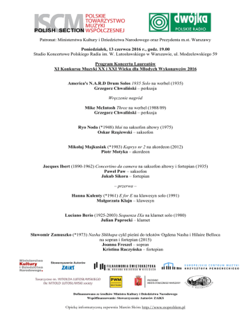 Patronat: Ministerstwa Kultury i Dziedzictwa Narodowego oraz Prezydenta m.st. Warszawy Poniedziałek, 13 czerwca 2016 r., godz. 19.00 Studio Koncertowe Polskiego Radia im. W. Lutosławskiego w Warszawie, ul. Modzelewskiego 59 Program Koncertu Laureatów XI Konkursu Muzyki XX i XXI Wieku dla Młodych Wykonawców 2016 America's N.A.R.D Drum Solos 1935 Solo na werbel (1935) Grzegorz Chwaliński – perkusja Wręczenie nagród Mike McIntosh Three na werbel (1988/89) Grzegorz Chwaliński – perkusja Ryo Noda (*1948) Mai na saksofon altowy (1975) Oskar Rzążewski – saksofon Mikołaj Majkusiak (*1983) Kaprys nr 2 na akordeon (2012) Piotr Motyka – akordeon Jacques Ibert (1890-1962) Concertino da camera na saksofon altowy i fortepian (1935) Paweł Paw – saksofon Jakub Sikora – fortepian – przerwa – Hanna Kulenty (*1961) E for E na klawesyn solo (1991) Małgorzata Klajn – klawesyn Luciano Berio (1925-2003) Sequenza IXa na klarnet solo (1980) Julian Paprocki – klarnet Sławomir Zamuszko (*1973) Nasha Shkhapa cykl pieśni do tekstów Ogdena Nasha i Hilaire Belloca na sopran i fortepian (2015) Joanna Freszel – sopran Kristina Raczyńska – fortepian Dofinansowano ze środków Ministra Kultury i Dziedzictwa Narodowego Współfinansowanie: Stowarzyszenie Autorów ZAiKS Opiekę informatyczną zapewnia Marcin Skóra http://www.noproblem.pl