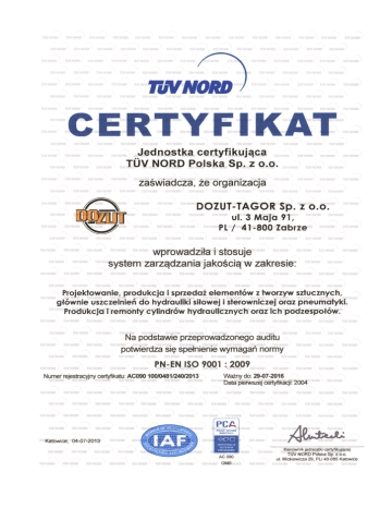 Nadrzędnym celem DOZUT-TAGOR Sp. z o. o. jest dostarczanie odbiorcom wyrobów i usług spełniających ich wymagania i oczekiwania, przy zachowaniu optymalnych kosztów. Polityka jakości DOZUT-TAGOR Sp. z o. o. opiera się na następujących założeniach: opracowywanie lub modyfikowanie procesów wytwórczych odbywa się w oparciu o poprzedzające je prace badawczo-rozwojowe i własne, unikalne rozwiązania konstrukcyjne, technologiczne i badawcze, powtarzalną jakość wyrobów zapewnia stosowanie w procesie produkcji wyłącznie sprawdzonych i udokumentowanych metod wytwarzania, każdy pracownik jest odpowiedzialny za swoją pracę, a poprzez osobiście sprawowaną kontrolę (samokontrolę) upewnia się co do jej właściwego wykonania, poszczególne etapy procesu produkcyjnego elementów uszczelniających, a także operacje wytwarzania powłok ochronnych typu „DURACHROM” podlegają ciągłemu doskonaleniu zarówno w aspekcie technologicznym, jak i ekonomicznym, zidentyfikowane odchylenia lub niezgodności w odniesieniu do wyrobu, procesu lub systemu jakości uruchamiają odpowiednie działania korygujące, zatrudnianie wykwalifikowanej kadry i ciągłym jej szkoleniu. DOZUT-TAGOR Sp. z o. o. Prezes Zabrze 22.05.2009 mgr inż. Janusz SOLIK Produkcja uszczelnień do hydrauliki siłowej i sterowniczej oraz pneumatyki Ekologiczne powłoki ochronne wg technologii DURACHROM Produkcja i remonty cylindrów hydraulicznych oraz ich podzespołów Produkcja elementów z termoplastycznych tworzyw sztucznych metodą wtrysku Projektowanie węzłów uszczelniających ruchowych i spoczynkowych do zastosowań specjalnych Projektowanie podpór i cylindrów hydraulicznych Badania funkcjonalności i trwałości elementów hydraulicznych zwłaszcza uszczelnień Oznaczanie własności fizyko-mechanicznych i wytrzymałościowych materiałów (tworzywa sztuczne, metale, guma) DOZUT - TAGOR Sp z o.o. ul. 3 Maja 91, 41-800 Zabrze, Polska tel. +48 323 760 500; fax +48 323 760 513 Wszystkie wcześniejsze edycje katalogu prezentującego ofertę produkcyjno-usługową nie wykraczały poza standardowe lub specjalne systemy uszczelniające bądź indywidualne uszczelnienia oraz początki procesu wdrożeniowego nowej koncepcji technologicznej zabezpieczenia powierzchni roboczych podzespołów hydraulicznych pn. DURACHROM, współpracujących ze wspomnianymi systemami bądź indywidualnymi uszczelnieniami. Doskonalenie tych systemów i koncepcji technologicznych stało się nadrzędnym celem działalności całej załogi, a efekty tych działań są już dziś zauważalne w postaci zwiększonej trwałości zespołów hydraulicznych, w których je zastosowano a tym samym wyraźnego wydłużenia się resursów niezawodnej ich eksploatacji w szczególności górniczej. Zaistniałe po roku 2000 przekształcenia o charakterze najpierw komercjalizacyjnym a później kapitałowym zakończyły się powstaniem organizacji DOZUT-TAGOR Sp. z o.o. włączonej do struktury Grupy Kapitałowej KOPEX a wstępnie oddelegowanej do ścisłej współpracy ze Spółką TAGOR S.A. w szczególności z Zakładem Hydrauliki. Takie usytuowanie Spółki DOZUT-TAGOR spowodowało całkowitą zmianę jej oblicza tak pod względem skali jak i asortymentu podejmowanej produkcji zespołów i podzespołów hydraulicznych oraz remontów wyznaczających równocześnie nowe obszary działalności innowacyjnej, badawczo-rozwojowej i wdrożeniowej ukierunkowane już nie tylko na hydraulikę obudów zmechanizowanych, ale także na hydraulikę kombajnów i innych maszyn górniczych. Dzięki takiej orientacji Spółka zaczyna się przeobrażać w naturalne zaplecze badawczo-rozwojowe poszczególnych Spółek tworzących Grupę Kapitałową, którego dewizą pozostanie niezmiennie doskonalenie konstrukcji zespołów i podzespołów hydrauliki siłowej w kierunku podwyższania ich trwałości eksploatacyjnej podobnie jak to miało miejsce we wcześniejszych latach działalności Spółki, w których wykreowano trwałe uszczelnienia i niezawodne powłoki ochronne które zdecydowanie wygrały walkę z procesami korozyjnymi. Pierwsze efekty takiej orientacji są już wyraźnie odczuwalne w postaci nowych oryginalnych rozwiązań konstrukcyjnych stosowanych w zespołach hydraulicznych jak choćby: konstrukcja tzw. tłoków elastycznych sposób zasilania komór nadtłokowych bezgwintowe konstrukcje tłoka i dławnic eliminacja energochłonnych technik spawalniczych nowa aplikacja technologii DURACHROM w zespołach tzw. małej hydrauliki (podpory, siłowniki korekcyjne, przesuwniki itp) w tym również na roboczych powierzchniach wewnętrznych i wiele innych. Oryginalność opracowanych rozwiązań potwierdzają liczne świadectwa autorskie Urzędu Patentowego RP a wiarygodność techniczną Certyfikaty wydane przez notyfikowane Jednostki Badawczo-Rozwojowe. Szereg tych rozwiązań jest już w fazie ciągłej eksploatacji w polskich kopalniach a także w kompleksach transferowanych z tymi osiągnięciami za granicę między innymi do Chin, Rumunii, Czech, Niemiec Rosji i Białorusi a nawet do Australii. Skuteczność i efektywność działań specjalistów i pracowników spółki DOZUT-TAGOR dostrzegli już nie tylko klienci ale także kapituły różnych konkursów oceniających osiągnięcia techniczno-ekonomiczne które przyznały Spółce liczne medale, tytuły Lidera Innowacji, statuetkę Gazeli Biznesu oraz Złotego Orbitala. DOZUT-TAGOR jest także laureatem konkursu „Przyjaźni środowisku” głównie z uwagi na to że wszystkie efekty działalności innowacyjnej spółki są zawsze zgodne ze standardami ekologicznymi a przy tym są technologiami i projektami możliwie najprostszymi, energo- i materiałooszczędnymi pod jednym wszakże warunkiem: muszą być również trwałe i niezawodne w porównaniu z konkurencyjnymi produktami pochodzenia zagranicznego. Spółka DOZUT-TAGOR opiera swoją perspektywę na solidnej wiedzy inżynierskiej i liczącym 