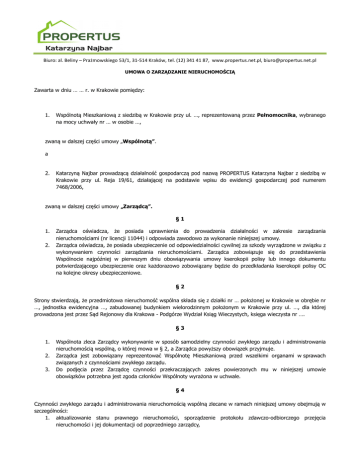 Biuro: al. Beliny – Prażmowskiego 53/1, 31-514 Kraków, tel. (12) 341 41 87, www.propertus.net.pl, [email protected] UMOWA O ZARZĄDZANIE NIERUCHOMOŚCIĄ Zawarta w dniu … … r. w Krakowie pomiędzy: 1. Wspólnotą Mieszkaniową z siedzibą w Krakowie przy ul. …, reprezentowaną przez Pełnomocnika, wybranego na mocy uchwały nr … w osobie …, zwaną w dalszej części umowy „Wspólnotą”. a 2. Katarzyną Najbar prowadzącą działalność gospodarczą pod nazwą PROPERTUS Katarzyna Najbar z siedzibą w Krakowie przy ul. Reja 19/61, działającej na podstawie wpisu do ewidencji gospodarczej pod numerem 7468/2006, zwaną w dalszej części umowy „Zarządcą”. §1 1. 2. Zarządca oświadcza, że posiada uprawnienia do prowadzenia działalności w zakresie zarządzania nieruchomościami (nr licencji 11044) i odpowiada zawodowo za wykonanie niniejszej umowy. Zarządca oświadcza, że posiada ubezpieczenie od odpowiedzialności cywilnej za szkody wyrządzone w związku z wykonywaniem czynności zarządzania nieruchomościami. Zarządca zobowiązuje się do przedstawienia Wspólnocie najpóźniej w pierwszym dniu obowiązywania umowy kserokopii polisy lub innego dokumentu potwierdzającego ubezpieczenie oraz każdorazowo zobowiązany będzie do przedkładania kserokopii polisy OC na kolejne okresy ubezpieczeniowe. §2 Strony stwierdzają, że przedmiotowa nieruchomość wspólna składa się z działki nr … położonej w Krakowie w obrębie nr …, jednostka ewidencyjna …, zabudowanej budynkiem wielorodzinnym położonym w Krakowie przy ul. …, dla której prowadzona jest przez Sąd Rejonowy dla Krakowa - Podgórze Wydział Ksiąg Wieczystych, księga wieczysta nr …. §3 1. 2. 3. Wspólnota zleca Zarządcy wykonywanie w sposób samodzielny czynności zwykłego zarządu i administrowania nieruchomością wspólną, o której mowa w § 2, a Zarządca powyższy obowiązek przyjmuje. Zarządca jest zobowiązany reprezentować Wspólnotę Mieszkaniową przed wszelkimi organami w sprawach związanych z czynnościami zwykłego zarządu. Do podjęcia przez Zarządcę czynności przekraczających zakres powierzonych mu w niniejszej umowie obowiązków potrzebna jest zgoda członków Wspólnoty wyrażona w uchwale. §4 Czynności zwykłego zarządu i administrowania nieruchomością wspólną zlecane w ramach niniejszej umowy obejmują w szczególności: 1. aktualizowanie stanu prawnego nieruchomości, sporządzenie protokołu zdawczo-odbiorczego przejęcia nieruchomości i jej dokumentacji od poprzedniego zarządcy, Biuro: al. Beliny – Prażmowskiego 53/1, 31-514 Kraków, tel. (12) 341 41 87, www.propertus.net.pl, [email protected] 2. prowadzenie i aktualizowanie wykazu lokali i właścicieli lokali oraz przypadających im udziałów w nieruchomości wspólnej, 3. prowadzenie księgi obiektu budowlanego oraz dokumentacji technicznej nieruchomości wspólnej wymaganej przez przepisy prawa budowlanego, 4. przeprowadzanie za pośrednictwem wyspecjalizowanych jednostek kontroli technicznej, okresowych przeglądów nieruchomości i urządzeń stanowiących jej wyposażenie techniczne zgodnie z wymogami prawa budowlanego, 5. utrzymanie w należytym porządku i czystości pomieszczeń i urządzeń budynku służących do wspólnego użytku właścicieli lokali, terenu nieruchomości, chodnika przed nieruchomością poprzez nadzór nad realizacją zawartych w tym zakresie umów, 6. zapewnienie dla nieruchomości wspólnej dostawy energii elektrycznej, wody, odprowadzenia ścieków i wywozu śmieci, poprzez nadzór nad realizacją zawartych w tym zakresie umów, 7. zapewnienie dla nieruchomości wspólnej usług kominiarskich i innych usług związanych z funkcjonowaniem urządzeń technicznych, 8. nadzór i kontrolę realizacji pozostałych umów zawieranych przez Wspólnotę w tym dotyczących remontów i modernizacji budynku, 9. zlecanie bieżącej konserwacji i bieżących napraw nieruchomości wspólnej, w szczególności: napraw i konserwacji budynku i jego pomieszczeń wspólnych oraz urządzeń technicznych umożliwiających właścicielom lokali korzystanie z oświetlenia, ogrzewania lokali, ciepłej i zimnej wody i innych urządzeń należących do wyposażenia nieruchomości wspólnej, oraz nadzór nad realizacją zawartych w tym zakresie umów, 10. usuwanie awarii i ich skutków na nieruchomości wspólnej, na warunkach określonych w § 6 umowy, 11. ubezpieczenie w imieniu Wspólnoty budynku położonego na nieruchomości wspólnej oraz zawarcie polisy OC dla Wspólnoty, 12. opłacanie podatków i innych opłat publicznoprawnych przypadających od nieruchomości wspólnej, chyba że są one pokrywane bezpośrednio przez właścicieli poszczególnych lokali, 13. wyszukiwanie firm świadczących usługi na rzecz nieruchomości wspólnej, negocjowanie cen i warunków umów oraz zatwierdzanie kosztorysów robót, 14. zawieranie w imieniu Wspólnoty umów o dostawy, roboty i usługi, związane z realizacją zadań wymienionych w § 4 pkt. od 4 do pkt. 11 umowy, kontrola prawidłowości wykonania tych umów oraz ich rozwiązanie w przypadkach gospodarczo uzasadnionych, 15. prowadzenie rachunku bankowego dla Wspólnoty i dokonywanie rozliczeń poprzez rachunek bankowy, 16. prowadzenie na własny koszt odpowiedniej księgowości dla nieruchomości wspólnej, w tym odrębnej ewidencji kosztów i przychodów oraz ewidencji wpłat na fundusz remontowy, a także ewidencji wnoszonych przez właścicieli opłat i zaliczek na pokrycie kosztów zarządu nieruchomością wspólną (koszty eksploatacyjne), 17. sporządzenie rocznego sprawozdania finansowego najpóźniej na 2 tygodnie przez terminem zebrania rocznego, 18. reprezentacja Wspólnoty w stosunkach z właścicielami oraz prowadzenie korespondencji z członkami Wspólnoty, 19. rozliczenie wpłaconych przez właścicieli zaliczek na pokrycie kosztów zarządu nieruchomością wspólną – raz w roku, na koniec roku obrachunkowego