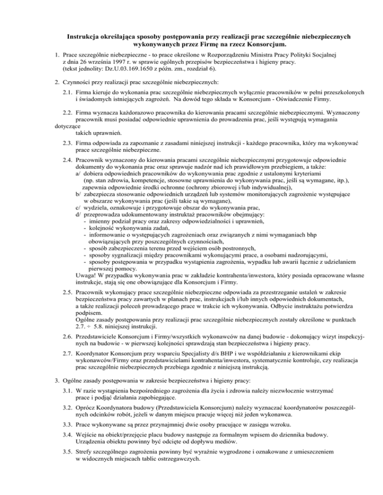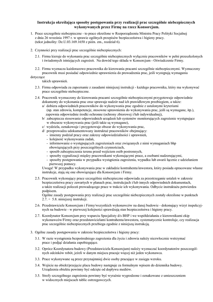 Instrukcja określająca sposoby postępowania przy realizacji prac szczególnie niebezpiecznych wykonywanych przez Firmę na rzecz Konsorcjum. 1. Prace szczególnie niebezpieczne - to prace określone w Rozporządzeniu Ministra Pracy Polityki Socjalnej z dnia 26 września 1997 r. w sprawie ogólnych przepisów bezpieczeństwa i higieny pracy. (tekst jednolity: Dz.U.03.169.1650 z późn. zm., rozdział 6). 2. Czynności przy realizacji prac szczególnie niebezpiecznych: 2.1. Firma kieruje do wykonania prac szczególnie niebezpiecznych wyłącznie pracowników w pełni przeszkolonych i świadomych istniejących zagrożeń. Na dowód tego składa w Konsorcjum - Oświadczenie Firmy. 2.2. Firma wyznacza każdorazowo pracownika do kierowania pracami szczególnie niebezpiecznymi. Wyznaczony pracownik musi posiadać odpowiednie uprawnienia do prowadzenia prac, jeśli występują wymagania dotyczące takich uprawnień. 2.3. Firma odpowiada za zapoznanie z zasadami niniejszej instrukcji - każdego pracownika, który ma wykonywać prace szczególnie niebezpieczne. 2.4. Pracownik wyznaczony do kierowania pracami szczególnie niebezpiecznymi przygotowuje odpowiednie dokumenty do wykonania prac oraz sprawuje nadzór nad ich prawidłowym przebiegiem, a także: a/ dobiera odpowiednich pracowników do wykonywania prac zgodnie z ustalonymi kryteriami (np. stan zdrowia, kompetencje, stosowne uprawnienia do wykonywania prac, jeśli są wymagane, itp.), zapewnia odpowiednie środki ochronne (ochrony zbiorowej i/lub indywidualnej), b/ zabezpiecza stosowanie odpowiednich urządzeń lub systemów monitorujących zagrożenie występujące w obszarze wykonywania prac (jeśli takie są wymagane), c/ wydziela, oznakowuje i przygotowuje obszar do wykonywania prac, d/ przeprowadza udokumentowany instruktaż pracowników obejmujący: - imienny podział pracy oraz zakresy odpowiedzialności i uprawnień, - kolejność wykonywania zadań, - informowanie o występujących zagrożeniach oraz związanych z nimi wymaganiach bhp obowiązujących przy poszczególnych czynnościach, - sposób zabezpieczenia terenu przed wejściem osób postronnych, - sposoby sygnalizacji między pracownikami wykonującymi prace, a osobami nadzorującymi, - sposoby postępowania w przypadku wystąpienia zagrożenia, wypadku lub awarii łącznie z udzielaniem pierwszej pomocy. Uwaga! W przypadku wykonywania prac w zakładzie kontrahenta/inwestora, który posiada opracowane własne instrukcje, stają się one obowiązujące dla Konsorcjum i Firmy. 2.5. Pracownik wykonujący prace szczególnie niebezpieczne odpowiada za przestrzeganie ustaleń w zakresie bezpieczeństwa pracy zawartych w planach prac, instrukcjach i/lub innych odpowiednich dokumentach, a także realizacji poleceń prowadzącego prace w trakcie ich wykonywania. Odbycie instruktażu potwierdza podpisem. Ogólne zasady postępowania przy realizacji prac szczególnie niebezpiecznych zostały określone w punktach 2.7. ÷ 5.8. niniejszej instrukcji. 2.6. Przedstawiciele Konsorcjum i Firmy/wszystkich wykonawców na danej budowie - dokonujący wizyt inspekcyjnych na budowie - w pierwszej kolejności sprawdzają stan bezpieczeństwa i higieny pracy. 2.7. Koordynator Konsorcjum przy wsparciu Specjalisty d/s BHP i we współdziałaniu z kierownikami ekip wykonawców/Firmy oraz przedstawicielami kontrahenta/inwestora, systematycznie kontroluje, czy realizacja prac szczególnie niebezpiecznych przebiega zgodnie z niniejszą instrukcją. 3. Ogólne zasady postępowania w zakresie bezpieczeństwa i higieny pracy: 3.1. W razie wystąpienia bezpośredniego zagrożenia dla życia i zdrowia należy niezwłocznie wstrzymać prace i podjąć działania zapobiegające. 3.2. Oprócz Koordynatora budowy (Przedstawiciela Konsorcjum) należy wyznaczać koordynatorów poszczególnych odcinków robót, jeżeli w danym miejscu pracuje więcej niż jeden wykonawca. 3.3. Prace wykonywane są przez przynajmniej dwie osoby pracujące w zasięgu wzroku. 3.4. Wejście na obiekt/przejęcie placu budowy następuje za formalnym wpisem do dziennika budowy. Urządzenia obiektu powinny być odcięte od dopływu mediów. 3.5. Strefy szczególnego zagrożenia powinny być wyraźnie wygrodzone i oznakowane z umieszczeniem w widocznych miejscach tablic ostrzegawczych. 2 3.6. W strefie pracy sprzętu zmechanizowanego nie mogą przebywać inne osoby poza obsługą sprzętu. 4. Prace na wysokości: 4.1. Wykonując prace na wysokości pracownik nie powinien wychylać się poza poręcz lub obrys urządzenia, na którym stoi. 4.2. Stosowane rusztowania mają być wykonane zgodnie z dokumentacją producenta lub projektem indywidualnym. Formalnego odbioru rusztowań dokonuje się poprzez wpis do dziennika budowy. 4.3. Rusztowania powinny być wyposażone w stałe balustrady z poręczami i krawężnikami oraz w tablicę informacyjną określającą wykonawcę montażu rusztowania i dopuszczalne obciążenia. 4.4. Podesty ruchome i kosze podżurawiowe powinny posiadać aktualne przeglądy i dopuszczenia. 4.5. Pracujący mają być wyposażeni w indywidualne środki chroniące przed upadkiem z wysokości. Pracownikom należy stale przypominać, że indywidualne zabezpieczenie raz użyte należy wymienić na nowe. 4.6. Dopuszcza się wykonywanie prac malarskich na drabinach rozstawnych tylko do wysokości 4 metrów od poziomu podłogi. 4.7. Zabronione jest wykonywanie robót murarskich i tynkarskich z drabin przystawnych. 4.8. Roboty ciesielskie z drabin można wykonywać wyłącznie do wysokości 3 metrów od poziomu podłogi. 4.9. Do używania dopuszcza się jedynie drabiny atestowane. 5. Inne wymagania przy realizacji prac: 5.1. Prace spawalnicze podlegają rygorom formalnym dla tej branży. Otoczenie powinno być szczególnie starannie zabezpieczone przeciw pożarowo. 5.2. Prace ziemne i rozbiórkowe: a/ przed przystąpieniem do prac ziemnych należy uzyskać od inwestora plan uzbrojenia terenu, b/ przy rozbiórce ścian zabrania 