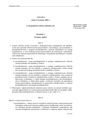 ©Kancelaria Sejmu s. 1/16 USTAWA z dnia 5 kwietnia 2002 r. Opracowano na podstawie: Dz.U. z 2002 r. Nr 62, poz. 556. o europejskich radach zakładowych Rozdział 1 Przepisy ogólne Art. 1. 1. Ustawa określa zasady tworzenia i funkcjonowania europejskich rad zakładowych oraz sposoby informowania pracowników i konsultacji z pracownikami w przedsiębiorstwach i grupach przedsiębiorstw, których działalność ma zasięg wspólnotowy, w celu realizacji prawa pracowników do informacji i konsultacji. Ustawa nie narusza uprawnień do informacji i konsultacji określonych w przepisach odrębnych. 2. Ustawa ma zastosowanie do: 1) przedsiębiorstw i grup przedsiębiorstw o zasięgu wspólnotowym, których zarząd centralny ma siedzibę w Polsce, 2) przedsiębiorstw i grup przedsiębiorstw o zasięgu wspólnotowym, których zarząd centralny nie ma siedziby w państwie członkowskim, jeżeli zarząd ten wyznaczył swojego przedstawiciela z siedzibą w Polsce, 3) przedsiębiorstw i grup przedsiębiorstw o zasięgu wspólnotowym, których zarząd centralny nie ma siedziby w państwie członkowskim i nie wyznaczył przedstawiciela w państwie członkowskim, jeżeli w Polsce znajduje się zakład pracy wchodzący w skład takiego przedsiębiorstwa lub przedsiębiorstwo wchodzące w skład takiej grupy, w których zatrudnia się największą liczbę pracowników zatrudnionych w państwach członkowskich w danym przedsiębiorstwie lub grupie przedsiębiorstw. 3. Obowiązki i odpowiedzialność nałożone przez ustawę na zarząd centralny spoczywają odpowiednio na wyznaczonym przedstawicielu albo na zarządzie zakładu pracy lub przedsiębiorstwa, o których mowa w ust. 2 pkt 2 i 3. Art. 2. Ilekroć w ustawie jest mowa o: 1) przedsiębiorcy - należy przez to rozumieć osobę fizyczną, osobę prawną oraz niemającą osobowości prawnej spółkę prawa handlowego, która zawodowo, we własnym imieniu podejmuje i wykonuje działalność gospodarczą, jak również działalność wytwórczą w rolnictwie w zakresie upraw rolnych oraz 07-06-02 ©Kancelaria Sejmu s. 2/16 chowu i hodowli zwierząt, ogrodnictwa, warzywnictwa, leśnictwa i rybactwa śródlądowego, 2) grupie przedsiębiorstw - należy przez to rozumieć dwa lub więcej przedsiębiorstwa należące do przedsiębiorców powiązanych organizacyjnie lub kapitałowo, z których jeden jest przedsiębiorcą sprawującym kontrolę nad innymi, 3) przedsiębiorstwie o zasięgu wspólnotowym - należy przez to rozumieć przedsiębiorstwo należące do przedsiębiorcy zatrudniającego w zakładach pracy co najmniej 1000 pracowników w państwach członkowskich, w tym co najmniej po 150 pracowników w co najmniej dwóch państwach członkowskich, 4) grupie przedsiębiorstw o zasięgu wspólnotowym - należy przez to rozumieć grupę przedsiębiorstw, w której zatrudnia się co najmniej 1000 pracowników w państwach członkowskich, w tym co najmniej po 150 pracowników w co najmniej dwóch państwach członkowskich, 5) zarządzie centralnym – należy przez to rozumieć osobę lub organ zarządzający przedsiębiorstwem o zasięgu wspólnotowym lub przedsiębiorstwem należącym do przedsiębiorcy sprawującego kontrolę w grupie przedsiębiorstw o zasięgu wspólnotowym, 6) konsultacji - należy przez to rozumieć wymianę poglądów lub podjęcie dialogu między przedstawicielami pracowników a centralnym zarządem lub innym zarządem odpowiedniego szczebla, 7) państwach członkowskich - należy przez to rozumieć państwa członkowskie Unii Europejskiej oraz pozostałe państwa, które podpisały Traktat o Europejskiej Przestrzeni Gospodarczej, 8) europejskiej radzie zakładowej - należy przez to rozumieć radę ustanowioną zgodnie z rozdziałem 3 bądź utworzoną zgodnie z rozdziałem 4 w celu realizacji prawa pracowników do informacji i konsultacji, 9) specjalnym zespole negocjacyjnym - należy przez to rozumieć zespół utworzony zgodnie z rozdziałem 2 w celu zawarcia z zarządem centralnym porozumienia o ustanowieniu europejskiej rady zakładowej lub ustaleniu sposobu informowania pracowników i konsultacji z pracownikami. Art. 3. 1. Liczby pracowników, o których mowa w art. 2 pkt 3 i 4, ustala się na podstawie przeciętnej liczby zatrudnionych w okresie ostatnich 2 lat przed złożeniem wniosku lub wystąpieniem z inicjatywą negocjacji w sprawie ustanowienia europejskiej rady zakładowej lub sposobu informowania pracowników i konsultacji z pracownikami. 2. Przy ustalaniu przeciętnej liczby pracowników uwzględnia się osoby zatrudnione na podstawie stosunku pracy, po przeliczeniu na pełny wymiar czasu pracy. W celu obliczenia przeciętnej liczby zatrudnionych w okresie ostatnich 2 lat dodaje się przeciętne liczby zatrudnionych w poszczególnych miesiącach i otrzymaną sumę dzieli przez 24. 3. Po osiągnięciu wielkości zatrudnienia, o której mowa w art. 2 pkt 3 i 4, zarząd centralny niezwłocznie zawiadamia o tym przedstawicieli pracowników repre07-06-02 ©Kancelaria Sejmu s. 3/16 zentujących ich interesy, zgodnie z ustawodawstwem państwa członkowskiego, oraz podaje tę informację do wiadomości pracowników w sposób przyjęty w danym zakładzie pracy. Art. 4. 1. Za przedsiębiorcę sprawującego kontrolę nad innym przedsiębiorcą uważa się przedsiębiorcę, który może bezpośrednio lub pośrednio wywierać dominujący wpływ na funkcjonowanie innego przedsiębiorcy, w szczególności z tytułu własności, posiadanych udziałów lub akcji albo na mocy przepisów prawa lub umów ustanawiających powiązania organizacyjne między przedsiębiorcami. 2. Przedsiębiorca ma dominujący wpływ na funkcjonowanie innego przedsiębiorcy (przedsiębiorcy zależnego), jeżeli posiada: 1) co najmniej 50% udziałów (akcji) przedsiębiorcy zależnego, albo 2) większość głosów w zgromadzeniu wspólników (walnym zgromadzeniu akcjonariuszy) przedsiębiorcy zależnego, albo 3) prawo do powołania lub odwołania ponad