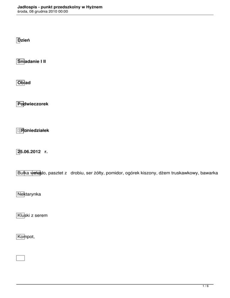 Jadłospis - punkt przedszkolny w Hyżnem środa, 08 grudnia 2010 00:00 Dzień Śniadanie I II Obiad Podwieczorek Poniedziałek 25.06.2012 r. Bułka weka, masło, pasztet z drobiu, ser żółty, pomidor, ogórek kiszony, dżem truskawkowy, bawarka Nektarynka Kluski z serem Kompot, 1/6 Jadłospis - punkt przedszkolny w Hyżnem środa, 08 grudnia 2010 00:00 Barszcz czerwony z jajkiem i kiełbasą wiejską Sok owocowy Wtorek 26.06.2012 r. Zupa mleczna – płatki, drożdżówki wielo smakowe Winogrono białe Ziemniaki, siekane, frykadelki kapusta francuskie zabielana Kompot Zupa grochowa z gwiazdeczkami, na skrzydełkach 2/6 Jadłospis - punkt przedszkolny w Hyżnem środa, 08 grudnia 2010 00:00 Czekolada mleczna Środa 27.06..2012 r. Pieczywo schab mieszane, zdżem majerankiem, sałatka morelowy, jarzynowa, masło, kakaoserek topiony, pomidor, rzodkiewka, Banany Kasza kuskus, filet z indyka w sosie szpinakowym, sałatka z czerwonych pomidorów Kompot, Zupa ryżowa, na skrzydełkach Deser mleczny Czwartek 3/6 Jadłospis - punkt przedszkolny w Hyżnem środa, 08 grudnia 2010 00:00 28.06.2012 r. Bułka maślano – razowa, masło, Filet drobiowy, jajko , serek bieluch ze szczypiorkiem, pomidor, marmolada różana, kawa inka Arbuz Ziemniaki, łosoś panierowany, surówka z kiszonej kapusty Kompot Zupa pomidorowa z tartą, na kurczakach 4/6 Jadłospis - punkt przedszkolny w Hyżnem środa, 08 grudnia 2010 00:00 Lizak Piątek 29.06.2012 r. Pieczywo zemieszane, szczypiorkiem, krem masło, czekoladowy, herbata makrela owocowa w oleju z cebulką i ogórkiem kiszonym, serek ziarnisty Gruszka Pierogi ruskie, marchewka z pomarańczą Kompot Zupa brokułowa z groszkiem ptysiowym Kisiel owocowy 5/6 Jadłospis - punkt przedszkolny w Hyżnem środa, 08 grudnia 2010 00:00 6/6