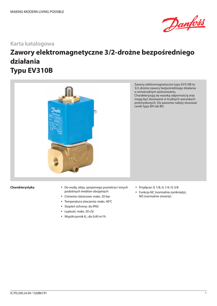 MAKING MODERN LIVING POSSIBLE Karta katalogowa Zawory elektromagnetyczne 3/2-drożne bezpośredniego działania Typu EV310B Zawory elektromagnetyczne typu EV310B to 3/2-drożne zawory bezpośredniego działania o uniwersalnym zastosowaniu. Charakteryzują się wysoką odpornością oraz mogą być stosowane w trudnych warunkach przemysłowych. Do zaworów należy stosować cewki typu BA lub BD. Charakterystyka yy Do wody, oleju, sprężonego powietrza i innych podobnych mediów obojętnych yy Ciśnienie różnicowe: maks. 20 bar yy Przyłącze: G 1/8, G 1/4 i G 3/8 yy Funkcja NC (normalnie zamknięty), NO (normalnie otwarty) yy Temperatura otoczenia: maks. 40°C yy Stopień ochrony: do IP65 yy Lepkość: maks. 50 cSt yy Współczynnik Kv : do 0,40 m3/h IC.PD.200.J4.49 / 520B6191 1 Karta katalogowa Korpusy zaworów wykonane z mosiądzu, funkcja NC Korpusy zaworów wykonane z mosiądzu, funkcja NO Zawory elektromagnetyczne typu EV310B Przyłącze ISO 228/1 Materiał Gniazdo uszczelnień DN Wartość kv [m³/h] Dopuszczalne ciśnienie różnicowe, min. do maks. [bar] Temperatura medium, min. do maks. [°C] Numer katalogowy G 1/8 FKM 1,5 0,08 0–20 -10–100 032U4900 G 1/8 FKM 2,0 0,15 0–16 -10–100 032U4901 G 1/8 FKM 3,0 0,30 0–7 -10–100 032U4902 G 1/4 FKM 1,5 0,08 0–20 -10–100 032U4903 G 1/4 FKM 2,0 0,15 0–16 -10–100 032U4904 G 1/4 FKM 3,0 0,30 0–7 -10–100 032U4905 G 1/4 FKM 3,5 0,40 0–5 -10–100 032U4906 G 3/8 FKM 2,0 0,15 0–16 -10–100 032U4907 G 3/8 FKM 3,0 0,30 0–7 -10–100 032U4908 G 3/8 FKM 3,5 0,40 0–5 -10–100 032U4909 Materiał uszczelnień Gniazdo DN Wartość kv [m³/h] Dopuszczalne ciśnienie różnicowe, min. do maks. [bar] Temperatura medium, min. do maks. [°C] Numer katalogowy G 1/8 FKM 1,5 0,08 0–20 -10–100 032U4926 G 1/8 FKM 2,0 0,15 0–16 -10–100 032U4927 G 1/4 FKM 1,5 0,08 0–20 -10–100 032U4929 G 1/4 FKM 2,0 0,15 0–16 -10–100 032U4930 G 1/4 FKM 3,0 0,30 0–7 -10–100 032U4931 G 3/8 FKM 2,0 0,15 0–16 -10–100 032U4933 G 3/8 FKM 3,0 0,30 0–7 -10–100 032U4934 Przyłącze ISO 228/1 Korpusy zaworów wykonane z mosiądzu, funkcja NO z układem ręcznego zamykania Przyłącze ISO 228/1 G 1/4 Materiał uszczelnień Gniazdo DN Wartość kv [m³/h] Dopuszczalne ciśnienie różnicowe, min. do maks. [bar] Temperatura medium, min. do maks. [°C] Numer katalogowy FKM 2.0 0.15 0 – 16 -10 – 100 032U4944 IC.PD.200.J4.49 / 520B6191 2 Karta katalogowa Zawory elektromagnetyczne typu EV310B Korpusy zaworów wykonane z mosiądzu, funkcja NC z kołnierzem (FL) Przyłącze ISO 228/1 Materiał uszczelnień Gniazdo DN Wartość kv [m³/h] Dopuszczalne ciśnienie różnicowe, min. do maks. [bar] Temperatura medium, min. do maks. [°C] Numer katalogowy FKM 2,0 0,15 0–16 -10–100 032U4912 Kołnierz 32 x 32 Korpusy zaworów wykonane z mosiądzu, funkcja NC z kołnierzem (FL) i układem ręcznego otwierania Przyłącze ISO 228/1 Materiał uszczelnień Gniazdo DN Wartość kv [m³/h] Dopuszczalne ciśnienie różnicowe, min. do maks. [bar] Temperatura medium, min. do maks. [°C] Numer katalogowy FKM 2,0 0,15 0–16 -10–100 032U4923 Kołnierz 32 x 32 Dane techniczne Typ EV310B Czas otwierania [ms] 1) 10–20 Czas zamykania [ms] 10–20 1) 1) Podane czasy są orientacyjne. Typ EV310B Montaż Zalecany montaż w pozycji poziomej z cewką skierowaną ku górze Maks. ciśnienie testowe 50 bar Ciśnienie robocze 0–20 bar Temperatura otoczenia Maks. 40°C Lepkość Maks. 50 cSt Materiały Korpus zaworu Mosiądz Nr 2.0402 Zwora Stal nierdzewna Nr 1.4105/AISI 430FR Tuleja zwory Stal nierdzewna Nr 1.4306/AISI 304L Ogranicznik zwory Stal nierdzewna Nr 1.4105/AISI 430FR Sprężyna Stal nierdzewna Nr 1.4310/AISI 301 Materiał uszczelnień FKM IC.PD.200.J4.49 / 520B6191 – 3 Karta katalogowa Zawory elektromagnetyczne typu EV310B Wymiary i masa, zawory NC / NO / NO (RZ) NC/NO G 1/8 A Masa bez cewki: 0,220 kg Wymiary i masa, zawory NC FL / NC FL (RO) NC FL Widok od spodu A: Przyłącze robocze P: Przyłącze ciśnieniowe Masa bez cewki: 0,185 kg Kątmontażu IC.PD.200.J4.49 / 520B6191 4 Karta katalogowa Zawory elektromagnetyczne typu EV310B Cewki do zaworów EV310B Cewka Moc Stopień ochrony Charakterystyka BA/BD, przykręcana 9 W a.c. 15 W a.c. 15 W d.c. Styki płaskie IP00 zgodnie z DIN 43650-A IP65 z wtykiem o numerze 042N0156 Opis GDM 2011 (szary) zgodny z normą DIN 43650-A PG11 do cewek BA, BD Numer katalogowy 042N0156 Zestaw części zamiennych ø ø Akcesoria: wtyk do cewki Typ cewki, montaż Typ Materiał uszczelnień Gwintowane NC FKM 032U2033 Gwintowane NO FKM 032U2035 Kołnierz NO FKM 032U2036 Typ przyłącza Numer katalogowy IC.PD.200.J4.49 / 520B6191 W zestawie części znajduje się: Zwora z płytką zaworu i sprężyną 5 Karta katalogowa Zawory elektromagnetyczne typu EV310B Zasada działania, zawory typu NC 1. Cewka 2. Zwora 3. Sprężyna zamykająca 4. Płytka zaworu P: Przyłącze ciśnienia (1) A: Przyłącze robocze (2) R: Przyłącze upustowe (3) Brak napięcia na cewce (zawór zamknięty): Po odłączeniu napięcia od cewki (1) zwora (2) z płytkami zaworu (4) jest dociskana przez sprężynę zamykającą (3) i zamyka połączenie między gniazdami P i A. Jednocześnie połączenie między gniazdami A i R zostaje otwarte. Połączenie między gniazdami P i A pozostanie zamknięte tak długo, jak do cewki nie będzie podłączone napięcie. NC: R (3) (3) NO: P (1) NO: R (3) NC: P (1) (1) Zasada działania, zawory typu NO A (2) (2) Brak napięcia na cewce (zawór otwarty): Po odłączeniu napięcia zwora (2) z płytkami zaworu (4) zostaje dociśnięta za pomocą sprężyny otwierającej (3) i zamyka połączenie między gniazdami A i R. Jednocześnie połączenie między gniazdami P i A zostaje otwarte. Połączenie między gniazdami P i A będzie otwarte tak długo, jak do cewki nie będzie podłączone napięcie. W przypadku zaworów z funkcją ręcznego zamykania (RZ), połączenie między gniazdami P i A może zostać zamkni