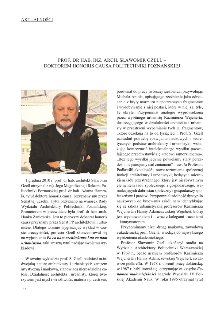 AKTUALNO(CI PROF. DR HAB. IN). ARCH. S*AWOMIR GZELL – DOKTOREM HONORIS CAUSA POLITECHNIKI POZNA+SKIEJ 1 grudnia 2010 r. prof. dr hab. architekt S awomir Gzell otrzyma z r!k Jego MagniÞcencji Rektora Politechniki Pozna"skiej prof. dr hab. Adama Hamrola, tytu doktora honoris causa, przyznany mu przez Senat tej uczelni. Tytu przyznano na wniosek Rady Wydzia u Architektury Politechniki Pozna"skiej. Promotorem w przewodzie by a prof. dr hab. arch. Hanka Zaniewska. Jest to pierwszy doktorat honoris causa przyznany przez Senat PP architektowi i urbani#cie. Dlatego w a#nie wyg aszaj!c wyk ad w czasie uroczysto#ci, profesor Gzell skoncentrowa si$ na wyja#nieniu Po co nam architektura i na co nam urbanistyka, taki zreszt! tytu nadaj!c swojemu wyk adowi. W swoim wyk adzie prof. S. Gzell podniós m.in. dwojak! natur$ architektury i urbanistyki: zarazem artystyczn! i naukow!, stanowi!c! nierozdzieln! cao#%. Dzia alno#% architekta i urbanisty, której tworzywem jest my#l i wra&liwo#%, materia i przestrze", 132 porówna do pracy twórczej rze'biarza, przywo uj!c Micha a Anio a, opisuj!cego rze'bienie jako odrzucanie z bry y marmuru niepotrzebnych fragmentów i wydobywanie z niej postaci, które w niej s!, tyle, &e ukryte. Przypomnia analogi$ wyprowadzon! przez wybitnego urbanist$ Kazimierza Wejcherta, dostrzegaj!cego w dzia alno#ci architekta i urbanisty w przestrzeni wype nianie tych jej fragmentów, „które oczekuj! na to od tysi!cleci”. Prof. S. Gzell uzasadni potrzeb$ rozwijania naukowych i teoretycznych podstaw architektury i urbanistyki, wskazuj!c konieczno#% intelektualnego wysi ku pozwalaj!cego przeciwstawi% si$ « adowi samorzutnemu». „Bez tego wysi ku jedynie powielamy stary porz!dek i nie panujemy nad zmianami” – uwa&a Profesor. Podkre#li aktualno#% i nowe rozumienie spo ecznej funkcji architektury i urbanistyki, b$d!cych miernikiem adu przestrzennego, który jest niezbywalnym elementem adu spo ecznego i gospodarczego, warunkuj!cych dobrostan spo eczny i gospodarczy spoecze"stw i pa"stw. Przypomnia zdolno#% dyscyplin naukowych do kreowania szkó , sam identyÞkuj!c si$ ze szko ! urbanistyczn! profesorów Kazimierza Wejcherta i Hanny Adamczewskiej Wejchert, której jest wychowankiem i – wraz z kolegami i uczniami – kontynuatorem. Przypominamy ni&ej drog$ naukow!, zawodow! i akademick! prof. Gzella, wiod!c! do najwy&szego wyró&nienia akademickiego. Profesor S awomir Gzell uko"czy studia na Wydziale Architektury Politechniki Warszawskiej w 1969 r., b$d!c uczniem profesorów Kazimierza Wejcherta i Hanny Adamczewskiej Wejchert, co zawsze podkre#la. W 1978 r. obroni prac$ doktorsk!, w 1987 r. habilitowa si$, otrzymuj!c za ksi!&k$ Fenomen ma omiejsko!ci nagrod$ Wydzia u IV Polskiej Akademii Nauk. W roku 1996 otrzyma tytu naukowy profesora, a w 2001 r. zosta profesorem zwyczajnym na Politechnice Warszawskiej. Od uko"czenia studiów pracuje na Wydziale Architektury Politechniki Warszawskiej. Od 1990 r. kieruje zorganizowanym przez siebie zak adem, najpierw by to Zak ad Projektowania Przestrzeni dla Spo eczno#ci Lokalnych, a obecnie jest to Zak ad Projektowania Urbanistycznego i Krajobrazu Wiejskiego. Lubi do#wiadcza% szerokiego #wiata, a mo&e ogólniej – przestrzeni, sporo je'dzi i ch$tnie dzieli si$ swoj! wiedz!. Wielokrotnie wyg asza wyk ady go#cinne w uczelniach w kraju i za granic!, otrzymywa te& zagraniczne granty, w tym stypendium Fulbrighta na uniwersytecie w Waszyngtonie. Dzi$ki udzia owi we w adzach mi$dzynarodowych stowarzysze" naukowych i zawodowych mia mo&no#% czynnie uczestniczy% w kszta towaniu wspó czesnej my#li urbanistycznej w Europie, co zosta o uhonorowane w 2008 r. wyborem na cz onka korespondenta Deutsche Akademie für Städtebau und Landesplanung (DASL). Wspó dzia anie z innymi uczelniami i organizacjami mi$dzynarodowymi obejmowa o ponadto: wspó prac$ z Technicznym Uniwersytetem w Berlinie, cz onkostwo Rady Association of European Schools of Planning (AESOP), cz onkostwo Biura i Zarz!du i przewodniczenie polskiej grupie (do 2003 r.) International Society of City and Regional Planners (ISOCARP), cz onkostwo International Planning History Society (IPHS). Prof. Gzell by te& do 2000 r. prezesem Stowarzyszenia „Polonia Nostra - Nasza Polska”, cz onka mi$dzynarodowej organizacji Europa Nostra, zajmuj!cej si$ ochron! dziedzictwa kulturowego. Od dawna datuj! si$ zwi!zki prof. Gzella z Polsk! Akademi! Nauk. W 1987 r. prof. S. Gzell zosta cz onkiem Sekcji Urbanistyki Komitetu Architektury i Urbanistyki PAN. Od roku 1990 jest cz onkiem Komitetu Architektury i Urbanistyki w kolejnych kadencjach, w latach 1999 - 2002 by wice-przewodnicz!cym Komitetu. Pracuje tak&e w zespo ach Komitetu Przestrzennego Zagospodarowania Kra- ju przy Prezydium PAN. W ostatnich latach wiele uwagi po#wi$ca rozwojowi kadr naukowych, pracuj!c w Centralnej Komisji ds. Stopni i Tytu ów, wybrany do niej w roku 2006 i ponownie – w ubieg ym roku. Od wielu lat jest w sk adzie G ównej Komisji Urbanistyczno Architektonicznej, obecnie jako jej wice-przewodnicz!cy. Prof. S. Gzell ma dorobek publikacyjny licz!cy ponad 200 pozycji. Sk ada si$ na t$ liczb$ oko o 90 referatów na konferencjach naukowych (blisko 40 mi$dzynarodowych), oko o 90 artyku ów i komunikatów w profesjonalnych periodykach, kilka ksi!&ek i redakcji ksi!&ek, w tym Krajobraz architektoniczny Warszawy w ko"cu XX wieku. Jest za o&ycielem i wydawc! rocznika „Urbanistyka. Mi dzyuczelniane Zeszyty Naukowe”, wychodz!cego od lat pi$tnastu. Prof. Gzell wypromowa 13 doktorów, jest recenzentem blisko 50 prac doktorskich, a tak&e opiniodawc! oko o 50 innych akademickich prac awansowych (habilitacje, profesury). Jest tak&e promotorem blisko 120 magisterskich prac dyplomowych na WA PW. Równocze#nie z prac! na uczelni prof. S. Gzell pracowa w kilku biurach projektowych w Warszawie, Bia ymstoku, Poznaniu i na budowie za granic!. Od 1990 r. prowadzi te& w asn! pracowni$ projektow!, specjalizuj!c! si$ w opracowaniach urbanistycznych. Ma w