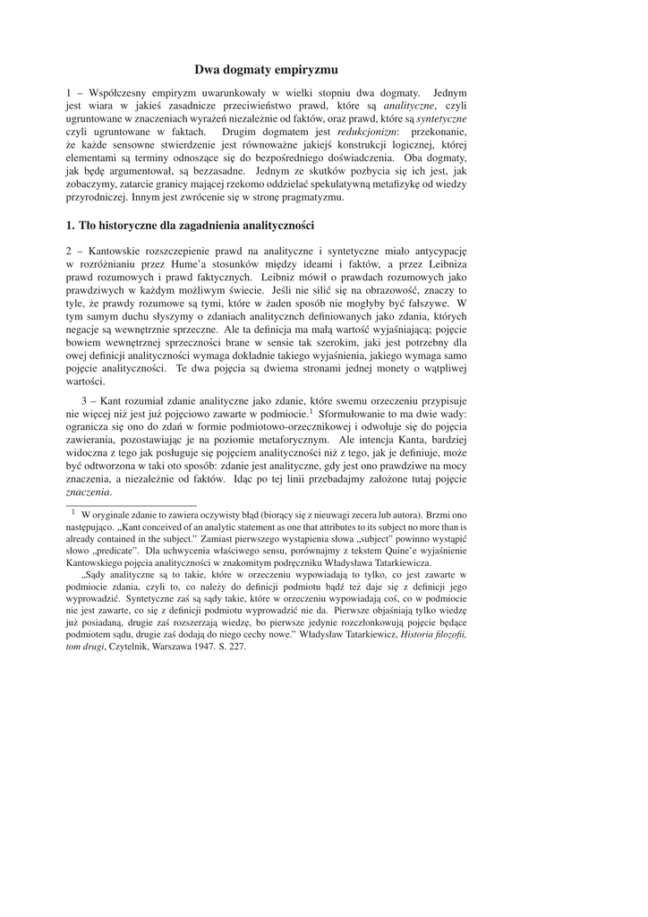 Dwa dogmaty empiryzmu 1 – Współczesny empiryzm uwarunkowały w wielki stopniu dwa dogmaty. Jednym jest wiara w jakieś zasadnicze przeciwieństwo prawd, które sa˛ analityczne, czyli ugruntowane w znaczeniach wyrażeń niezależnie od faktów, oraz prawd, które sa˛ syntetyczne czyli ugruntowane w faktach. Drugim dogmatem jest redukcjonizm: przekonanie, że każde sensowne stwierdzenie jest równoważne jakiejś konstrukcji logicznej, której elementami sa˛ terminy odnoszace ˛ si˛e do bezpośredniego doświadczenia. Oba dogmaty, jak b˛ed˛e argumentował, sa˛ bezzasadne. Jednym ze skutków pozbycia si˛e ich jest, jak zobaczymy, zatarcie granicy majacej ˛ rzekomo oddzielać spekulatywna˛ metafizyk˛e od wiedzy przyrodniczej. Innym jest zwrócenie si˛e w stron˛e pragmatyzmu. 1. Tło historyczne dla zagadnienia analityczności 2 – Kantowskie rozszczepienie prawd na analityczne i syntetyczne miało antycypacj˛e w rozróżnianiu przez Hume’a stosunków mi˛edzy ideami i faktów, a przez Leibniza prawd rozumowych i prawd faktycznych. Leibniz mówił o prawdach rozumowych jako prawdziwych w każdym możliwym świecie. Jeśli nie silić si˛e na obrazowość, znaczy to tyle, że prawdy rozumowe sa˛ tymi, które w żaden sposób nie mogłyby być fałszywe. W tym samym duchu słyszymy o zdaniach analitycznch definiowanych jako zdania, których negacje sa˛ wewn˛etrznie sprzeczne. Ale ta definicja ma mała˛ wartość wyjaśniajac ˛ a; ˛ poj˛ecie bowiem wewn˛etrznej sprzeczności brane w sensie tak szerokim, jaki jest potrzebny dla owej definicji analityczności wymaga dokładnie takiego wyjaśnienia, jakiego wymaga samo poj˛ecie analityczności. Te dwa poj˛ecia sa˛ dwiema stronami jednej monety o watpliwej ˛ wartości. 3 – Kant rozumiał zdanie analityczne jako zdanie, które swemu orzeczeniu przypisuje nie wi˛ecej niż jest już poj˛eciowo zawarte w podmiocie.1 Sformułowanie to ma dwie wady: ogranicza si˛e ono do zdań w formie podmiotowo-orzecznikowej i odwołuje si˛e do poj˛ecia zawierania, pozostawiajac ˛ je na poziomie metaforycznym. Ale intencja Kanta, bardziej widoczna z tego jak posługuje si˛e poj˛eciem analityczności niż z tego, jak je definiuje, może być odtworzona w taki oto sposób: zdanie jest analityczne, gdy jest ono prawdziwe na mocy znaczenia, a niezależnie od faktów. Idac ˛ po tej linii przebadajmy założone tutaj poj˛ecie znaczenia. 1 W oryginale zdanie to zawiera oczywisty bład ˛ (bioracy ˛ si˛e z nieuwagi zecera lub autora). Brzmi ono nast˛epujaco. ˛ „Kant conceived of an analytic statement as one that attributes to its subject no more than is already contained in the subject.” Zamiast pierwszego wystapienia ˛ słowa „subject” powinno wystapić ˛ słowo „predicate”. Dla uchwycenia właściwego sensu, porównajmy z tekstem Quine’e wyjaśnienie Kantowskiego poj˛ecia analityczności w znakomitym podr˛eczniku Władysława Tatarkiewicza. „Sady ˛ analityczne sa˛ to takie, które w orzeczeniu wypowiadaja˛ to tylko, co jest zawarte w podmiocie zdania, czyli to, co należy do definicji podmiotu badź ˛ też daje si˛e z definicji jego wyprowadzić. Syntetyczne zaś sa˛ sady ˛ takie, które w orzeczeniu wypowiadaja˛ coś, co w podmiocie nie jest zawarte, co si˛e z definicji podmiotu wyprowadzić nie da. Pierwsze objaśniaja˛ tylko wiedz˛e już posiadana,˛ drugie zaś rozszerzaja˛ wiedz˛e, bo pierwsze jedynie rozczłonkowuja˛ poj˛ecie b˛edace ˛ podmiotem sadu, ˛ drugie zaś dodaja˛ do niego cechy nowe.” Władysław Tatarkiewicz, Historia filozofii, tom drugi, Czytelnik, Warszawa 1947. S. 227. 2 Dwa dogmaty empiryzmu – Przekład 4 – Znaczenia, przypomnijmy, nie należy utożsamiać z nazywaniem. Fregego przykład nazw „Gwiazda Wieczorna” i „Gwiazda Poranna”, jak i Russella „Scott” i „autor Waverley’a”, ilustruje to, że terminy moga˛ nazywać t˛e sama˛ rzecz lecz różnić si˛e znaczeniem. Odróżnienie znaczenia i nazywania jest nie mniej ważne na poziomie terminów abstrakcyjnych. Terminy „9” i „liczba planet” nazywaja˛ jeden i ten sam byt abstrakcyjny lecz rozsadnie ˛ jest przyjać, ˛ że różnia˛ si˛e one znaczeniem; trzeba bowiem dokonać obserwacji astronomicznej a nie samej refleksji nad znaczeniami, żeby rozpoznać, że chodzi o jedna˛ i t˛e sama˛ rzecz. 5 – Powyższe przykłady składaja˛ si˛e z terminów jednostkowych, tak konkretnych jak i abstrakcyjnych. Co si˛e tyczy terminów ogólnych czyli predykatów, sytuacja jest nieco odmienna lecz analogiczna. Podczas gdy termin jednostkowy ma nazywać jakaś ˛ rzecz, abstrakcyjna˛ lub konkretna,˛ nie jest to intencja˛ terminu ogólnego; termin ogólny natomiast jest prawdziwy o jakiejś rzeczy, albo o każdej spośród wielu, albo o żadnej [gdy jest pusty]. Klasa wszystkich rzeczy, o których prawdziwy jest termin ogólny nazywa si˛e zakresem tego terminu. Obecnie, równolegle do przeciwstawienia mi˛edzy znaczeniem terminu jednostkowego i nazwana˛ rzecza,˛ musimy tak samo rozróżnić mi˛edzy znaczeniem terminu ogólnego i jego zakresem. Na przykład, terminy ogólne „istota majaca ˛ serce” i „istota majaca ˛ nerki” maja˛ zapewne ten sam zakres lecz różnia˛ si˛e znaczeniem. 6 – Pomieszanie znaczenia z zakresem jest w przypadku terminów ogólnych mniej powszechne niż pomieszanie znaczenia z nazywaniem w przypadku terminów jednostkowych. Istotnie, jest rzecza˛ w filozofii powszechna˛ przeciwstawiać intensj˛e (czyli znaczenie) ekstensji [czyli zakresowi], albo, w alternatywnej terminologii, konotacj˛e denotacji. 7 – Niewatpliwie ˛ arystotelesowskie poj˛ecie istoty było prekursorem współczesnego poj˛ecia intensji czyli znaczenia. Wedlug Arystotelesa istotne jest dla człowieka być rozumnym, przypadkowe być dwunożnym. Jest jednak istotna różnica mi˛edzy tym pogladem ˛ a nauka˛ o znaczeniu. Z punktu widzenia tej drugiej rzeczywiście można s