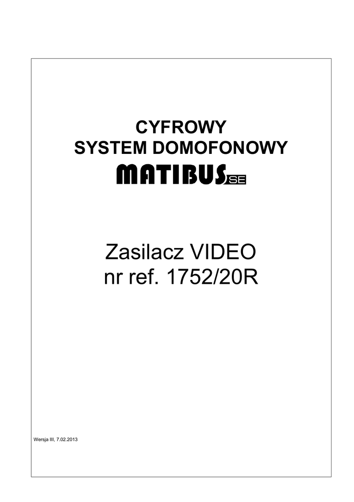 CYFROWY SYSTEM DOMOFONOWY Zasilacz VIDEO nr ref. 1752/20R Wersja III, 7.02.2013 ZASILACZ NR REF. 1752/20R INFORMACJE OGÓLNE / INSTRUKCJA OBSŁUGI ZASILACZ VIDEO NR REF. 1752/20R INSTRUKCJA OBSŁUGI PROGRAMOWANIE TRYBU PRACY Załączenie zasilania sygnalizowane jest ciągłym świeceniem zielonej diody LED. Ustawienie trybu pracy zasilacza: • Tryb RISER - naciśniecie i trzymanie przycisku PROG w trybie bezczynności powoduje miganie czerwonej diody z częstotliwością 0,5Hz. Puszczenie przycisku przy pierwszym mignięciu, powoduje załączenie pierwszego bloku zacisków AB jako RISER, analogicznie aż do 4 mignięcia. • Puszczenie przycisku PROG przy piątym lub wyższym mignięciu diody LED powoduje wyłączenie trybu RISER i załączenie trybu NORMAL. Fabrycznie zasilacz pracuje w trybie NORMAL. INFORMACJE OGÓLNE TRYB PRACY NORMAL Zasilacz video nr ref. 1752/20R jest zasilaczem przeznaczonym do instalacji MATIBUSSE w wersji video. Umożliwia on: • Automatyczne zestawienie połączenia video pomiędzy dwoma wybranymi punktami (tryb NORMAL). • Zestawienie połączenia video pomiędzy jednym z trzech dowolnych punktów a pionem (tryb RISER). • Załączenie wzmacniacza video przy konkretnym połączeniu (zasilacz zapamiętuje, przy których połączeniach wzmacniacz video ma być załączony). • Energetyczną obsługę urządzeń video. • Dodatkowo zawiera dwie diody LED wskazujące stan pracy. W trybie pracy NORMAL, początkowo wszystkie pary zacisków AB ustawione są jako wejścia. Zasilacz monitoruje poszczególne wejścia i sprawdza czy sygnał video nie pojawił się na którymś z nich. W momencie gdy na jednej z par zacisków zasilacz wykryje sygnał video, para ta załączana jest jako wejście, natomiast pozostałe ustawia jako wyjścia, na których zasilacz oczekuje na pojawienie się obciążenia (terminancji). Oczekiwanie sygnalizowane jest szybkim (z częstotliwością ok. 3Hz) miganiem czerwonej diody LED. Maksymalny czas oczekiwania na pojawienie się obciążenia wynosi 5s. Po tym czasie dioda LED przestaje migać, a dane wejście nie jest obsługiwane przez zasilacz do momentu zaniku sygnału video. Jeżeli w czasie krótszym niż 5s pojawi się obciążenie (terminancja) wówczas następuje nawiązanie połączenia pomiędzy nadajnikiem (kamerą) a odbiornikiem (np. monitorem lub kolejnym zasilaczem). Nawiązanie połączenia sygnalizowane jest świeceniem czerwonej diody w dwojaki sposób: • Świecenie przez około 1s, a następnie mignięcie (normalny tryb pracy zasilacza - wzmacniacz sygnału wideo wyłączony), • Świecenie przez około 1s a następnie potrójne mignięcie z częstotliwością 2Hz (tryb pracy z załączonym wzmacniaczem sygnału video). Połączenie trwa do momentu zaniknięcia sygnału video na wejściu lub obciążenia na wyjściu. Wówczas zasilacz wraca do stanu oczekiwania (czerwona dioda LED gaśnie). Maksymalny czas połączenia video to 180s. Po upływie tego czasu następuje zerwanie połączenia, a wejście na którym wciąż jest wymuszenie (sygnał z kamery lub obciążenie w postaci terminancji) zostaje odłączone (nieobsługiwane) do momentu ustąpienia wymuszenia. Pozostałe wejścia pracują jak dotychczas. BUDOWA OPIS ZACISKÓW POD PRZEWODY ~0 ~230 R2 R1 SET A1 B1 A2 B2 A3 B3 A4 B4 2 Napięcie sieciowe ~0 V. Napięcie sieciowe ~230 V AC. Napięcie zasilające +18,5 V DC. Masa zasilania. Zacisk wykorzystywany wyłącznie w trybie RISER. Po podaniu sygnału video na jedno z trzech wejść a następnie podaniu masy na zacisk SET następuje zestawienie połączenia video pomiędzy wyjściem pionu a źródłem sygnału video. Pierwsza para zacisków A pary skrętnej stanowiących wejście/ wyjście. Pierwsza para zacisków B pary skrętnej stanowiących wejście/ wyjście. Druga para zacisków A pary skrętnej stanowiących wejście/ wyjście. Druga para zacisków B pary skrętnej stanowiących wejście/ wyjście. Trzecia para zacisków A pary skrętnej stanowiących wejście/ wyjście. Trzecia para zacisków B pary skrętnej stanowiących wejście/ wyjście. Czwarta para zacisków A pary skrętnej stanowiących wejście/ wyjście. Czwarta para zacisków B pary skrętnej stanowiących wejście/ wyjście. TRYB PRACY RISER Dowolna, jedna para zacisków AB może być ustawiona w tryb RISER. Wówczas dla zacisków tych nie będzie istotne wykrywanie obciążenia, ale podanie potencjału masy na zacisk SET. Tylko jedna para zacisków może pracować w trybie RISER. Pozostałe zaciski pracują w trybie NORMAL. Do zacisków, które pracują w trybie RISER należy podłączyć obciążenie. Pozostałe zaciski pełnią funkcję wejść/wyjść. Podanie sygnału video na jedno z wejść oraz podanie potencjału masy na zacisk SET spowoduje zestawienie połączenia video pomiędzy tym wejściem a zaciskami ustawionymi w tryb RISER. Podanie sygnału video na jedną z trzech par zacisków będących wejściami powoduje, że zasilacz oczekuje na pojawienie się na zacisku SET poziomu masy dystrybuując jednocześnie sygnał video na pozostałe wyjścia. Oczekiwanie sygnalizowane jest szybkim (z częstotliwością około 3Hz) miganiem czerwonej diody LED. Czas oczekiwania na pojawienie się sygnału SET lub obciążenia na wyjściach wynosi 5s. Po tym czasie dioda LED przestaje migać, a dane wejście nie jest obsługiwane przez zasilacz do momentu zniknięcia sygnału video. Jeżeli w czasie krótszym niż 5s pojawi się sygnał SET lub obciążenie na wyjściu, wówczas następuje nawiązanie połączenia pomiędzy tymi zaciskami. Rozłączenie następuje w momencie odłączenia masy od zacisku SET lub po zaniku sygnału video. W systemach wielowejściowych tryb RISER należy ustawić w zasilaczach obsługujących piony. ZASILACZ NR REF. 1752/20R INSTRUKCJA OBSŁUGI / DANE TECHNICZNE Maksymalny czas połączenia video to 180s. Po upływie tego czasu następuje zerwanie połączenia, a wejście na którym wciąż jest wymuszenie (