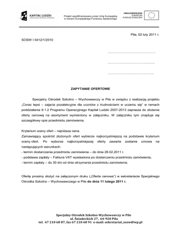 Projekt współfinansowany przez Unię Europejską w ramach Europejskiego Funduszu Społecznego Piła, 02 luty 2011 r. SOSW I 0412/1/2010 ……………………………………. ………………………………..….. …………………………………... ZAPYTANIE OFERTOWE Specjalny Ośrodek Szkolno – Wychowawczy w Pile w związku z realizacją projektu „Coraz lepsi – zajęcia pozalekcyjne dla uczniów z trudnościami w uczeniu się” w ramach poddziałania 9.1.2 Programu Operacyjnego Kapitał Ludzki 2007-2013 zaprasza do złożenia oferty cenowej na asortyment wymieniony w załączniku. W załączniku tym znajduje się szczegółowy opis przedmiotu zamówienia. Kryterium oceny ofert – najniższa cena. Zamawiający spośród złożonych ofert wybierze najkorzystniejszą na podstawie kryterium oceny ofert. Po wyborze najkorzystniejszej oferty zawarta zostanie umowa na następujących warunkach: - termin dostarczenia przedmiotu zamówienia – do dnia 28.02.2011 r. - podstawa zapłaty – Faktura VAT wystawiona po dostarczeniu przedmiotu zamówienia, - termin zapłaty – do 30 dni od dnia otrzymania przedmiotu zamówienia. Ofertę prosimy złożyć na załączonym druku („Oferta cenowa”) w sekretariacie Specjalnego Ośrodka Szkolno – Wychowawczego w Pile do dnia 11 lutego 2011 r. Specjalny Ośrodek Szkolno-Wychowawczy w Pile ul. Śniadeckich 27, 64-920 Piła tel. 67 210 68 87, fax 67 210 68 91 e-mail: [email protected] Projekt współfinansowany przez Unię Europejską w ramach Europejskiego Funduszu Społecznego Załącznik do Zapytania ofertowego Przedmiot zamówienia: KSIĄŻKI Lp. 1. Nazwa, opis Anna Wasilak, Zabawy z chustą. Wyd. Klanza Ilość 1 2. Gimnastyka mózgu - karty z ćwiczeniami. Wyd. International NeuroKinesiology Institute 16 3. Plansze z ćwiczeniami „Gimnastyka Mózgu” (komplet 26 plansz/format A3) Paul Dennison, Gail Dennison, Gimnastyka mózgu w pracy i zabawie. Wyd. International NeuroKinesiology Institute 2 4. 5. 6. 7. 8. 9. Roman Warszewski, Jak wyleczyłem dziecko z dysleksji (książka+kaseta VHS). Wyd. Tower Press Carla Hannaford, Profil dominujący. Jak rozpoznać Twoje Dominujące Oko, Ucho, Półkulę Mózgową, Rękę i Nogę. Wyd. International NeuroKinesiology Institute Erich Ballinger, Wesoła gimnastyka. Wyd. International NeuroKinesiology Institute Paul Dennison, Gail Dennison, Kinezjologia edukacyjna dla dzieci. Wyd. International NeuroKinesiology Institute Paul Dennison, Gail Dennison, Alfabetyczne ósemki. Ćwiczenia programu Gimnastyka Mózgu. Wyd. International NeuroKinesiology Institute 1 1 1 1 1 16 Specjalny Ośrodek Szkolno-Wychowawczy w Pile ul. Śniadeckich 27, 64-920 Piła tel. 67 210 68 87, fax 67 210 68 91 e-mail: [email protected] Projekt współfinansowany przez Unię Europejską w ramach Europejskiego Funduszu Społecznego OFERTA CENOWA KSIĄŻKI Lp . Nazwa Ilość 1. Anna Wasilak, Zabawy z chustą. Wyd. Klanza 1 2. Gimnastyka mózgu - karty z ćwiczeniami. Wyd. International NeuroKinesiology Institute 16 3. Plansze z ćwiczeniami „Gimnastyka Mózgu” (komplet 26 plansz/format A3) Paul Dennison, Gail Dennison, Gimnastyka mózgu w pracy i zabawie. Wyd. International NeuroKinesiology Institute 2 Roman Warszewski, Jak wyleczyłem dziecko z dysleksji (książka+kaseta VHS). Wyd. Tower Press Carla Hannaford, Profil dominujący. Jak rozpoznać Twoje Dominujące Oko, Ucho, Półkulę Mózgową, Rękę i Nogę. Wyd. International NeuroKinesiology Institute Erich Ballinger, Wesoła gimnastyka. Wyd. International NeuroKinesiology Institute Paul Dennison, Gail Dennison, Kinezjologia edukacyjna dla dzieci. Wyd. International NeuroKinesiology Institute Paul Dennison, Gail Dennison, Alfabetyczne ósemki. Ćwiczenia programu Gimnastyka Mózgu. Wyd. International NeuroKinesiology Institute 1 4. 5. 6. 7. 8. 9. Cena jednostkowa brutto 1 1 1 1 16 RAZEM Specjalny Ośrodek Szkolno-Wychowawczy w Pile ul. Śniadeckich 27, 64-920 Piła tel. 67 210 68 87, fax 67 210 68 91 e-mail: [email protected] Wartość brutto Projekt współfinansowany przez Unię Europejską w ramach Europejskiego Funduszu Społecznego 1. Oświadczam, że przedmiot zamówienia dostarczę do siedziby Zamawiającego do dnia ……………………... 2. Wyrażam zgodę na termin zapłaty – do 30 dni od dnia dostarczenia przedmiotu zamówienia. ……………………………… (Miejscowość, data) ……………………………….. (Pieczątka firmowa, podpis) Specjalny Ośrodek Szkolno-Wychowawczy w Pile ul. Śniadeckich 27, 64-920 Piła tel. 67 210 68 87, fax 67 210 68 91 e-mail: [email protected]