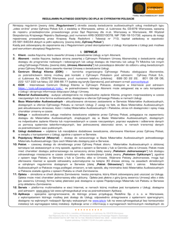 REGULAMIN PŁATNEGO DOSTĘPU DO IPLA W CYFROWYM POLSACIE Niniejszy regulamin (zwany dalej „Regulaminem”) określa zasady świadczenia audiowizualnych usług medialnych typu „video on-line” przez Cyfrowy Polsat S.A. z siedzibą w Warszawie, adres: ul. Łubinowa 4a, 03-878 Warszawa, wpisaną do rejestru przedsiębiorców prowadzonego przez Sąd Rejonowy dla m.st. Warszawy w Warszawie, XIII Wydział Gospodarczy Krajowego Rejestru Sądowego, pod numerem KRS 0000010078, NIP 796-18-10-732, wpisaną do księgi rejestrowej prowadzonej przez Krajową Radę Radiofonii i Telewizji nr 713, kapitał zakładowy w wysokości 25 581 840,64 złotych w pełni wpłacony (zwaną dalej „Cyfrowy Polsat”). Każdy jest zobowiązany do zapoznania się z Regulaminem przed skorzystaniem z Usługi. Korzystanie z Usługi jest możliwe pod warunkiem akceptacji Regulaminu. I. DEFINICJE 1. Klient - osoba fizyczna, która zawarła Umowę o świadczenie Usługi, w tym Abonent. 2. Abonent - osoba fizyczna, będąca stroną zawartej z Cyfrowym Polsatem Umowy Abonenckiej o świadczenie usługi dostępu do programów radiowych i telewizyjnych lub usługi dostępu do Internetu lub usługi TV Mobilna lub innych usług Cyfrowego Polsatu, (zwanej dalej „Umową Abonencką”) lub posiadająca dekoder do odbioru usług świadczonych przez Cyfrowy Polsat, która zawarła również Umowę o świadczenie Usługi. 3. Centrum Obsługi Klienta (COK) – komórka organizacyjna Cyfrowego Polsatu obsługująca Abonentów, za pośrednictwem której możliwy jest kontakt z Cyfrowym Polsatem pod adresem: Cyfrowy Polsat S.A., ul. Łubinowa 4a, 03-878 Warszawa, p o d numerem telefonu (infolinia): 699 00 22 22, 801 08 08 08, 222 127 222 lub faksu: 22 356 66 77 (opłata wg taryfy Operatora), pod adresem e-mail: [email protected]; 4. ICOK - Internetowe Centrum Obsługi Klienta w Cyfrowym Polsacie, dostępne w Internecie pod adresem https://icok.cyfrowypolsat.pl/icok/, za pośrednictwem którego Abonent może zalogować się w celu korzystania z Usługi i otrzymuje informacje dotyczące Usługi i Umowy. 5. Materiał Audiowizualny - audycja udostępniana na indywidualne żądanie Klienta, program rozprowadzany w czasie rzeczywistym lub inna forma audiowizualna, dostępna w ofercie Cyfrowego Polsatu w ramach Usługi. 6. Baza Materiałów Audiowizualnych - aktualizowane okresowo zestawienie w Serwisie Materiałów Audiowizualnych, dostępnych w ofercie Cyfrowego Polsatu w ramach Usługi. Z uwagi na fakt, że Baza Materiałów Audiowizualnych jest aktualizowana okresowo, ilości i rodzaj Materiałów Audiowizualnych i Pakietów, okres ich dostępności i opisy mają charakter zmienny w czasie. 7. Usługa – audiowizualna usługa medialna świadczona odpłatnie przez Cyfrowy Polsat, polegająca na zapewnieniu dostępu do Materiałów Audiowizualnych, znajdujących się w Bazie Materiałów Audiowizualnych, dostępnych na indywidualne żądanie Klienta lub rozprowadzanych w czasie rzeczywistym, poprzez wysyłanie i odbieranie danych za pomocą systemów teleinformatycznych, bez jednoczesnej obecności stron, w ramach transmisji danych za pośrednictwem sieci publicznych. 8. Usługi dodatkowe – odpłatne lub nieodpłatne dodatkowe świadczenia, oferowane Klientowi przez Cyfrowy Polsat, w związku z korzystaniem z Usługi, zgodnie z opisem w Serwisie. 9. Pojedynczy Materiał (Materiał) – dostęp do oznaczonego w Bazie Materiałów Audiowizualnych jednostkowego Materiału Audiowizualnego. Opis cech Materiału dostępny jest w Serwisie. 10. Pakiet – czasowy dostęp do określonego przez Cyfrowy Polsat zbioru Materiałów Audiowizualnych o zbliżonej tematyce lub zestawionych w inny sposób, zgodnie z opisem w Serwisie i/lub w Cenniku albo w Umowie. Pakiet może mieć charakter dostępu jednorazowego na oznaczony okres (dalej zwany „Pakietem Jednorazowym”) lub dostępu odnawialnego miesięcznie w czasie określonym albo nieokreślonym (dalej zwany „Pakietem Cyklicznym”), zgodnie z opisem tego Pakietu w Serwisie i/lub w Cenniku albo w Umowie. Wybrane Pakiety Jednorazowe, mogą być oferowane również w sposób odnawialny automatycznie na kolejne 30 dniowe okresy, na zasadach określonych w odrębnym regulaminie dostępnym w Serwisie (dalej „Pakiet Odnawiany”). Ilość i zakres Materiałów Audiowizualnych w Pakiecie mogą podlegać zmianom, w taki sposób, aby minimalna ilość Materiałów Audiowizualnych w Pakiecie została zgodna z opisem Pakietu w chwili Zamówienia. 11. Opłata – określona w chwili złożenia Zamówienia kwota pieniężna, którą Klient zobowiązany jest uiszczać za Usługę. Opłata może mieć charakter jednorazowy albo cykliczny. Opłata jest płatna z góry (przy zawarciu Umowy) albo z dołu (po zawarciu Umowy), forma takiej płatności jest dostępna w opisie Pojedynczego Materiału lub Pakietu w Serwisie przy składaniu Zamówienia. 12. Serwis – platforma multimedialna w sieci Internet, w ramach której możliwe jest korzystanie z Usługi, dostępna pod adresem www.ipla.tv lub www.cyfrowypolsat.pl oraz za pośrednictwem Aplikacji. 13. Aplikacja - specjalne oprogramowanie, do którego prawa przysługują Redefine Sp. z o. o. w Warszawie, z wykorzystaniem którego możliwy jest dostęp do Usługi, odpowiednio zintegrowane z systemami operacyjnymi, dostępne na wybranych rodzajach Sprzętu wskazanych na www.ipla.tv lub na www.cyfrowypolsat.pl bez konieczności instalacji lub wymagające takiej instalacji. Aplikacja wraz z informacją o wymaganiach technicznych niezbędnych do •••••••••• Cyfrowy Polsat S.A. z siedzibą w Warszawie, ul. Łubinowa 4a, 03-878 Warszawa Sąd Rejonowy dla m.st. Warszawy, XIII Wydział Gospodarczy Krajowego Rejestru Sądowego KRS 0000010078, NIP 796-18-10-732, REGON 670925160, GIOŚ – E0001824WZBW Kapitał zakładowy 13.934.113,44 zł w pełni wpłacony 14. 15. 16. 17. 18. 19. 20. 21. jej zainstalowania dostępna jest pod adresem www.ipla.tv. Zain
