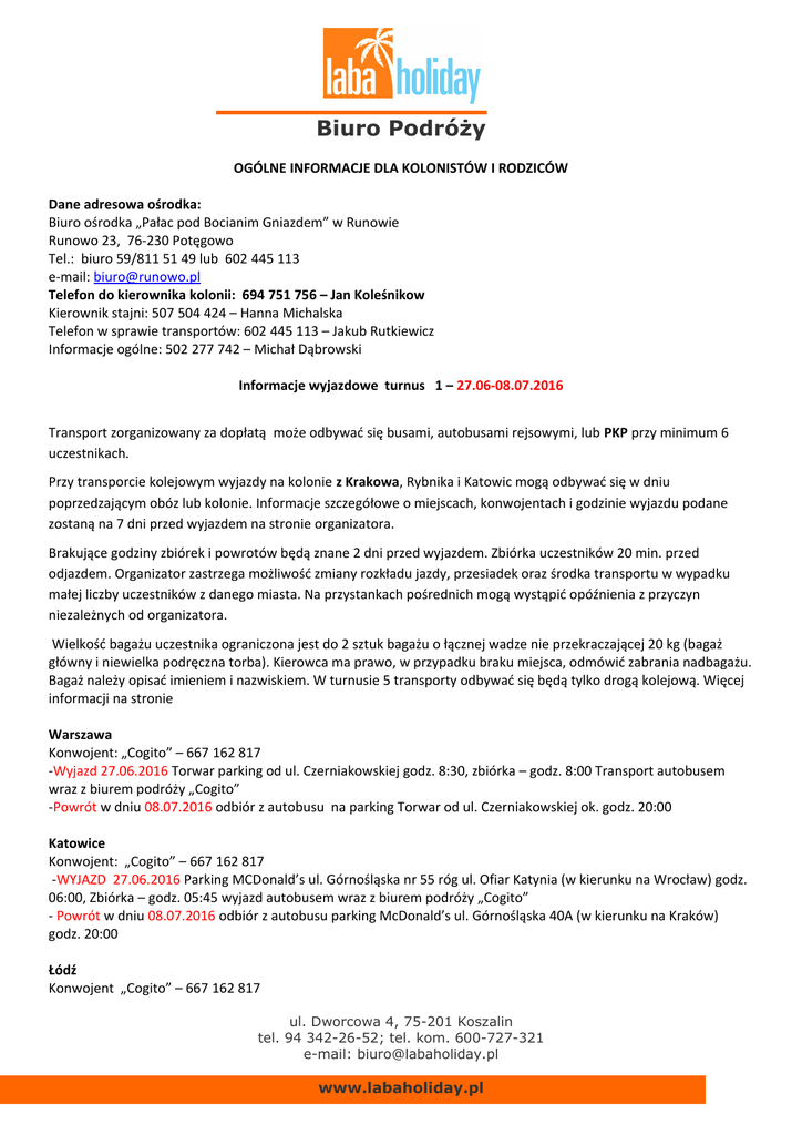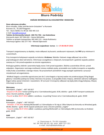 Biuro Podróży OGÓLNE INFORMACJE DLA KOLONISTÓW I RODZICÓW Dane adresowa ośrodka: Biuro ośrodka „Pałac pod Bocianim Gniazdem” w Runowie Runowo 23, 76-230 Potęgowo Tel.: biuro 59/811 51 49 lub 602 445 113 e-mail: [email protected] Telefon do kierownika kolonii: 694 751 756 – Jan Koleśnikow Kierownik stajni: 507 504 424 – Hanna Michalska Telefon w sprawie transportów: 602 445 113 – Jakub Rutkiewicz Informacje ogólne: 502 277 742 – Michał Dąbrowski Informacje wyjazdowe turnus 1 – 27.06-08.07.2016 Transport zorganizowany za dopłatą może odbywać się busami, autobusami rejsowymi, lub PKP przy minimum 6 uczestnikach. Przy transporcie kolejowym wyjazdy na kolonie z Krakowa, Rybnika i Katowic mogą odbywać się w dniu poprzedzającym obóz lub kolonie. Informacje szczegółowe o miejscach, konwojentach i godzinie wyjazdu podane zostaną na 7 dni przed wyjazdem na stronie organizatora. Brakujące godziny zbiórek i powrotów będą znane 2 dni przed wyjazdem. Zbiórka uczestników 20 min. przed odjazdem. Organizator zastrzega możliwość zmiany rozkładu jazdy, przesiadek oraz środka transportu w wypadku małej liczby uczestników z danego miasta. Na przystankach pośrednich mogą wystąpić opóźnienia z przyczyn niezależnych od organizatora. Wielkość bagażu uczestnika ograniczona jest do 2 sztuk bagażu o łącznej wadze nie przekraczającej 20 kg (bagaż główny i niewielka podręczna torba). Kierowca ma prawo, w przypadku braku miejsca, odmówić zabrania nadbagażu. Bagaż należy opisać imieniem i nazwiskiem. W turnusie 5 transporty odbywać się będą tylko drogą kolejową. Więcej informacji na stronie Warszawa Konwojent: „Cogito” – 667 162 817 -Wyjazd 27.06.2016 Torwar parking od ul. Czerniakowskiej godz. 8:30, zbiórka – godz. 8:00 Transport autobusem wraz z biurem podróży „Cogito” -Powrót w dniu 08.07.2016 odbiór z autobusu na parking Torwar od ul. Czerniakowskiej ok. godz. 20:00 Katowice Konwojent: „Cogito” – 667 162 817 -WYJAZD 27.06.2016 Parking MCDonald’s ul. Górnośląska nr 55 róg ul. Ofiar Katynia (w kierunku na Wrocław) godz. 06:00, Zbiórka – godz. 05:45 wyjazd autobusem wraz z biurem podróży „Cogito” - Powrót w dniu 08.07.2016 odbiór z autobusu parking McDonald’s ul. Górnośląska 40A (w kierunku na Kraków) godz. 20:00 Łódź Konwojent „Cogito” – 667 162 817 ul. Dworcowa 4, 75-201 Koszalin tel. 94 342-26-52; tel. kom. 600-727-321 e-mail: [email protected] www.labaholiday.pl Biuro Podróży -WYJAZD 27.06.2016 Parking Hipermarket E.leclerc, ul. Inflacka 45 przy stacji paliw godz. 10:15, Zbiórka – godz. 10:00 wyjazd autobusem z biurem podróży „Cogito” -Powrót w dniu 08.07.2016 odbiór z autobusu Parking Hipermarket E.leclerc, ul. Inflacka 45 godz. 18:00 Wrocław Konwojent „Cogito” – 667 162 817 - WYJAZD 27.06.2016 o godzinie 9:15 McDonald’s przy stacji BP (prawa strona) obok salonu BMW, ul. Karkonoska przy trasie wylotowej na Kudowę, zbiórka – godz. 9:00. Transport autobusem z biurem podróży „Cogito” - Powrót w dniu 08.07.2016 odbiór z autobusu o godz. 16:45 McDonald’s przy stacji BP (prawa strona) obok salonu BMW, ul. Karkonoska przy trasie wylotowej na Kudowę Gdańsk Konwojent : - WYJAZD 27.06.2016 wyjazd busem – miejsce zbiórki oraz powrotu zostanie podany na 2 dni przed wyjazdem - Powrót w dniu 08.07.2016 wyjazd busem – miejsce zbiórki oraz powrotu zostanie podany na 2 dni przed wyjazdem Toruń Konwojent : „Cogito” – 667 162 817 - WYJAZD 27.06.2016 Wyjazd MOP „Nowa Wieś”, 3 km przed węzłem Toruń/Lubicz, tuż za bramkami opłat (kierunek na Gdańsk) wyjazd – godz. 13:00, zbiórka – 12:45 Transport autobusem z biurem podróży „Cogito” - Powrót w dniu 08.07.2016 MOP „Nowa Wieś”, 3 km za węzłem Toruń/Lubicz tuż przed bramkami opłat (kierunek na Łódź) ok. godz. 15:00. Transport autobusem z biurem podróży „Cogito” Koszalin Konwojent : - WYJAZD 27.06.2016 Dosiadanie do pociągu „Rybak” Wagon 12 wyjazd - godz. 13:06, zbiórka – 12:50 na peronie I - Powrót w dniu 08.07.2016 odbiór z pociągu nr 58101 Wagon 10 o godz. 11:23 peron I Szczecin Konwojent : - WYJAZD 27.06.2016 Pociąg „Rybak” Wagon 12 wyjazd - godz. 10:51, zbiórka – 10:40 na peronie II - Powrót w dniu 08.07.2016 odbiór z pociągu nr 58101 Wagon 10 o godz. 13:38 na peronie WAKACJE W SIODLE 2016 - Profesjonalny Obóz Jeździecki oraz Pałacowa Przygoda Małej Optymistki Co ze sobą warto zabrać: bryczesy do jazy konnej lub wygodne spodnie (leginsy, dresy) kurtka nieprzemakalna, bluza lub kamizelka długie skarpety sztylpy, oficerki, gumowce lub inne buty za kostkę do jazdy konnej buty turystyczne do wędrówek klapki, kąpielówki, przybory toaletowe, ręcznik latarka, ul. Dworcowa 4, 75-201 Koszalin tel. 94 342-26-52; tel. kom. 600-727-321 e-mail: [email protected] www.labaholiday.pl Biuro Podróży czapkę lub chustkę na głowę OBOWIĄZKOWO! Karimata, śpiwór (zakwaterowanych w namiotach) spray na komary i owady Proszek do prania Kieszonkowe (średnio ok. 10 zł na dzień) Rękawiczki WAŻNA legitymacja szkolna OBOWIĄZKOWO! Podpisany protokół na odznakę Jeżdżę Konno* link do pobrania http://pzj.pl/sites/default/files/plikoteka/protokol_egzaminu.doc Wypełniona karta uczestnika wraz z zaznaczoną dietą W naszej stajni prowadzimy także mini komis z artykułami jeździeckimi. Będzie dodatkowo możliwość zakupienia nowych drobnych akcesoriów jeździeckich. * Dotyczy tylko osób nie posiadających odznaki ADRENALINA TEAM Co warto ze sobą zabrać: buty 2 pary w tym jedna za kostkę stare rzeczy do brudzenia na zajęcia survivalowe (dresy, moro itp.) latarka czapka chustka grube wełniane skarpety zwykłe skarpety kurtka nieprzemakalna kąpielówki klapki przybory toaletowe ręczniki spray na komary i owady Karimata, śpiwór Bidon lub manierka Mały plecak podróżny WAŻNA legitymacja szkolna OBOWIĄZKOWO! Podpisana zgoda