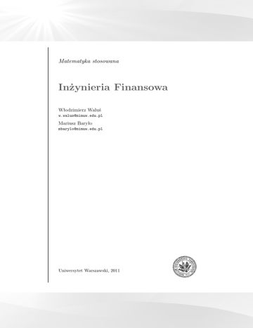Matematyka stosowana Inżynieria Finansowa Włodzimierz Waluś [email protected] Mariusz Baryło [email protected] Uniwersytet Warszawski, 2011 Streszczenie. Wykład przedstawia podstawowe instrumenty finansowe: kontrakty na przyszłą stopę procentową, kontrakty wymiany procentowej, kontrakty forward i futures, kontrakty opcyjne – opcje waniliowe, wybrane opcje egzotyczne oraz opcje na stopę procentową. Dla każdego z tych instrumentów przedstawione są: struktura instrumentu i jego zastosowania, metoda wyceny oraz analiza wrażliwości – z uwzględnieniem praktyki rynkowej. Wersja internetowa wykładu: http://mst.mimuw.edu.pl/lecture.php?lecture=ifi (może zawierać dodatkowe materiały) Niniejsze materiały są dostępne na licencji Creative Commons 3.0 Polska: Uznanie autorstwa — Użycie niekomercyjne — Bez utworów zależnych. c W.Waluś, M.Baryło, Uniwersytet Warszawski, Wydział Matematyki, Informatyki i Mechaniki, 2011. Copyright Niniejszy plik PDF został utworzony 13 kwietnia 2011. Projekt współfinansowany przez Unię Europejską w ramach Europejskiego Funduszu Społecznego. Skład w systemie LATEX, z wykorzystaniem m.in. pakietów beamer oraz listings. Szablony podręcznika i prezentacji: Piotr Krzyżanowski; koncept: Robert Dąbrowski. Spis treści 1. Wprowadzenie . . . . . . . . . . . . . 1.1. Wstęp i podstawowe pojęcia . . . 1.2. Zasadnicze kategorie instrumentów 1.3. Rynki finansowe . . . . . . . . . . 1.4. Zmienne rynkowe – ceny . . . . . Zagadnienia i zadania na Ćwiczenia . . . . . . . . . . . . . . . . . . . . . . . . . . . . . . . . . . . . . . . . . . . . . . . . . . . . . . . . . . . . . . . . . . . . . . . . . . . . . . . . . . . . . . . . . . . . . . . . . . . 6 . 6 . 6 . 8 . 10 . 12 2. Stopy procentowe . . . . . . . . . . . . . . . . . . . . . . . . . . 2.1. Podstawowe stopy procentowe . . . . . . . . . . . . . . . . . 2.2. Obligacje zerokuponowe, czynniki dyskontowe . . . . . . . . 2.3. Wartość strumienia przepływów pieniężnych . . . . . . . . . 2.4. Zerokuponowe stopy procentowe (spotowe, natychmiastowe) . 2.5. Struktura stóp procentowych . . . . . . . . . . . . . . . . . . 2.6. Chwilowa stopa natychmiastowa . . . . . . . . . . . . . . . . 2.7. Stopy forward . . . . . . . . . . . . . . . . . . . . . . . . . . 2.8. Chwilowa stopa forward . . . . . . . . . . . . . . . . . . . . . Zagadnienia i zadania na Ćwiczenia . . . . . . . . . . . . . . . . . . . . . . . . . . . . . . . . . . . . . . . . . . . . . . . . . . . . . . . . . . . . . . . . . . . . . . . . . . . . . . . . . . . . . . . . . . . . . . . . . . . . . . . . . . . . . . . . . . . . . . . . . . . . . . . . . . . . . . . . . . . . . . . . . . . . . . . . . . . . . . . . . . . . . . . . . . . . . . . . . 16 16 17 18 18 20 21 21 23 24 3. Kontrakt FRA . . . . . . . . . . . . . . . . . . . . . . . . . . . . . . . 3.1. Struktura kontraktu FRA . . . . . . . . . . . . . . . . . . . . . . . 3.2. Wartość kontraktu FRA . . . . . . . . . . . . . . . . . . . . . . . . 3.3. Stopa kontraktu FRA . . . . . . . . . . . . . . . . . . . . . . . . . 3.4. Wyznaczanie wartości kontraktu FRA na podstawie stopy forward 3.5. FRA jako instrument zabezpieczający . . . . . . . . . . . . . . . . 3.6. Reprezentacja FRA w postaci strumienia pieniężnego . . . . . . . 3.7. Aspekty praktyczne . . . . . . . . . . . . . . . . . . . . . . . . . . Zagadnienia i zadania na Ćwiczenia . . . . . . . . . . . . . . . . . . . . . . . . . . . . . . . . . . . . . . . . . . . . . . . . . . . . . . . . . . . . . . . . . . . . . . . . . . . . . . . . . . . . . . . . . . . . . . . . . . . . . . . . . . . . . . . . . . . . . . . . . . . . . . . . . . . . . . . . . 29 29 30 31 32 32 33 33 33 4. Kontrakty IRS / CCIRS . . . . . . . . . . . . . . . . 4.1. Struktura kontraktów wymiany stóp procentowych 4.2. Wycena kontraktu IRS/CCIRS . . . . . . . . . . . 4.3. Standardowy kontrakt IRS . . . . . . . . . . . . . 4.4. Bootstrapping czynników dyskontowych . . . . . . 4.5. Własności stóp kontraktów IRS . . . . . . . . . . . Zagadnienia i zadania na Ćwiczenia . . . . . . . . . . . . . . . . . . . . . . . . . . . . . . . . . . . . . . . . . . . . . . . . . . . . . . . . . . . . . . . . . . . . . . . . . . . . . . . . . . . . . . . . . . . . . . . . . . . . . . . . . . . . . . . . . . . . . . . . . . . . . . . . . . . . . . . . . . . . . . . . . . . . . . . . . . . . . . . . . . . . . 36 36 38 41 43 45 45 5. Kontrakty Forward i Futures . . 5.1. Struktura kontraktów Forward 5.2. Kontrakty Futures . . . . . . . Zagadnienia i zadania na Ćwiczenia . . . . . . . . . . . . . . . . . . . . . . pochodnych . . . . . . . . . . . . . . . . . . . . . . . . . . . . . . . . . . . . . . . . . . . . . . . . . . . . . . . . . . . . . . . . . . . . . . . . . . . . . . . . . . . . . . . . . . . . . . . . . . . . . . . . . . . . . . . . . . . . . . . . . . . . . . . . . . . . . . . . . . . . . . . . . . . . . . . . . . . . . . . . . . . . . . . . . . . . . . . . . . . . . . . . . . . 48 48 54 57 6. Kontrakty opcyjne . . . . . . . . . . . . . . . . . 6.1. Kontrakty opcyjne . . . . . . . . . . . . . . . . 6.2. Opcje waniliowe . . . . . . . . . . . . . . . . . 6.3. Opcje egzotyczne . . . . . . . . . . . . . . . . . 6.4. Własności opcji waniliowych . . . . . . . . . . 6.5. Parytet opcji kupna/sprzedaży . . . . . . . . . 6.6. Ograniczenia na wartość opcji . . . . . . . . . 6.7. Wczesne wykonanie w opcjach amerykańskich . . . . . . . . . . . . . . . . . . . . . . . . . . . . . . . . . . . . . . . . . . . . . . . . . . . . . . . . . . . . . . . . . . . . . . . . . . . . . . . . . . . . . . . . . . . . . . . . . . . . . . . . . . . . . . . . . . . . . . . . . . . . . . . . . . . . . . . . . . . . . . . . . . . . . . . . . . . . . . . . . . . . . . . . . . . . . . . . . . . . . . . . . . . . . . . . 59 59 60 60 61 61 63 63 c W.Waluś, M.Baryło, Uniwersytet Warszawski, 2011. Inżynieria Finansowa 6.8. Zależność wartości opcji europejskiej 6.9