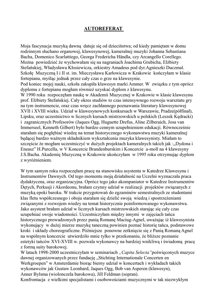 AUTOREFERAT Moja fascynacja muzyką dawną datuje się od dzieciństwa; od kiedy pamiętam w domu rodzinnym słuchano organowej, klawesynowej, kameralnej muzyki Johanna Sebastiana Bacha, Domenico Scarlattiego, Georga Fredericha Händla, czy Arcangello Corellego. Można powiedzieć że wychowałam się na nagraniach Joachima Grubicha, Elżbiety Stefańskiej, Władysława Kłosiewicza, orkiestry Amadeus pod dyr.Agnieszki Duczmal. Szkołę Muzyczną I i II st. im. Mieczysława Karłowicza w Krakowie kończyłam w klasie fortepianu, myśląc jednak przez cały czas o grze na klawesynie. Pod koniec mojej nauki, szkoła zakupiła klawesyn marki Ammer. W związku z tym oprócz dyplomu z fortepianu mogłam również uzyskać dyplom z klawesynu. W 1990 roku rozpoczęłam naukę w Akademii Muzycznej w Krakowie w klasie klawesynu prof. Elżbiety Stefańskiej. Cały okres studiów to czas intensywnego rozwoju warsztatu gry na tym instrumencie, oraz czas wręcz zachłannego poznawania literatury klawesynowej XVII i XVIII wieku. Udział w klawesynowych konkursach w Warszawie, Pradze(półfinał), Lipsku, oraz uczestnictwo w licznych kursach mistrzowskich u polskich (Leszek Kędracki) i zagranicznych Profesorów (Jaques Ogg, Huguette Drefus, Aline Zilberaich, Josa van Immerseel, Kenneth Gilbert) było bardzo cennym uzupełnieniem edukacji. Równocześnie starałam się pogłębiać wiedzę na temat historycznego wykonawstwa muzyki kameralnej będącej bardzo ważnym składnikiem wykształcenia muzyka klawesynisty. Miałam to szczęście że mogłam uczestniczyć w dużych projektach kameralnych takich jak :„Dydona i Eneasz” H.Purcella, w V Koncercie Brandenburskim i Koncercie a-moll na 4 klawesyny J.S.Bacha. Akademię Muzyczną w Krakowie ukończyłam w 1995 roku otrzymując dyplom z wyróżnieniem. W tym samym roku rozpoczęłam pracę na stanowisku asystenta w Katedrze Klawesynu i Instrumentów Dawnych. Od tego momentu moją działalność na Uczelni wyznaczała praca dydaktyczna, oraz organizacyjna. Oprócz tego jako akompaniator w Katedrze Instrumentów Dętych, Perkusji i Akordeonu, brałam czynny udział w realizacji projektów związanych z muzyką epoki baroku. W trakcie przygotowań do egzaminów semestralnych ze studentami klas fletu współczesnego i oboju starałam się dzielić swoją wiedzą i spostrzeżeniami związanymi z rozwojem wiedzy na temat historycznie poinformowanego wykonawstwa. Jako asystent brałam udział w licznych kursach mistrzowskich starając się cały czas uzupełniać swoje wiadomości. Uczestniczyłam między innymi w zajęciach tańca historycznego prowadzonych przez panią Romanę Maciug-Agnel, uważając iż klawesynista wykonujący w dużej mierze muzykę taneczną powinien poznać historię tańca, podstawowe kroki i układy choreograficzne. Późniejsze ponowne zetknięcie się z Panią Romaną Agnel na wspólnym koncercie utwierdziło mnie tylko w przekonaniu, że bliższe poznanie estetyki tańców XVI-XVIII w. pozwala wykonawcy na bardziej wnikliwą i świadomą pracę z formą suity barokowej. W latach 1998-2000 uczestniczyłam w seminariach „Capita Selecta”poświęconych muzyce dawnej organizowanych przez fundację „Stichting Internationale Concerten en Werkgroepen” w Amsterdamie biorąc bierny udział w koncertach i wykładach takich wykonawców jak Gustaw Leonhard, Jaques Ogg, Bob van Asperen (klawesyn), Anner Bylsma (wiolonczela barokowa), Jill Feldman (sopran). Konfrontacja z wielkimi specjalistami i osobowościami muzycznymi w tak niezwykłym mieście jak Amsterdam było niebywałym doświadczeniem. Kwalifikacje I stopnia sztuki muzycznej, w zakresie dyscypliny artystycznej instrumentalistyka uzyskałam na podstawie przedstawionej pracy w postaci recitalu w 2003 roku. W latach 2003-2010 pełniłam również funkcję Prezesa Polskiego Towarzystwa Bachowskiego w Krakowie, obecnie jestem członkiem komisji rewizyjnej. W 1996 roku zwieńczeniem festiwalu „ I Dni Bachowskie” na którym wykonywane były wszystkie koncerty klawesynowe Johanna Sebastiana Bacha było nagranie płyty z wybranymi koncertami. Opiekunem tego artystycznego przedsięwzięcia była prof. Elżbieta Stefańska która również zarejestrowała jeden z koncertów Kompozytora. Wykonawcami solistami byli młodzi muzycy-studenci i absolwenci Akademii Muzycznej w Krakowie. Płyta ta była nominowana do nagrody Fryderyka w 1997 roku w kategorii muzyka klasyczna. W tym samym roku otrzymałam też nagrodę Fundacji Kultury Polskiej (dla utalentowanego młodego artysty) za „błyskotliwy i rokujący duże nadzieje debiut muzyczny”. Przez następne lata moja współpraca z prof. Elżbietą Stefańską przeniosła się również na grunt działalności artystycznej. Pani Profesor zapraszała mnie do wspólnych koncertów na znaczących polskich festiwalach m.in. na Zamku Królewskim w Warszawie, Studiu Polskiego Radia w Katowicach, Międzynarodowym Festiwalu w Wygiełzowie, Muzyka zaklęta w Drewnie, na których prezentowałyśmy wielokrotnie koncerty na 2 i 3 klawesyny Johann Sebastiana Bacha. Miałam również zaszczyt brania udziału w koncercie poświęconym pamięci Jej matki Haliny Czerny-Stefańskiej, który się odbył w auli Akademii Muzycznej im. Fryderyka Chopina w Warszawie. W 2007 zostałam zaproszona przez Panią Profesor do udział w nagraniu utworów Johanna Sebastiana Bacha dla japońskiej firmy IMC. Opis tego przedsięwzięcia umieszczam w dalszej części autoreferatu. Warto wspomnieć iż wspólne granie z tak znakomitą polską klawesynistką dawało mi ogromną satysfakcję i znacząco wpłynęło na mój rozwój muzyczny. Od zawsze fascynowała mnie twórczość Johanna Sebastiana Bacha. Przeglądając mój repertuar i działalność koncertową można zauważyć że właśnie utwory tego kompozytora wykonywałam najczęściej. Fascynacja muzyką lipskiego Kantora wpłynęła na obecne moje zainteresowanie twórczością Johanna Jacoba Frobergera muzyka c