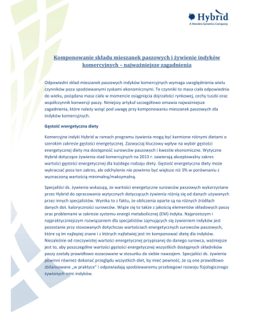 Komponowanieskładumieszanekpaszowychiżywienieindyków komercyjnych–najważniejszezagadnienia Odpowiedni skład mieszanek paszowych indyków komercyjnych wymaga uwzględnienia wielu czynników poza spodziewanymi zyskami ekonomicznymi. Te czynniki to masa ciała odpowiednia do wieku, pożądana masa ciała w momencie osiągnięcia dojrzałości rynkowej, cechy tuszki oraz współczynnik konwersji paszy. Niniejszy artykuł szczegółowo omawia najważniejsze zagadnienia, które należy wziąć pod uwagę przy komponowaniu mieszanek paszowych dla indyków komercyjnych. Gęstość energetyczna diety Komercyjne indyki Hybrid w ramach programu żywienia mogą być karmione różnymi dietami o szerokim zakresie gęstości energetycznej. Zazwyczaj kluczowy wpływ na wybór gęstości energetycznej diety ma dostępność surowców paszowych i kwestie ekonomiczne. Wytyczne Hybrid dotyczące żywienia stad komercyjnych na 2013 r. zawierają akceptowalny zakres wartości gęstości energetycznej dla każdego rodzaju diety. Gęstość energetyczna diety może wykraczać poza ten zakres, ale odchylenie nie powinno być większe niż 3% w porównaniu z wyznaczoną wartością minimalną/maksymalną. Specjaliści ds. żywienia wskazują, że wartości energetyczne surowców paszowych wykorzystane przez Hybrid do opracowania wytycznych dotyczących żywienia różnią się od danych używanych przez innych specjalistów. Wynika to z faktu, że obliczenia oparte są na różnych źródłach danych dot. kaloryczności surowców. Wiąże się to także z jakością elementów składowych paszy oraz problemami w zakresie systemu energii metabolicznej (EM) indyka. Najprostszym i najpraktyczniejszym rozwiązaniem dla specjalistów zajmujących się żywieniem indyków jest pozostanie przy stosowanych dotychczas wartościach energetycznych surowców paszowych, które są im najlepiej znane i z których najłatwiej jest im komponować dietę dla indyków. Niezależnie od rzeczywistej wartości energetycznej przypisanej do danego surowca, ważniejsze jest to, aby poszczególne wartości gęstości energetycznej wszystkich dostępnych składników paszy zostały prawidłowo oszacowane w stosunku do siebie nawzajem. Specjaliści ds. żywienia powinni również dokonać przeglądu wszystkich diet, by mieć pewność, że są one prawidłowo zbilansowane „w praktyce” i odpowiadają spodziewanemu przebiegowi rozwoju fizjologicznego żywionych nimi indyków. Poziom zawartości surowego białka i aminokwasów Mieszanki paszowe dla indyków mogą być odpowiednio zbilansowane przy użyciu całkowitej lub strawnej (potencjalnie dostępnej do wykorzystania przez ptaka) zawartości aminokwasów. Układanie mieszanki paszowej ze strawnymi aminokwasami jest bardziej pożądane, gdy jakość surowca paszowego jest słaba. Wytyczne Hybrid dotyczące żywienia na 2013 r. szczegółowo przedstawiają stosunek zawartości poszczególnych aminokwasów do zawartości lizyny; te dane powinny być interpretowane jako minimalne wartości proporcjonalne względem lizyny, chociaż w praktyce wskazane może być nieznaczne zmniejszenie niektórych proporcji. Jeśli mieszanki paszowe bilansowane są argininą, lizyną, metioniną, metioniną i cysteiną, treoniną i waliną, możliwe jest obniżenie zawartości surowego białka poniżej wartości podanych w wytycznych o 0,5‐1,0% (tj. od 27,5% do 26,5%) bez negatywnego wpływu na wyniki. Nie można ignorować stężenia izoleucyny oraz tryptofanu w mieszankach paszowych, ale powinny być one ograniczające tylko wtedy, gdy w mieszance dla indyków znajdują się pewne surowce (izoleucyna w przypadku mączki z krwi oraz tryptofan w przypadku podestylacyjnego suszu zbożowego). Należy zawsze starać się maksymalizować użycie w mieszankach paszowych tych syntetycznych aminokwasów, które mogą w bezpieczny sposób obniżyć stężenie surowych białek w paszy oraz zmniejszyć zawilgocenie ściółki i stężenie amoniaku w indyczniku. Rodzaj syntetycznej lizyny wykorzystywanej jako składnik paszy może mieć wpływ na zawartość wilgoci w ściółce, a także na łatwość komponowania mieszanek paszowych. Dostępne typy lizyny syntetycznej to lizyna płynna, siarczan lizyny lub chlorowodorek lizyny. W celu uzyskania suchszej ściółki najłatwiej jest użyć podczas układania składu mieszanek paszowych płynnej lizyny jako syntetycznego źródła lizyny; podobne efekty daje także zastosowanie siarczanu lizyny lub chlorowodorku lizyny. Maksymalny bezpieczny poziom lizyny w paszy pełnoporcjowej to w przypadku płynnej lizyny (50% lizyny) 0,63%, siarczanu lizyny (50,7% lizyny) – maksymalnie 0,62%, a chlorowodorku lizyny (78,8% lizyny) – maksymalnie 0,40%. Dobry początek Wielu hodowców uważa, że mieszanki paszowe powinny być układane w taki sposób, by umożliwić powolny wzrost na wczesnym etapie i uzyskać silne i dobrze rozwinięte nogi. Jest to niesłuszne założenie w przypadku indyków Hybrid selekcjonowanych genetycznie w kierunku doskonałych nóg. Właśnie z tego powodu już od samego początku zwierzęta powinny być żywione paszami umożliwiającymi maksymalny przyrost masy ciała. Dokonano przeglądu wartości stężenia witamin i pierwiastków śladowych paszy na potrzeby Wytycznych dotyczących żywienia na rok 2013. Zawartość witamin i pierwiastków śladowych powinna leżeć w przedziałach wskazanych w wytycznych, aby możliwa była jak najlepsza realizacja potencjału genetycznego indyków. Bardzo ważne jest również, aby w procesie obróbki pasza nie została przegrzana, bo prowadzi to do zniszczenia witamin, a w rezultacie do gorszego startu indyków. Jakość granulatu (lub kruszonki), a w szczególności pierwsza pasza, ma podstawowe znaczenie dla dobrego startu piskląt. Zbyt rozdrobniona mieszanka lub słaba wytrzymałość granulatu/kruszonki może prowadzić do wiszącego wola na wczesnym etapie rozwoju ptaków. Informacje dotyczące