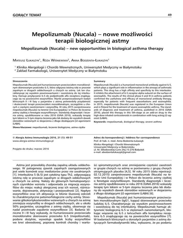 GORĄCY TEMAT 49 Mepolizumab (Nucala) – nowe możliwości terapii biologicznej astmy Mepolizumab (Nucala) – new opportunities in biological asthma therapy Mateusz Łukaszyk1, Róża Wiśniewska2, Anna Bodzenta-Łukaszyk1 1 2 Klinika Alergologii i Chorób Wewnętrznych, Uniwersytet Medyczny w Białymstoku Zakład Farmakologii, Uniwersytet Medyczny w Białymstoku Streszczenie Summary Mepolizumab (Nucala) jest humanizowanym przeciwciałem monoklonalnym skierowanym przeciwko IL-5, która odgrywa istotną rolę w procesie zapalnym w drogach oddechowych u chorych na astmę. Lek ten charakteryzuje się wysokim powinowactwem i swoistością do tej interleukiny. Hamuje przyłączanie IL-5 do podjednostki alfa receptora znajdującego się na powierzchni eozynofilów. Wyniki przeprowadzonych badań klinicznych II i III fazy u pacjentów z astmą potwierdziły przydatność i skuteczność terapii przeciwciałem monoklonalnym, szczególnie u chorych z częstymi zaostrzeniami i eozynofilią. W roku 2015 zarejestrowano mepolizumab (Nucala) na terenie Unii Europejskiej i w Polsce do leczenia astmy ciężkiej o fenotypie eozynofilowym. Standardy diagnostyki i leczenia astmy, opublikowane w roku 2016 (GINA 2016), wskazały terapię tym lekiem w 5-tym stopniu leczenia jako lek dodany do wysokich dawek steroidów wziewnych w skojarzeniu z długo działającymi β2-agonistami (LABA). Mepolizumab (Nucala) is a humanized monoclonal antibody against IL-5, which plays a significant role in inflammation in the airways of asthmatic patients. This drug has a high affinity and specificity to this interleukin. It inhibits the attachment of IL-5 receptor alpha subunit on the surface of eosinophils. The results of the clinical phase II and III in asthma patients confirmed the usefulness and efficacy of monoclonal antibody therapy, especially for patients with frequent exacerbations and eosinophilia. In 2015, mepolizumab (Nucala) was registered in the European Union and in Poland for the treatment of severe eosinophilic asthma. The standards of diagnosis and treatment of asthma, published in 2016 (GINA 2016), placed this therapy in this 5th-stage as an add-on drug to the high-dose inhaled corticosteroids in combination with long acting β2-agonist (LABA). Keywords: mepolizumab, biological therapy, severe asthma Słowa kluczowe: mepolizumab, leczenie biologiczne, astma ciężka © Alergia Astma Immunologia 2016, 21 (1): 49-51 www.alergia-astma-immunologia.pl Przyjęto do druku: marzec 2016 Astma jest przewlekłą chorobą zapalną układu oddechowego. W patogenezę zjawisk zapalnych zaangażowanych jest wiele komórek oraz mediatorów przez nie uwalnianych [1]. Interleukina 5 (IL-5) jest cytokiną typu Th2, odgrywającą istotną rolę w procesie zapalnym w drogach oddechowych u chorych na astmę. Należy do głównych hematopoetycznych czynników wzrostu i odpowiada za migrację eozynofilów do miejsc reakcji alergicznej oraz ich wzrost, różnicowanie, dojrzewanie, aktywację i przeżywalność [2]. Napływ eozynofilów oraz ich aktywacja w błonie śluzowej oskrzeli to charakterystyczne patomorfologiczne cechy astmy. Stosowanie glikokortykosteroidów wziewnych u chorych na astmę zmniejsza eozynofilię w drogach oddechowych, ale u około 50% pacjentów, szczególnie z astmą ciężką, obserwuje się nadal przetrwałe zapalenie eozynofilowe [3]. Badania kliniczne II i III fazy wykazały, że humanizowane przeciwciało monoklonalne skierowane przeciwko IL-5 (mepolizumab), podane dożylnie, wywołuje spadek liczby eozynofilów we krwi obwodowej, poprawę kontroli choroby i warto- Adres do korespondencji / Address for correspondence Prof. dr hab. n. med. Anna Bodzenta-Łukaszyk Klinika Alergologii i Chorób Wewnętrznych Uniwersytet Medyczny w Białymstoku ul. M. Skłodowskiej-Curie 24a,15-276 Białystok e-mail: [email protected] ści spirometrycznych oraz zmniejszenie częstości zaostrzeń w grupie chorych na astmę w porównaniu z grupą chorych otrzymujących placebo [4,5]. W roku 2015 (data rejestracji: 02.12.2015) zarejestrowano mepolizumab (Nucala) na terenie Unii Europejskiej i w Polsce do leczenia astmy ciężkiej o fenotypie eozynofilowym. Standardy diagnostyki i leczenia astmy opublikowane w roku 2016 (GINA 2016) wskazały terapię tym lekiem w 5-tym stopniu leczenia jako lek dodany do wysokich dawek steroidów wziewnych w skojarzeniu z długo działającymi β2-agonistami (LABA) [6]. Mepolizumab (Nucala) jest humanizowanym przeciwciałem monoklonalnym (IgG1, kappa) skierowanym przeciwko ludzkiej IL-5. Charakteryzuje się wysokim powinowactwem i swoistością do tej interleukiny. Mepolizumab hamuje aktywność biologiczną IL-5 w stężeniach nanomolarnych, blokując wiązanie się IL-5 z łańcuchem alfa kompleksu receptora IL-5 znajdującego się na powierzchni eozynofilów [7]. W badaniach klinicznych u dorosłych pacjentów z astmą dotyczących farmakodynamiki leku, wykazano, że po podaniu 50 Alergia Astma Immunologia 2016, 21 (1): 49-51 podskórnym mepolizumabu w dawkach od 12,5 do 250 mg lub 75 mg dożylnie co 4 tygodnie przez 12 tygodni, liczba eozynofilów we krwi obwodowej istotnie się zmniejszyła w porównaniu z grupą pacjentów otrzymujących placebo [8]. Mepolizumab podawany dożylnie w dawce 750 mg co 4 tygodnie przez 3 miesiące u pacjentów z astmą łagodną, istotnie statystycznie obniżał liczbę eozynofilów we krwi obwodowej, drogach oddechowych i szpiku (odpowiednio 100, 55 i 52% w stosunku do wartości wyjściowych) [9]. Wyniki przeprowadzonych badań dotyczących właściwości farmakokinetycznych mepolizumabu wykazały, że po podaniu podskórnym zdrowym ochotnikom lub pacjentom z astmą, lek był wolno wchłaniany – Tmax od 4 do 8 dni. Po jednokrotnym podaniu podskórnym w brzuch, udo lub ramię zdrowym ochotnikom, całkowita biodostępność mepolizumabu wynosiła odpowiednio 64,71% i 75%. U pacjentów z astmą całkowita biodostępność mepolizumabu podawanego podskórn