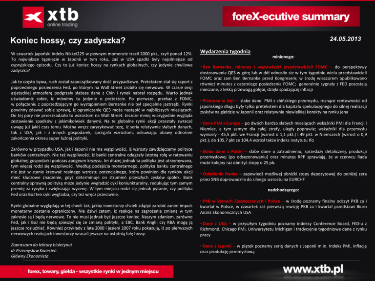 24.05.2013 Koniec hossy, czy zadyszka? W czwartek japoński indeks Nikkei225 w pewnym momencie tracił 2000 pkt., czyli ponad 12%. To największe tąpnięcie w Japonii w tym roku, zaś w USA spadki były najsilniejsze od cypryjskiego epizodu. Czy to już koniec hossy na rynkach globalnych, czy jedynie chwilowa zadyszka? Jak to często bywa, ruch został zapoczątkowany dość przypadkowo. Pretekstem stał się raport z poprzedniego posiedzenia Fed, po którym na Wall Street zrobiło się nerwowo. W czasie sesji azjatyckiej atmosferę podgrzały słabsze dane z Chin i rynek nabrał rozpędu. Warto jednak uświadomić sobie, iż mówimy tu jedynie o pretekście. Po pierwsze, przekaz z FOMC, w połączeniu z poprzedzającym go wystąpieniem Bernanke nie był specjalnie jastrzębi. Rynki powinny zdawać sobie sprawę, iż ograniczenie QE3 może nastąpić w najbliższych miesiącach. Do tej pory nie przeszkadzało to wzrostom na Wall Street. Jeszcze mniej wiarygodnie wygląda zestawienie spadków z jakimikolwiek danymi. Na te globalne rynki akcji przestały zwracać uwagę już jakiś czas temu. Można wręcz zaryzykować tezę, iż seria relatywnie słabych danych, tak z USA, jak i z innych gospodarek, sprzyjała wzrostom, odsuwając obawy odnośnie zakończenia okresu super luźnej polityki. Zarówno w przypadku USA, jak i Japonii nie ma wątpliwości, iż wzrosty zawdzięczamy polityce banków centralnych. Nie też wątpliwości, iż banki centralne odegrały istotną rolę w ratowaniu globalnej gospodarki podczas apogeum kryzysu. Im dłużej jednak ta polityka jest utrzymywana, tym więcej rodzi się wątpliwości. Według podejścia monetarnego, polityka banku centralnego nie jest w stanie kreować realnego wzrostu potencjalnego, który powinien dla rynków akcji mieć kluczowe znaczenie, gdyż determinuje on strumień przyszłych zysków spółek. Bank centralny sprawną polityką może jedynie wygładzić cykl koniunkturalny, redukując tym samym premię za ryzyko i zwiększając wycenę. W tym miejscu rodzi się jednak pytanie, czy polityka Fed oraz BoJ ten cykl wygładza, czy też wręcz przeciwnie. Rynki globalne wyglądają w tej chwili tak, jakby inwestorzy chcieli zdążyć zarobić zanim impuls monetarny zostanie ograniczony. Nie dziwi zatem, iż reakcje na zagrożenie zmianą w tym zakresie są i będą nerwowe. To nie musi jednak być jeszcze koniec. Naszym zdaniem, zarówno Fed, jak i BoJ nie będą spieszyć się ze zmianą polityki, a EBC, Bank Anglii czy RBA mogą ją jeszcze rozluźniać. Również przykłady z lata 2000 i jesieni 2007 roku pokazują, iż po pierwszych nerwowych reakcjach inwestorzy wracali jeszcze na ostatnią falę hossy. Zapraszam do lektury biuletynu! dr Przemysław Kwiecień Główny Ekonomista Wydarzenia tygodnia minionego: • Ben Bernanke, minutes i wypowiedzi przedstawicieli FOMC – do perspektywy dostosowania QE3 w górę lub w dół odnosiło sie w tym tygodniu wielu przedstawicieli FOMC oraz sam Ben Bernanke przed Kongresem; w środę wieczorem opublikowano również minutes z ostatniego posiedzenia FOMC; generalnie sygnały z FED pozostają mieszane, z lekką przewagą gołębi, dzięki spadającej inflacji • Przecena w Azji – słabe dane PMI z chińskiego przemysłu, rosnące rentowności od japońskiego długu były tylko pretekstem dla kapitału spekulacyjnego do silnej realizacji zysków na giełdzie w Japonii oraz relatywnie niewielkiej korekty na rynku jena • Dane PMI z Europy – po dwóch bardzo słabych miesiącach wskaźniki PMI dla Francji i Niemiec, a tym samym dla całej strefy, uległy poprawie; wskaźniki dla przemysłu wyniosły - 45,5 pkt. we Francji (wzrost o 1,1 pkt.) i 49 pkt. w Niemczech (wzrost o 0,9 pkt.); do 105,7 pkt ze 104,4 wzrósł także indeks instytutu Ifo • Słabe dane z Polski – słabe dane o zatrudnieniu, sprzedaży detalicznej, produkcji przemysłowej (po odsezonowaniu) oraz minutes RPP sprawiają, że w czerwcu Rada może kolejny raz obniżyć stopy o 25 pb. • Osłabienie franka – zapowiedź możliwej obniżki stopy depozytowej do poniżej zera przez SNB doprowadziła do silnego wzrostu na EURCHF nadchodzącego: • PKB w Stanach Zjednoczonych i Polsce – w środę poznamy finalny odczyt PKB za I kwartał w Polsce, w czwartek zaś pierwszą rewizję PKB za I kwartał przedstawi Biuro Analiz Ekonomicznych USA • Dane z USA – w przyszłym tygodniu poznamy indeksy Conference Board, FED-u z Richmond, Chicago PMI, Uniwersytetu Michigan i tradycyjnie tygodniowe dane z rynku pracy • Dane z Japonii – w piątek poznamy serię danych z Japonii m.in. Indeks PMI, inflację oraz produkcję przemysłową Temat tygodnia: wzrost zmienności sprzyja wybiciom To był tydzień dużej zmienności na wielu rynkach. Nie sposób było nie zauważyć tego, co wydarzyło się w nocy ze środy na czwartek. Japoński indeks Nikkei zanurkował o ponad 7%,. Skala korekty jest i tak relatywnie niewielka (po tym jak od listopada ubiegłego roku obserwowaliśmy wzrost wartości indeksu o prawie 80%), ale z pewnością jej dynamika wzbudziła spore zainteresowanie inwestorów, pokazując, co może się stać, kiedy pęknie bańka na „napompowanych” indeksach giełdowych. Uczestnicy rynku zadają sobie obecnie kluczowe pytanie, czy jest to już początek większej korekty, która będzie kontynuowana w nadchodzących dniach/tygodniach, czy być może było to jednorazowe wydarzenie. W jednym i drugim przypadku ruchy indeksów giełdowych mogą przełożyć się także na inne rynki, np. na rynek walutowy lub surowcowy. Warto zwrócić uwagę, że część par walutowych oraz surowców znajduje się przy bardzo istotnych miejscach, stąd też można rozważyć dwa podejścia (o czym będziemy pisać szczegółowo w części dotyczącej analizy poszczególnych instrumentów). Pierwsza możliwość, to szukanie końca danego ruchu i inwestowanie pod odbicie (np. pod umocnienie euro względem dolara bądź też dolar